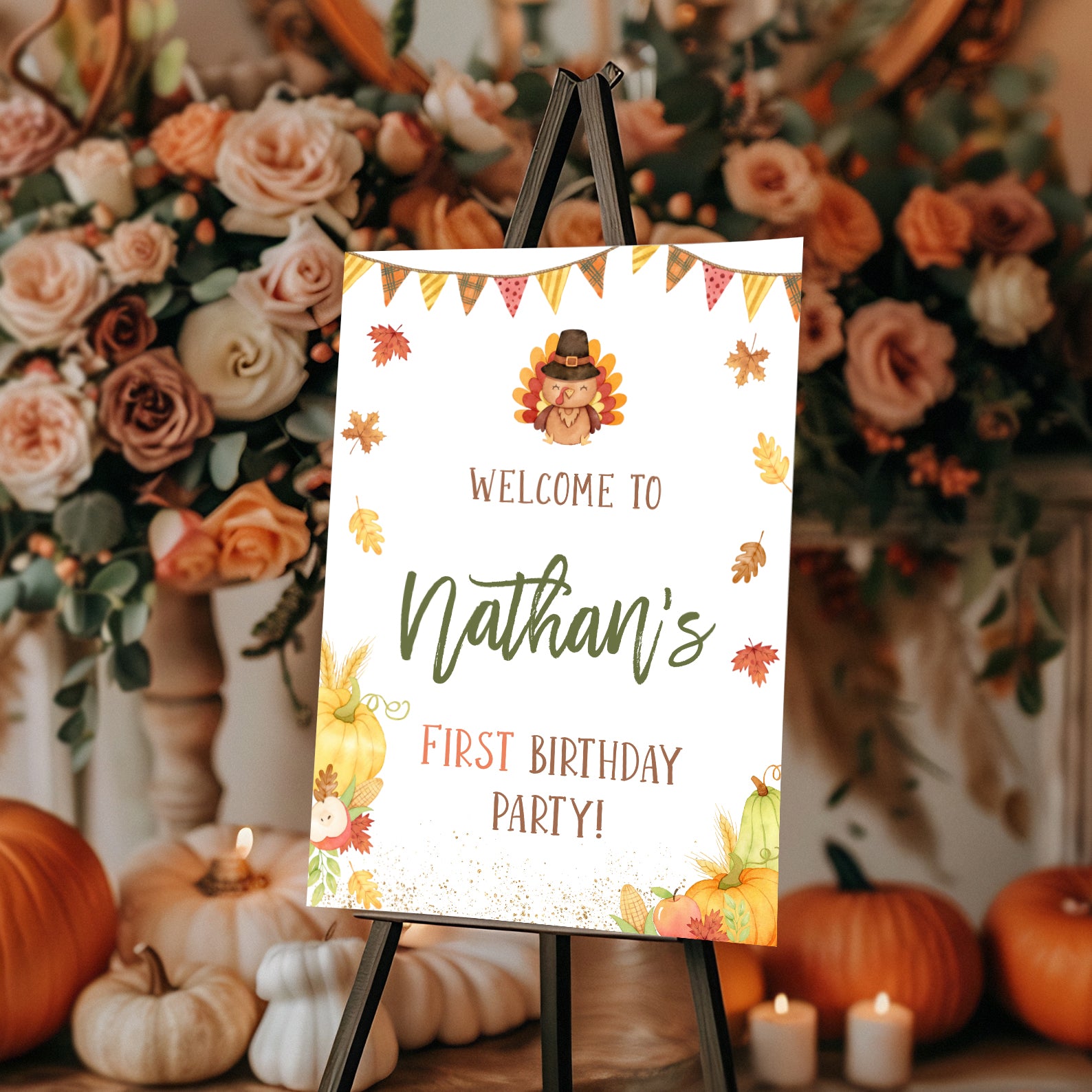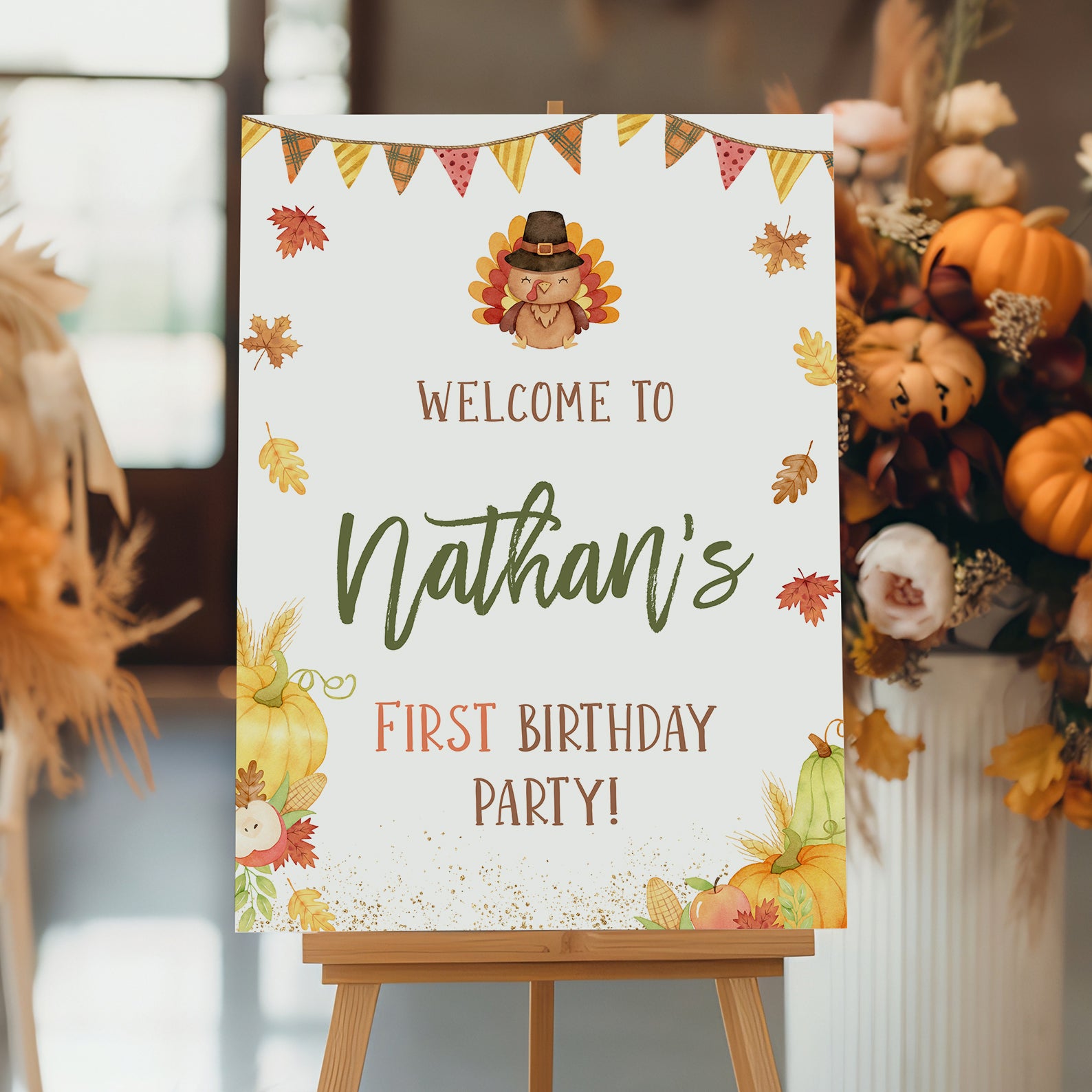 - Purchase this Little Turkey Is One Fall Birthday Welcome Sign with Autumn Harvest template