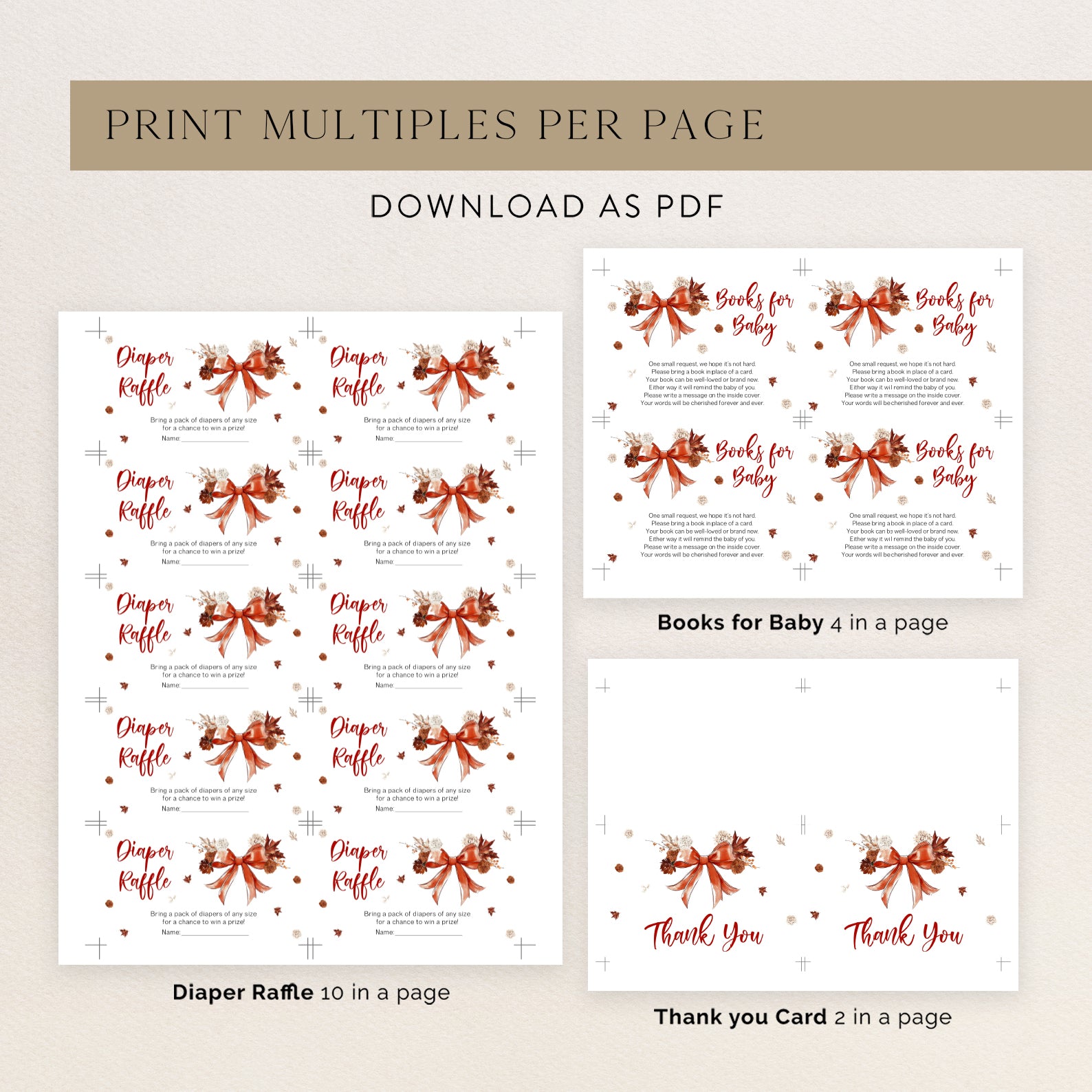 Celebrate your little one with this fall-themed baby shower bundle! Featuring a red watercolor ribbon, warm autumn florals, and falling leaves, this set includes a digital invitation, mobile invite, diaper raffle card, books for baby, and thank you card. Beautifully designed and easy to personalize, it’s perfect for creating a heartfelt and festive gathering your guests will remember.