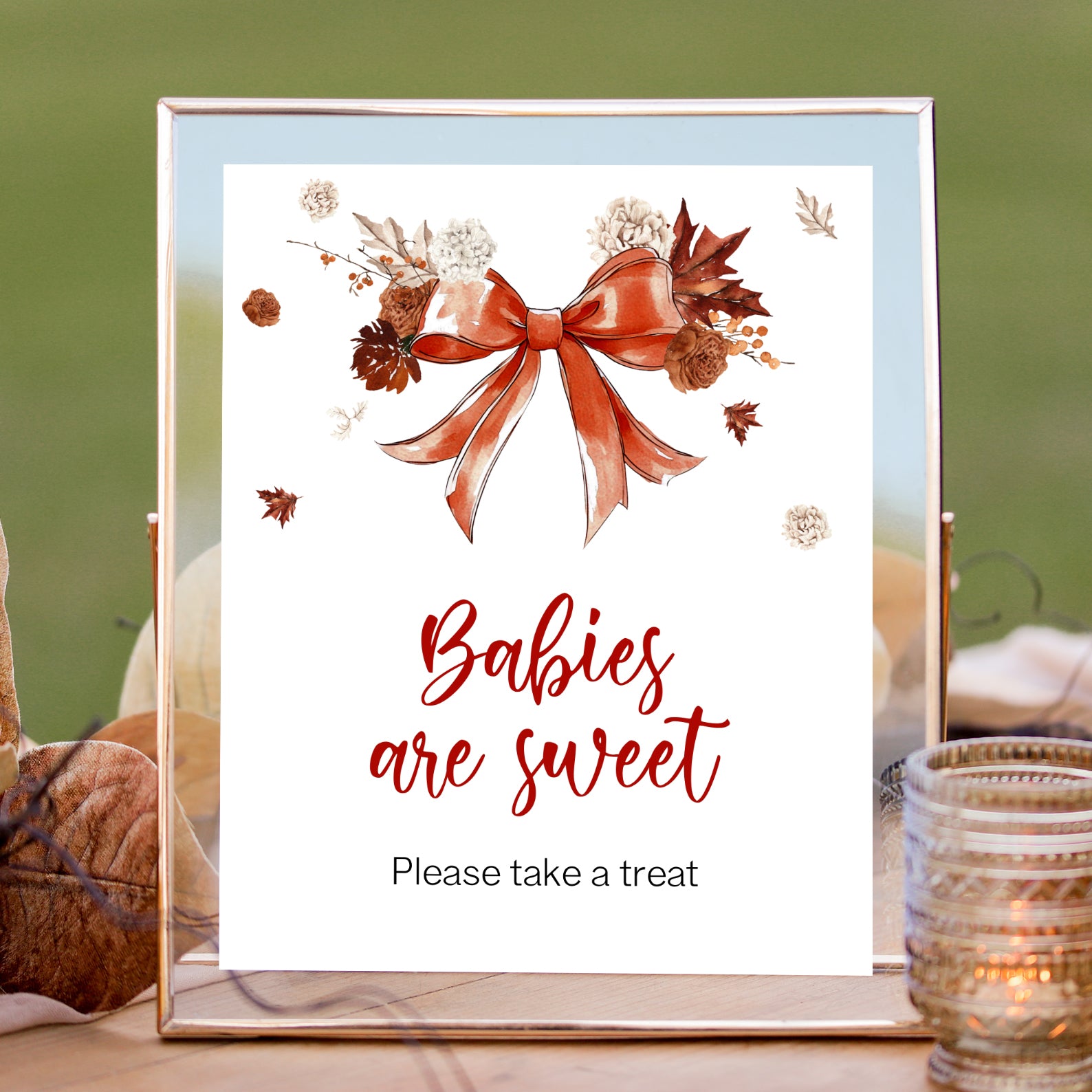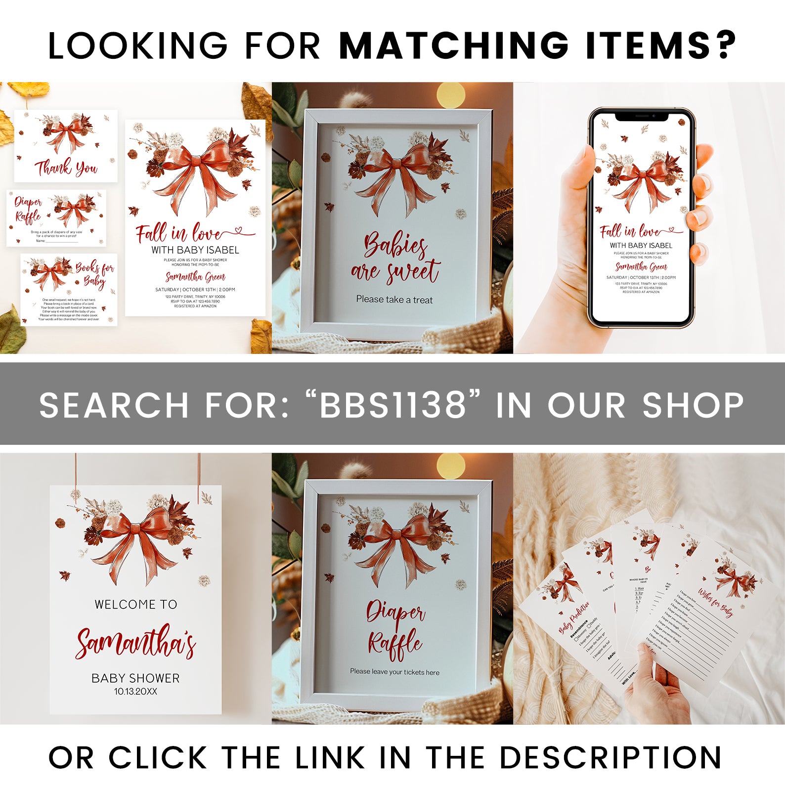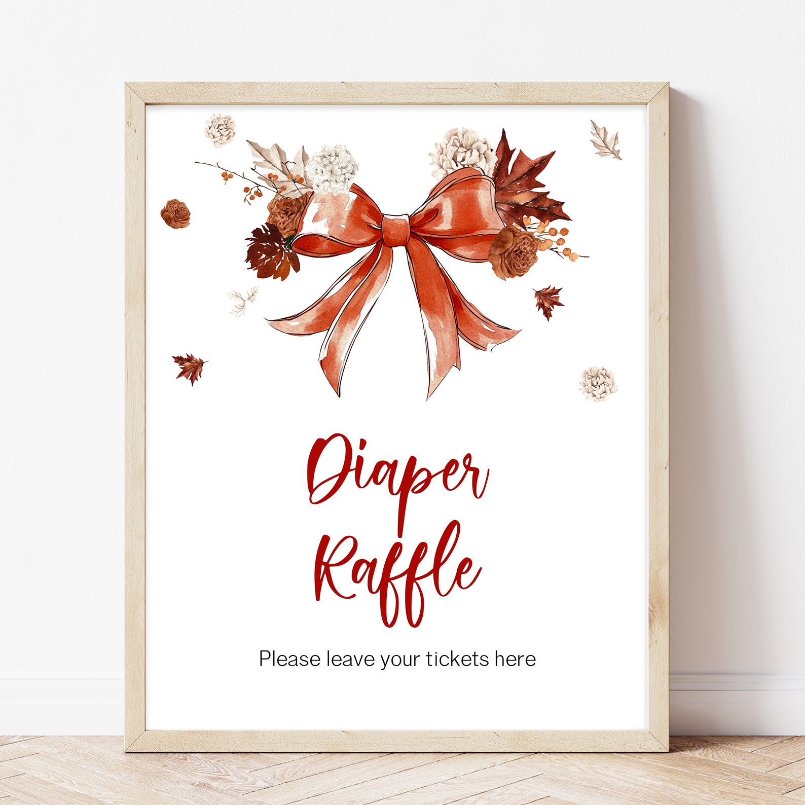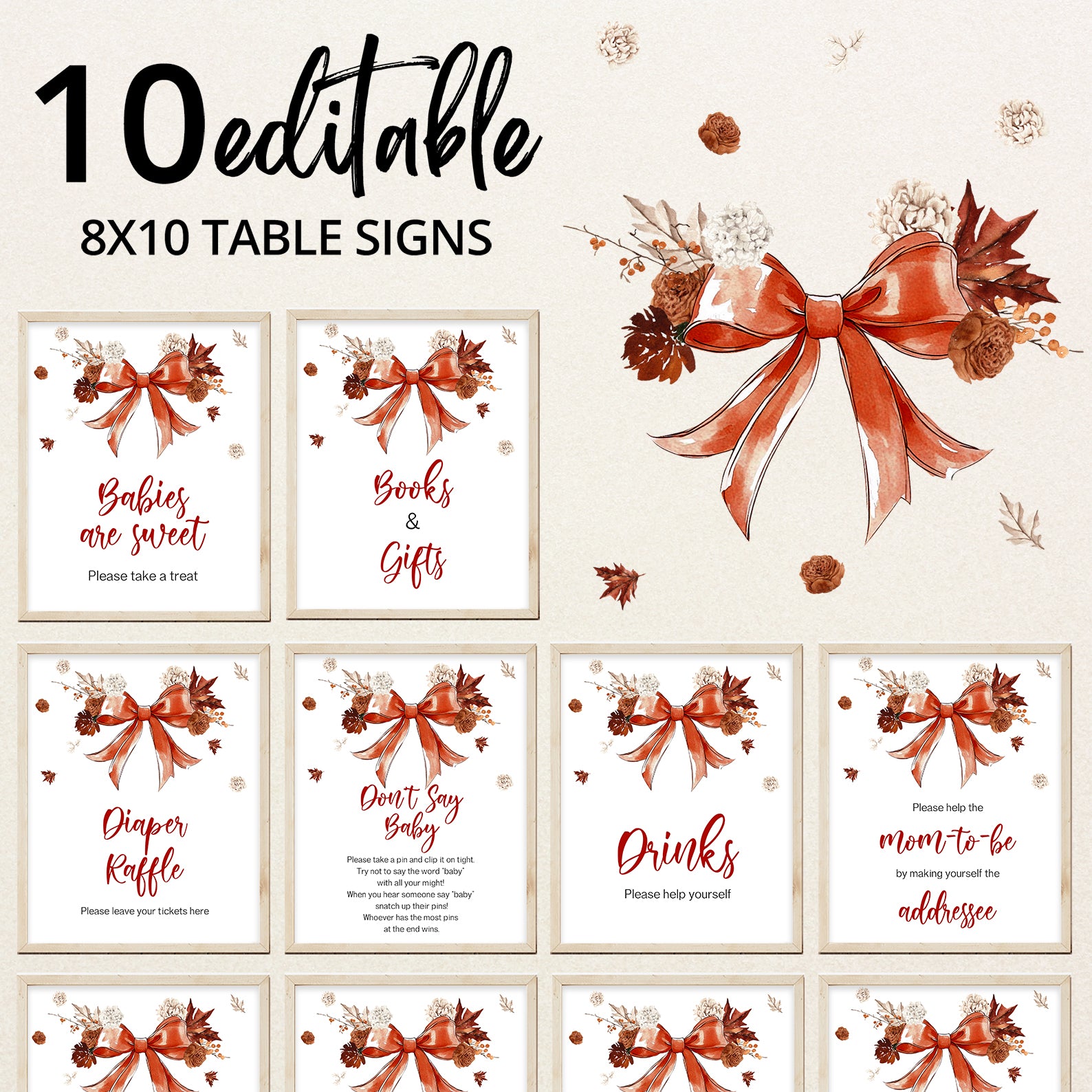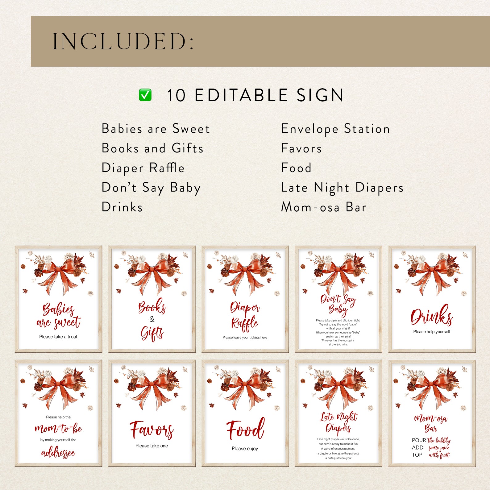 Add a festive autumn touch to your baby shower with this set of ten editable table signs. Each sign features rich fall florals, colorful leaves, and a bold red watercolor ribbon for a cozy seasonal vibe. Perfect for organizing party stations like Babies Are Sweet, Mom-osa Bar, and Diaper Raffle, these signs blend charm and function making your setup look polished while guiding guests through your celebration with ease.