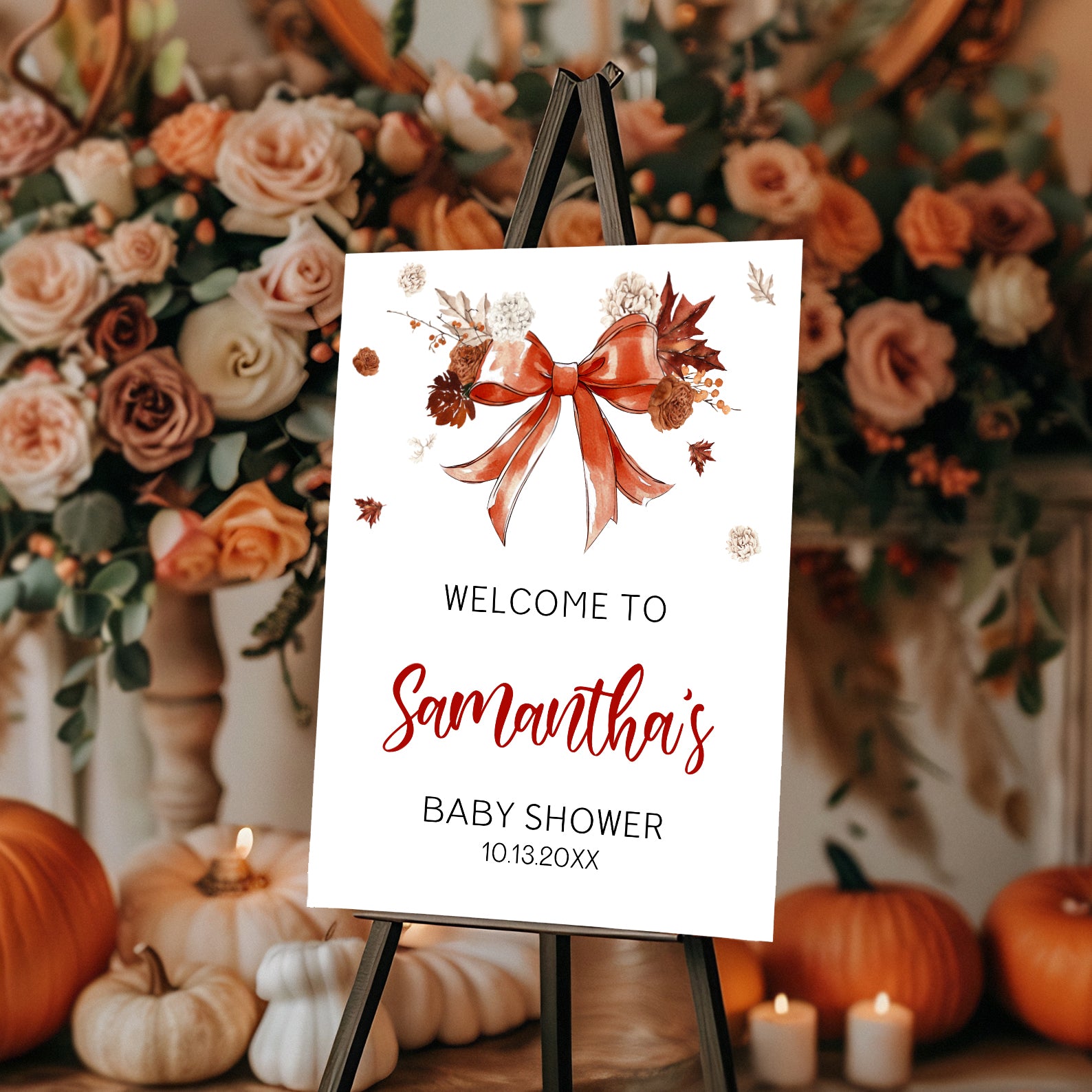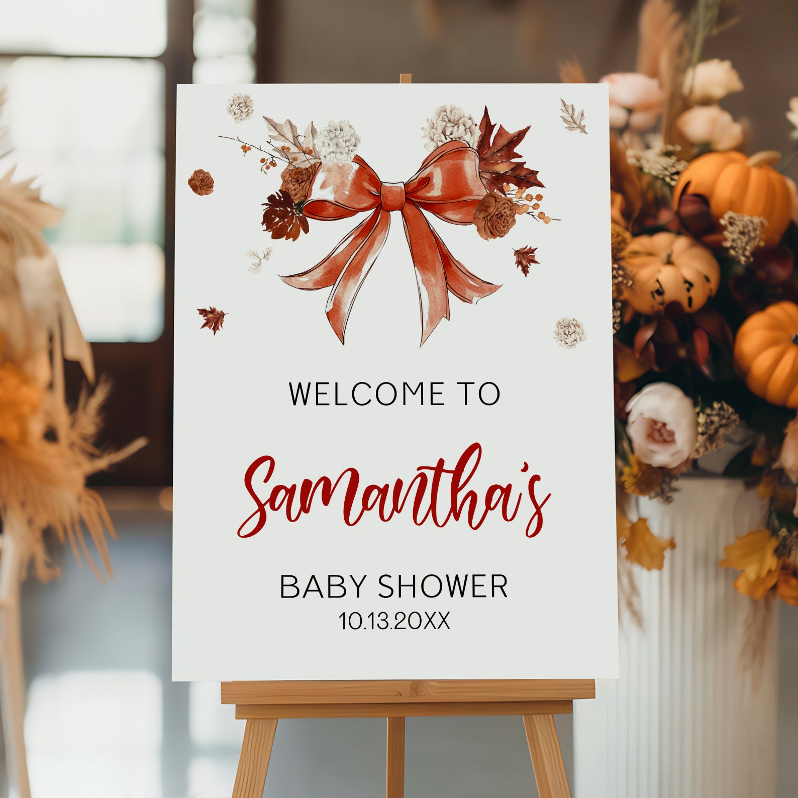 - Purchase this Fall Baby Shower Welcome Sign with Red Ribbon & Autumn Florals template