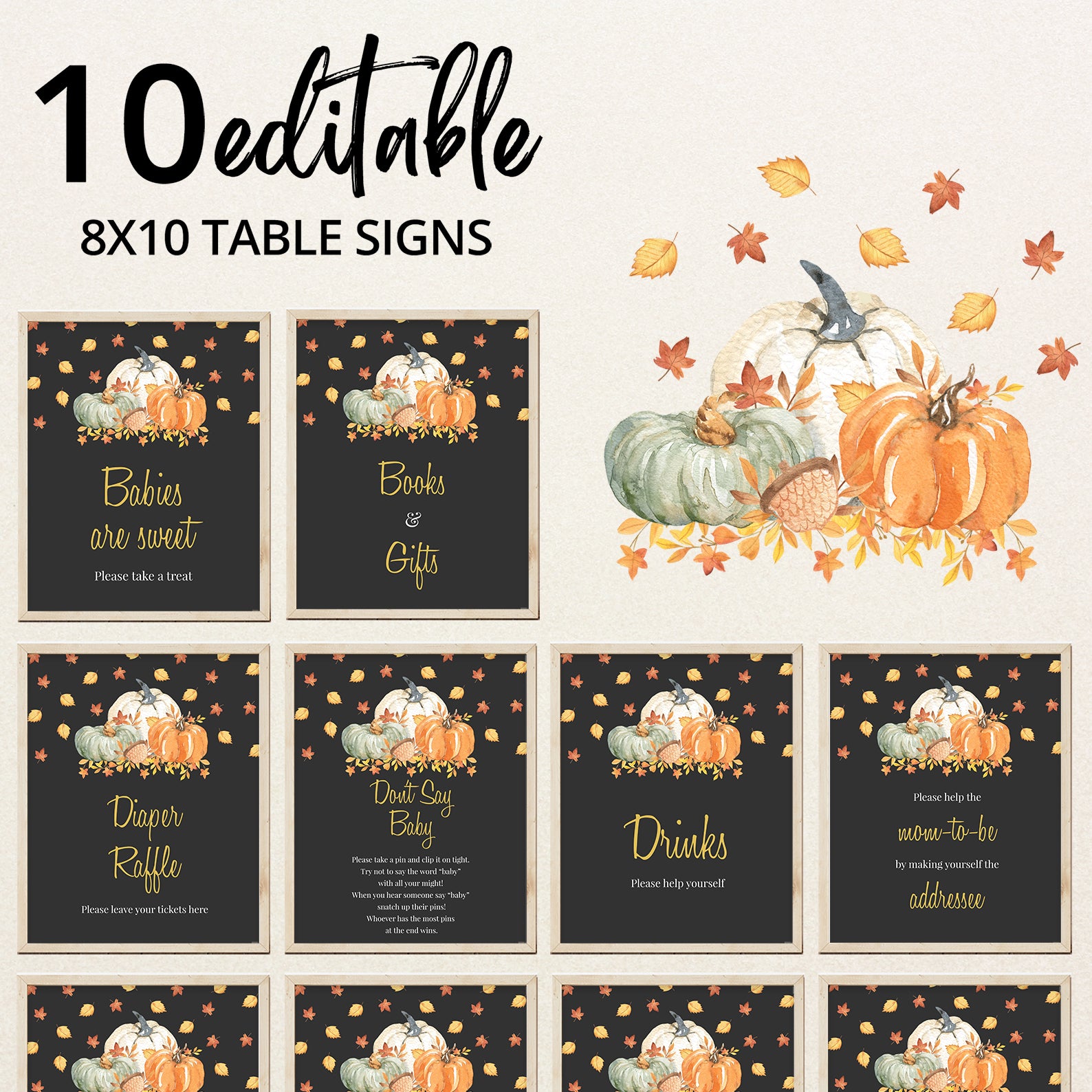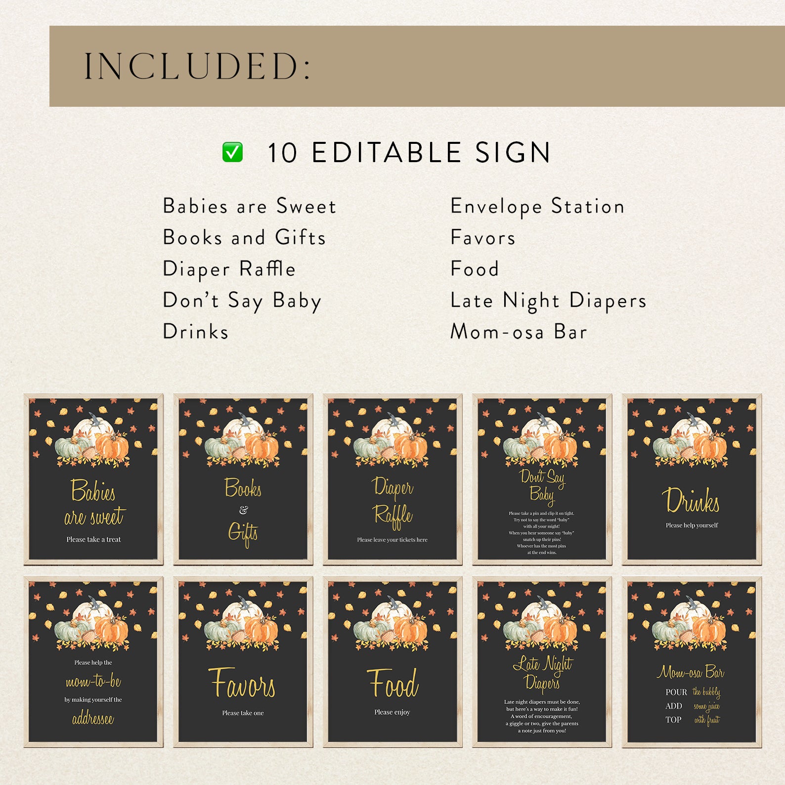 Bring autumn charm to your baby shower with this set of 10 editable table signs. Designed with watercolor pumpkins in white, orange, and green tones against a dark background, each sign adds seasonal elegance. Includes signs like "Babies Are Sweet," "Mom-osa Bar," and "Don't Say Baby" to guide guests and enhance your decor. A stylish way to coordinate your fall-themed celebration!