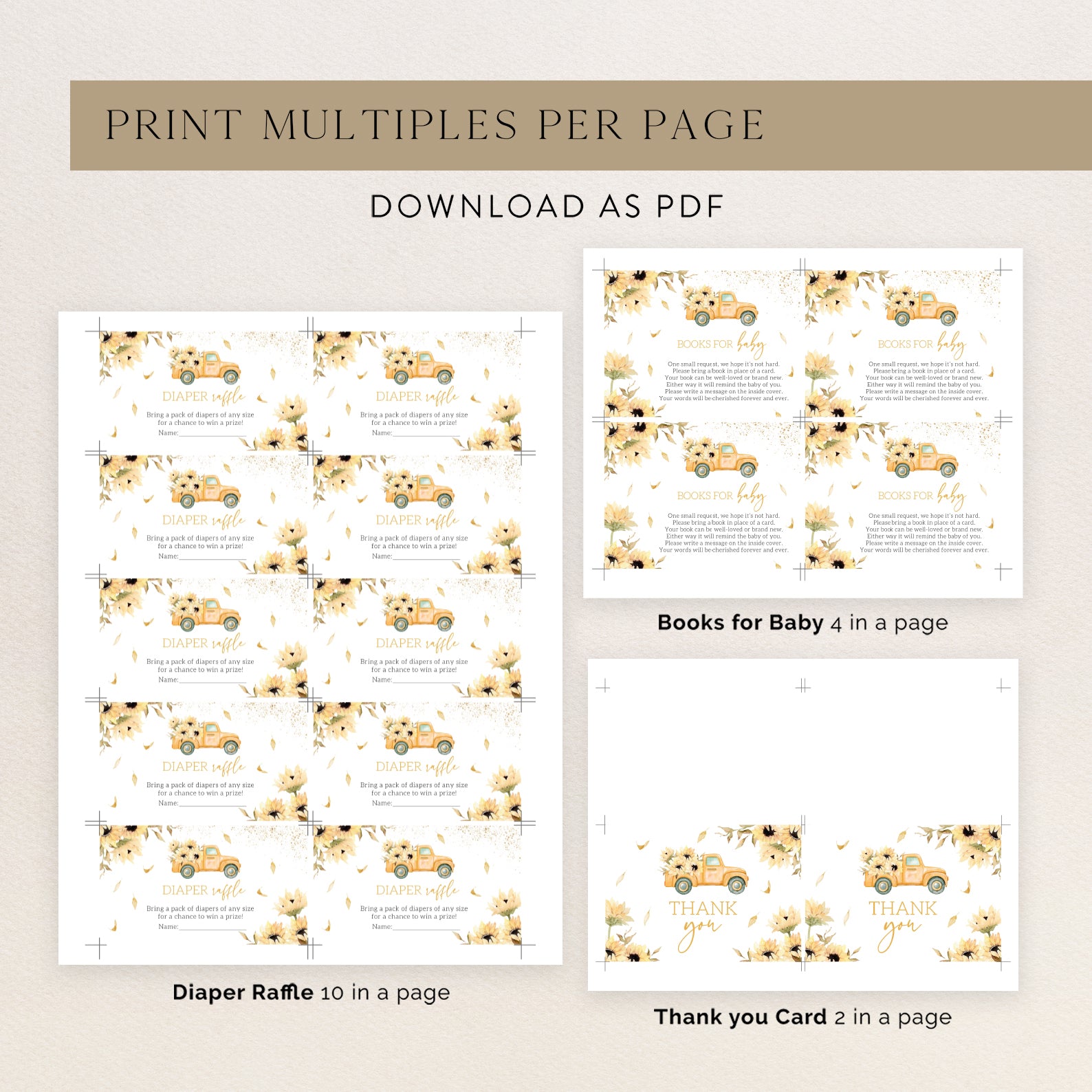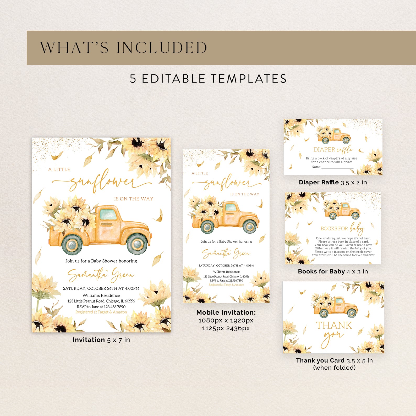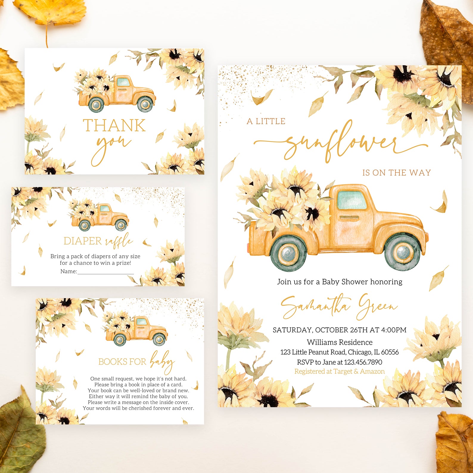 Welcome your little one with our fall baby shower bundle! This set includes an invitation, mobile invite, diaper raffle, books for baby, and thank you card, all featuring a sunny yellow theme with gold accents and whimsical sunflowers. An adorable orange pickup truck filled with sunflowers completes the look, setting a cheerful tone for your celebration.