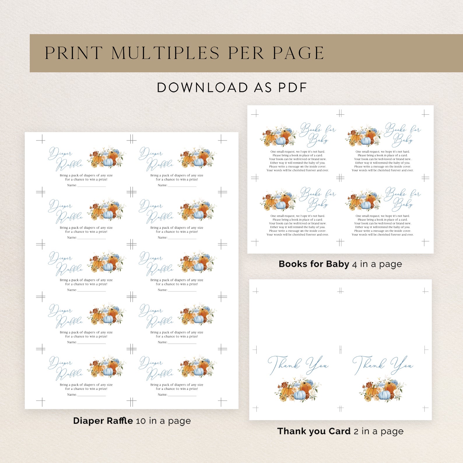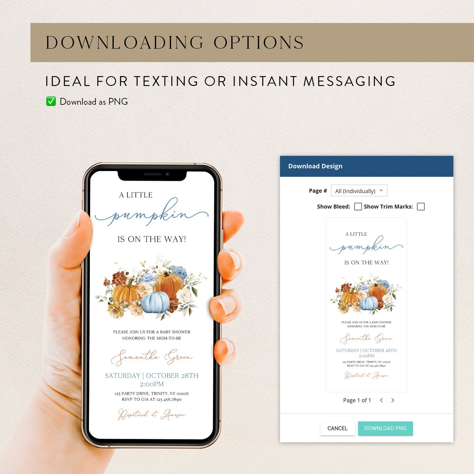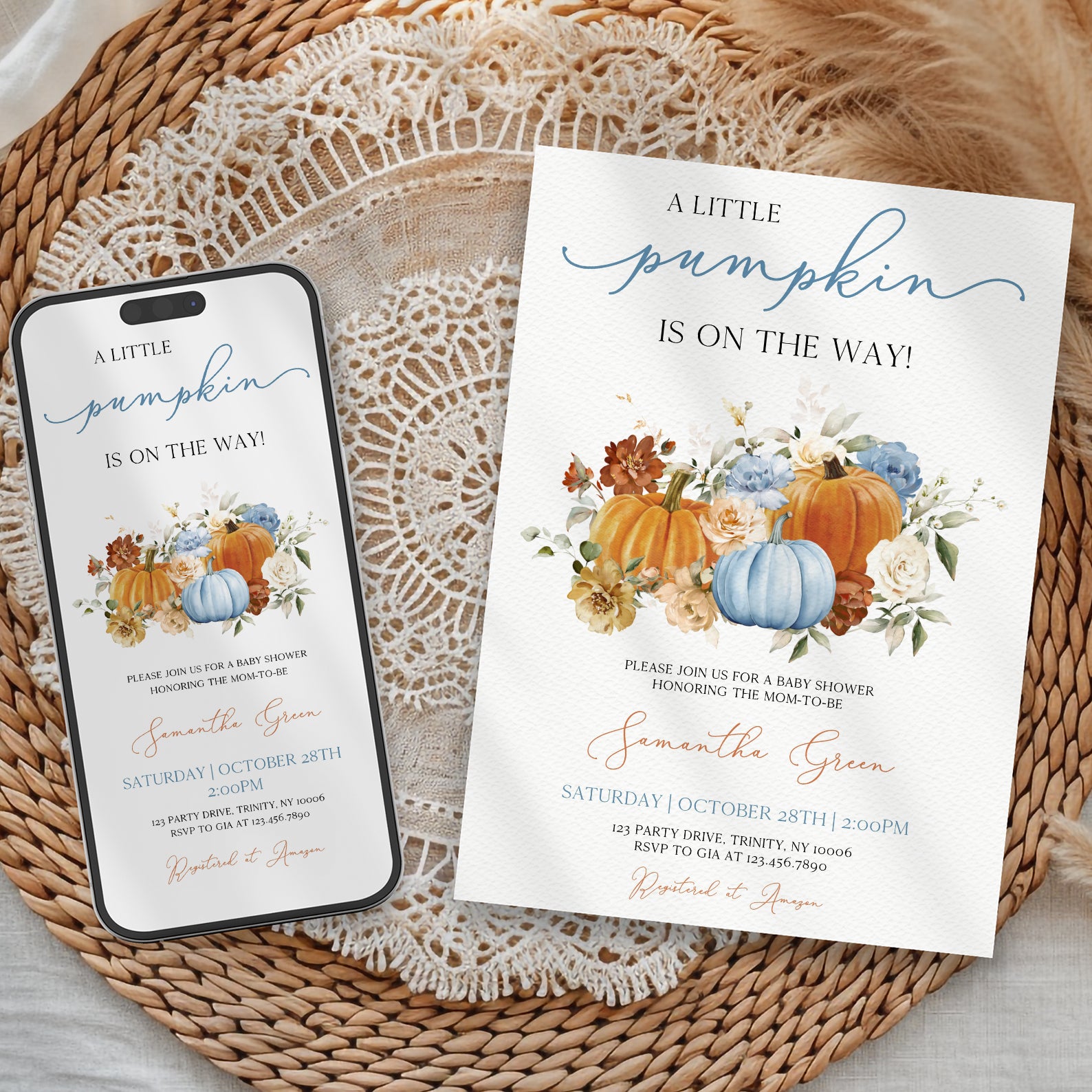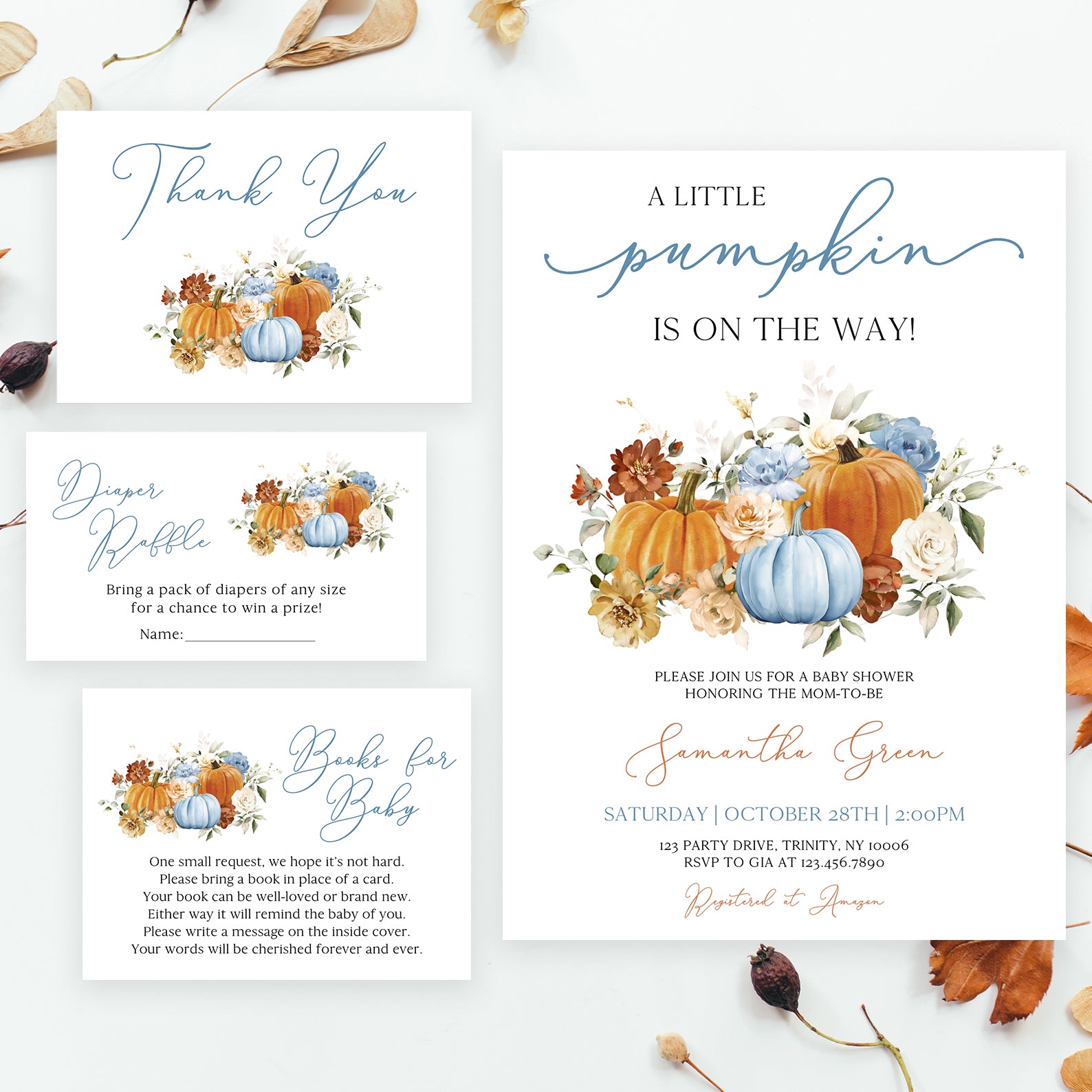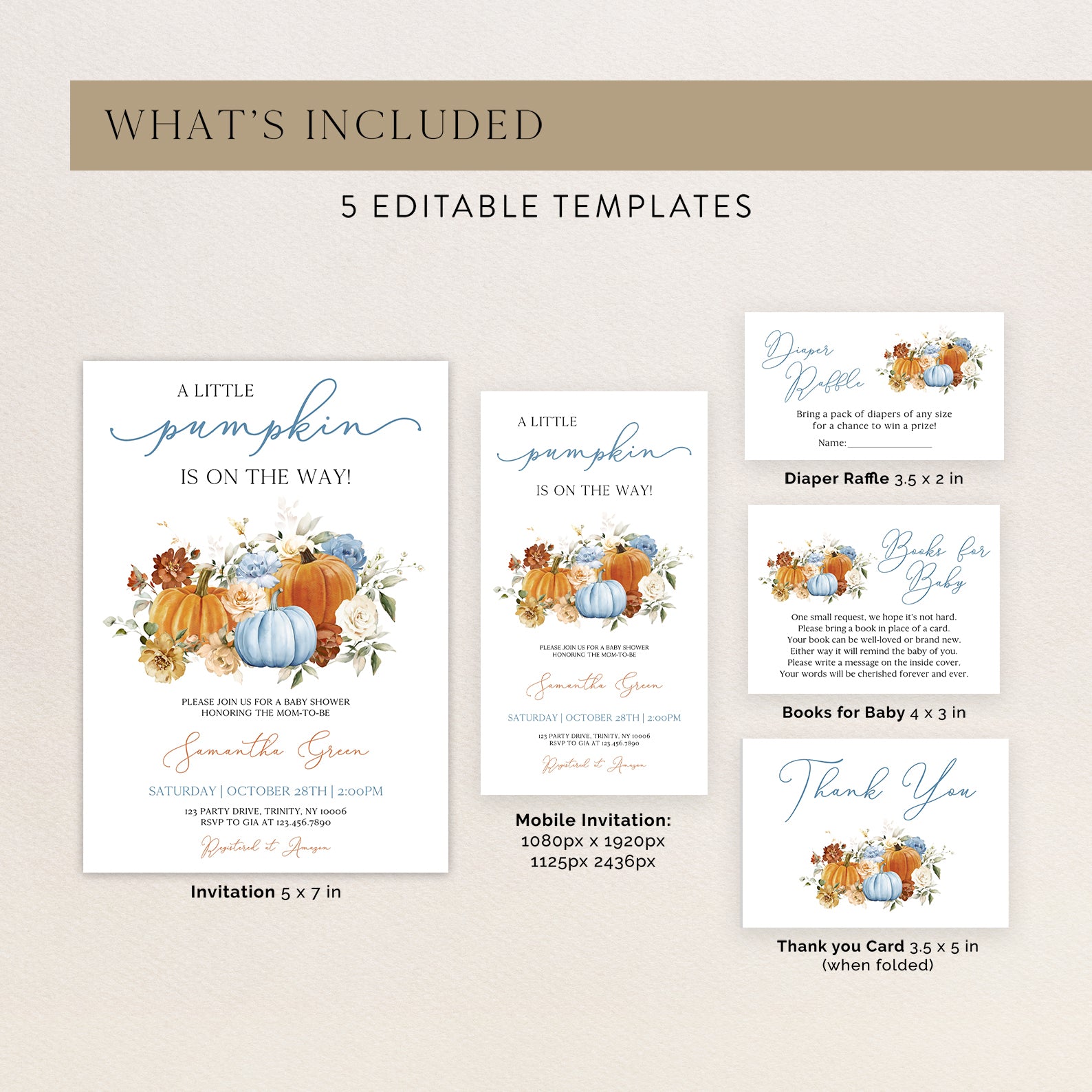 Welcome your little one with our charming fall baby shower invitation bundle! This set includes a digital invitation, mobile invite, diaper raffle, books for baby card, and thank you card, all adorned with vibrant orange and blue pumpkins and beautiful florals. Perfect for inviting friends and family to your autumn celebration, this bundle is easy to customize and share, adding a cozy touch to your event!