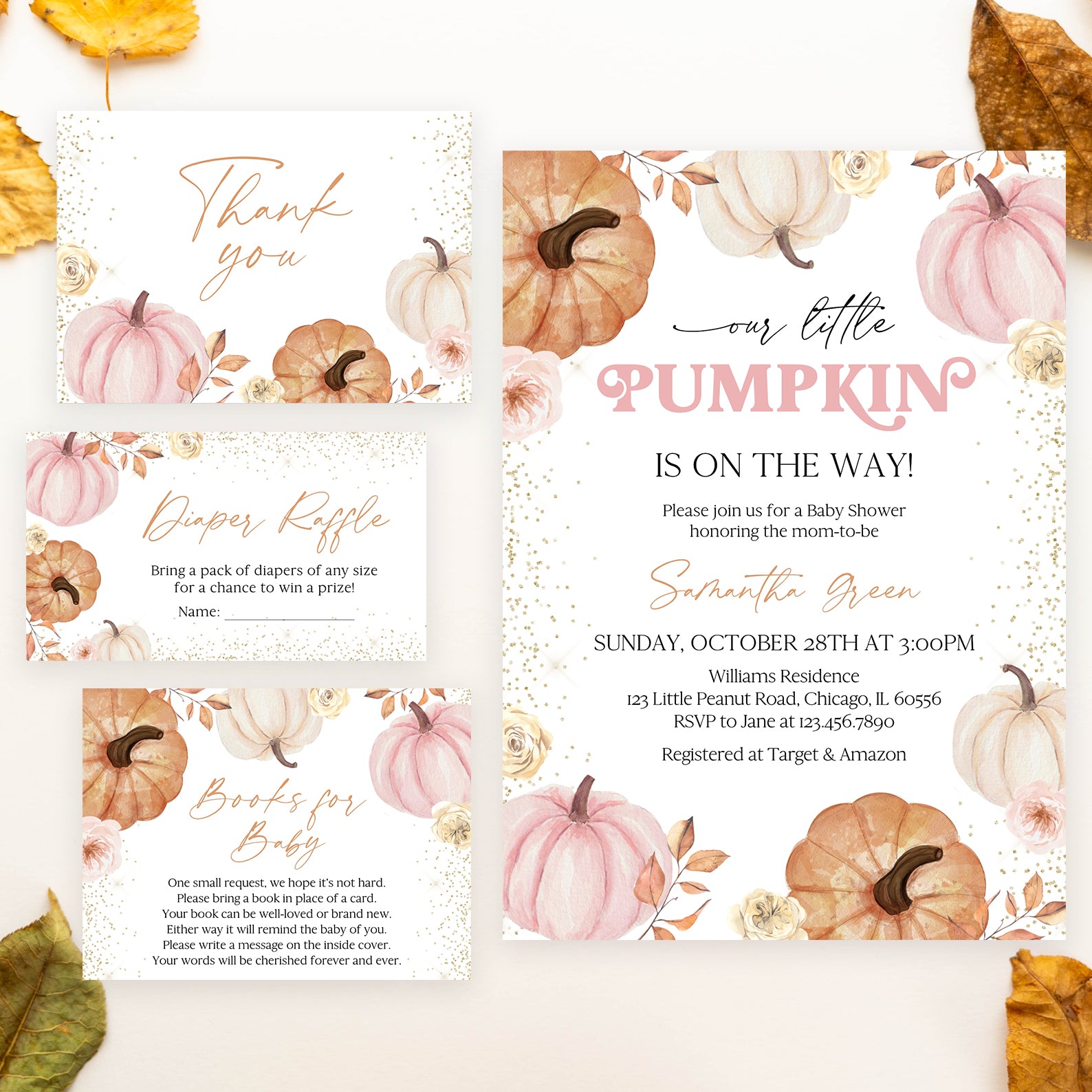 Little Pumpkin Baby Shower Invite Bundle: Watercolor Pumpkins & Gold
