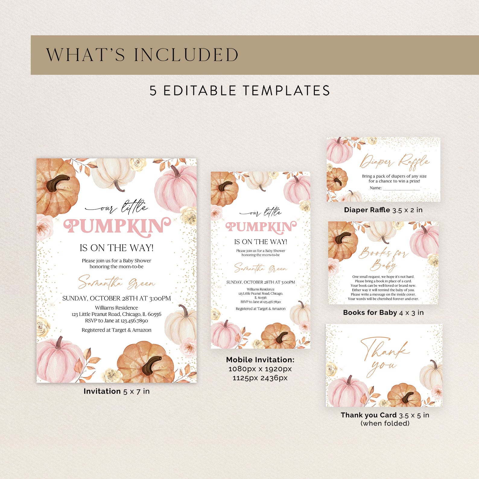 - Purchase this Little Pumpkin Baby Shower Invite Bundle: Watercolor Pumpkins & Gold template