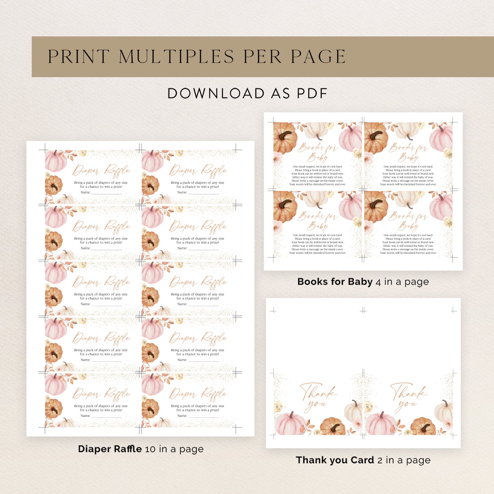 Get ready for your little one with our fall baby shower invitation bundle! This set includes a digital invitation, mobile invite, diaper raffle, books for baby card, and thank you card, featuring watercolor pumpkins, roses, autumn leaves, and gold accents. It’s a charming way to invite loved ones and add a warm, festive touch to your autumn gathering.