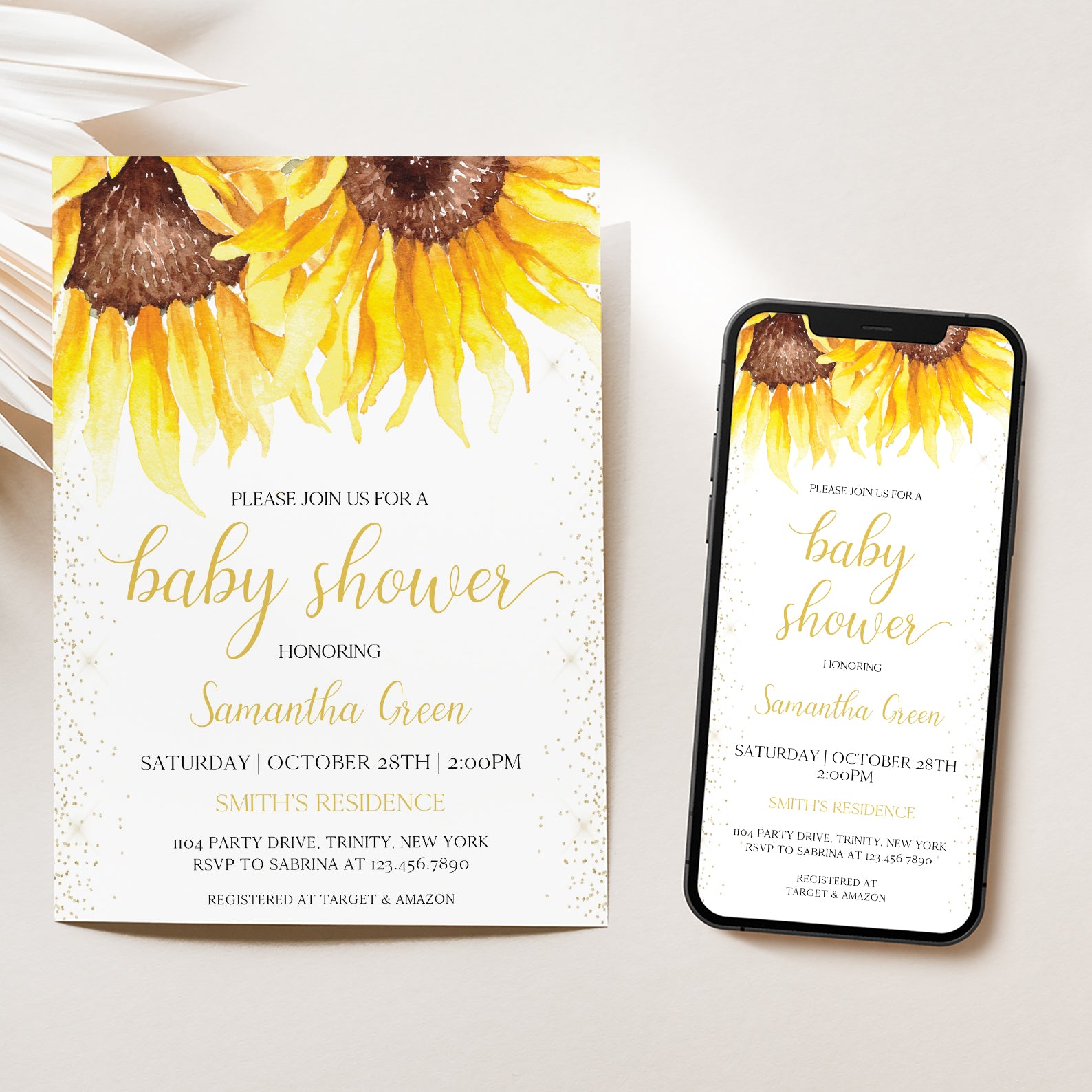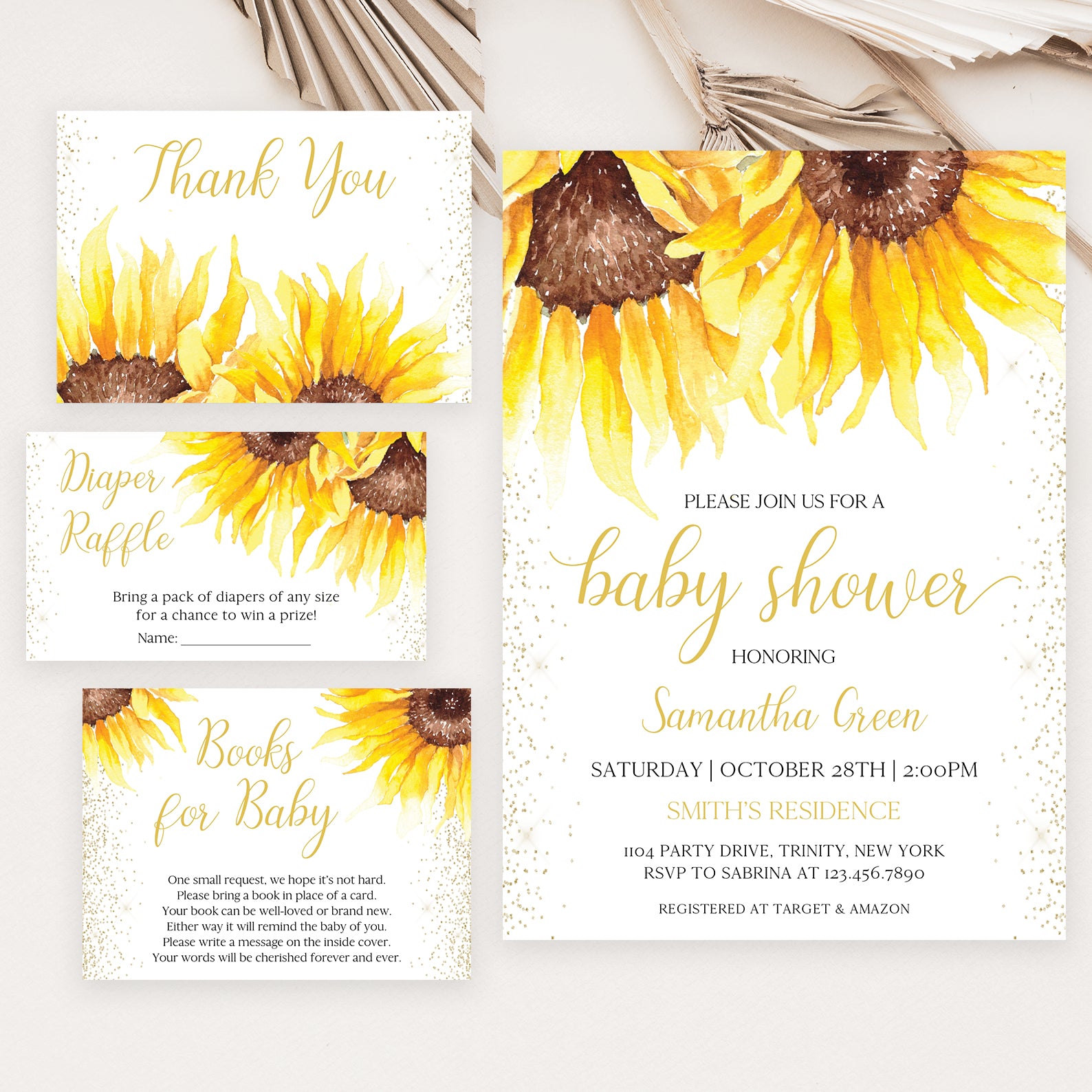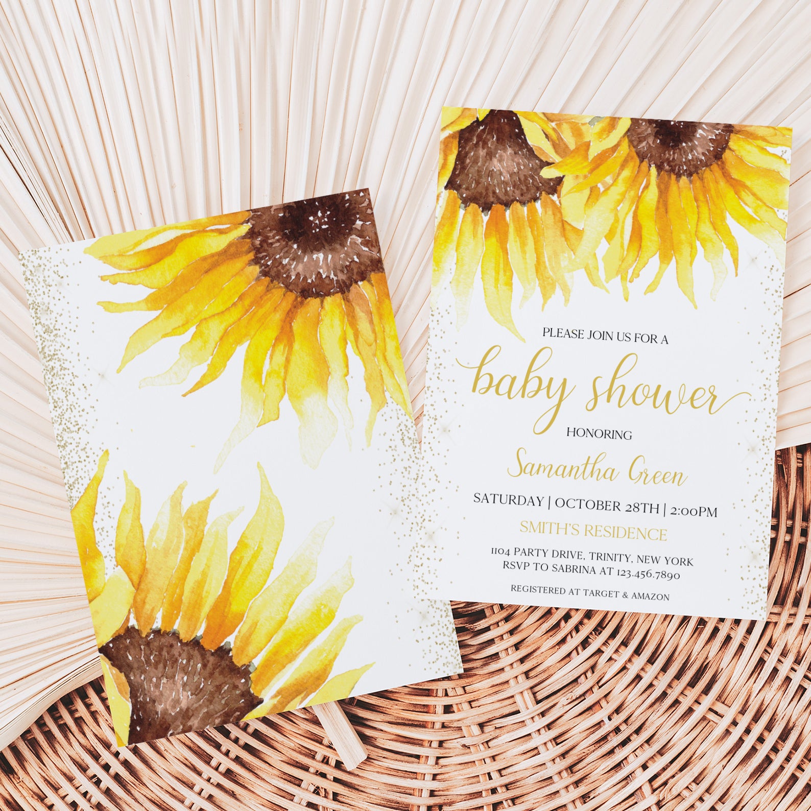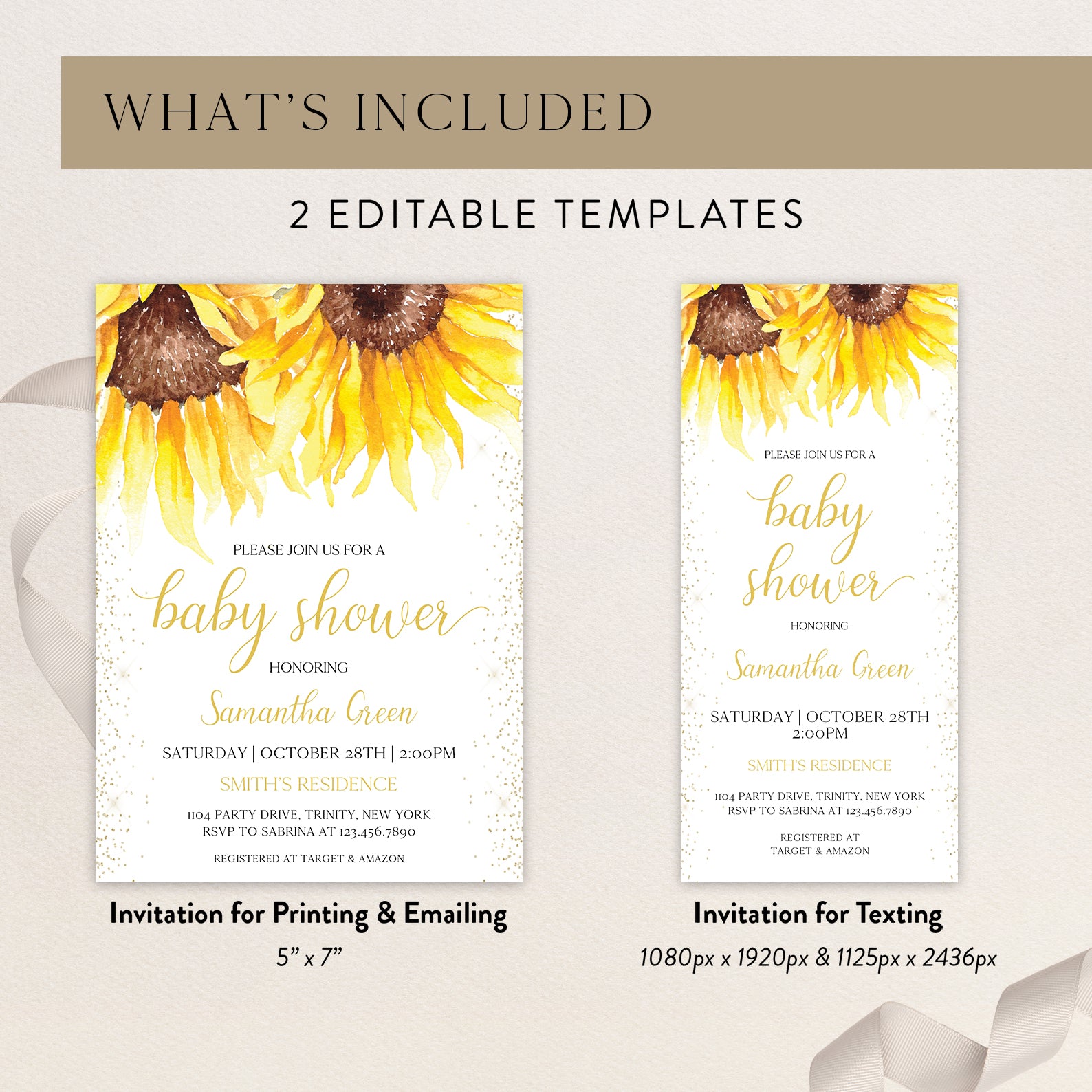 - Purchase this Yellow Fall Baby Shower Invite Bundle with Sunflowers & Gold Accents template