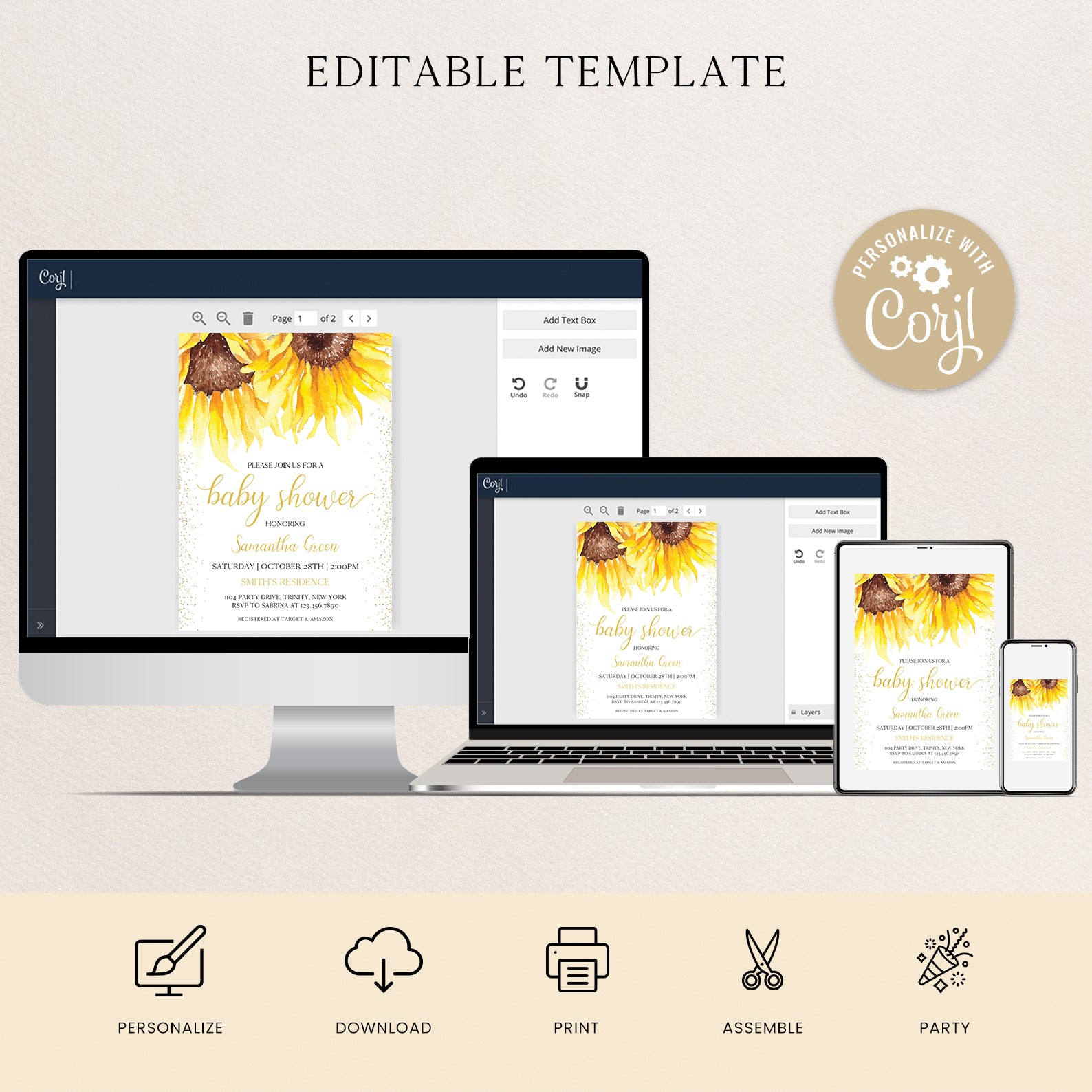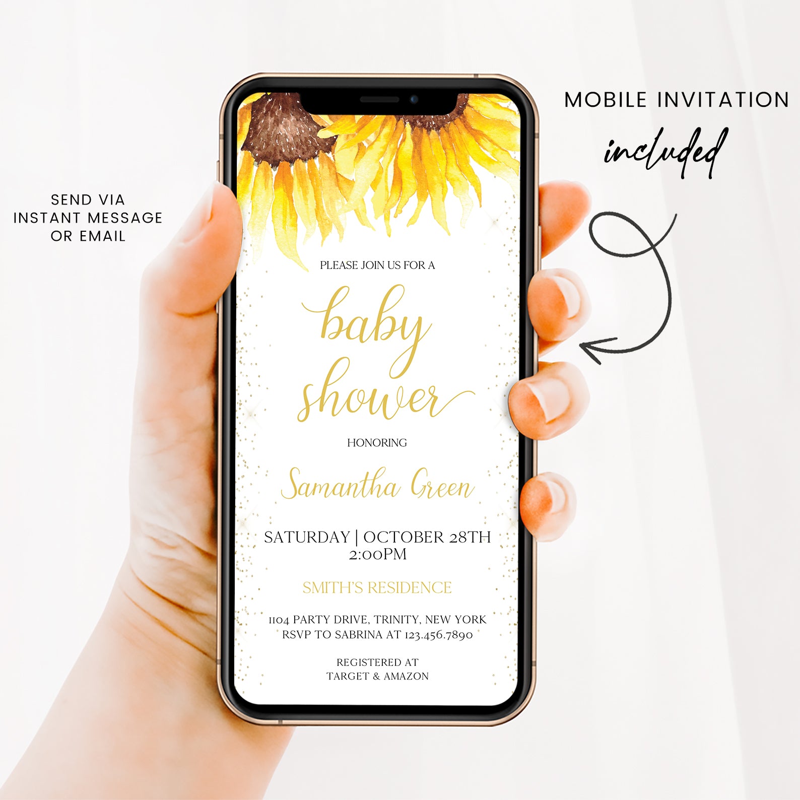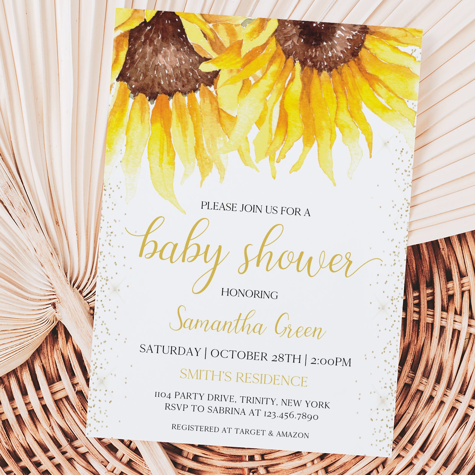 - Purchase this Yellow Fall Baby Shower Invite Bundle with Sunflowers & Gold Accents template