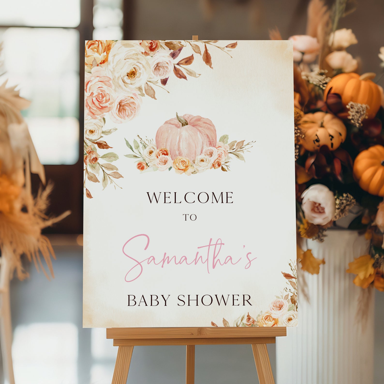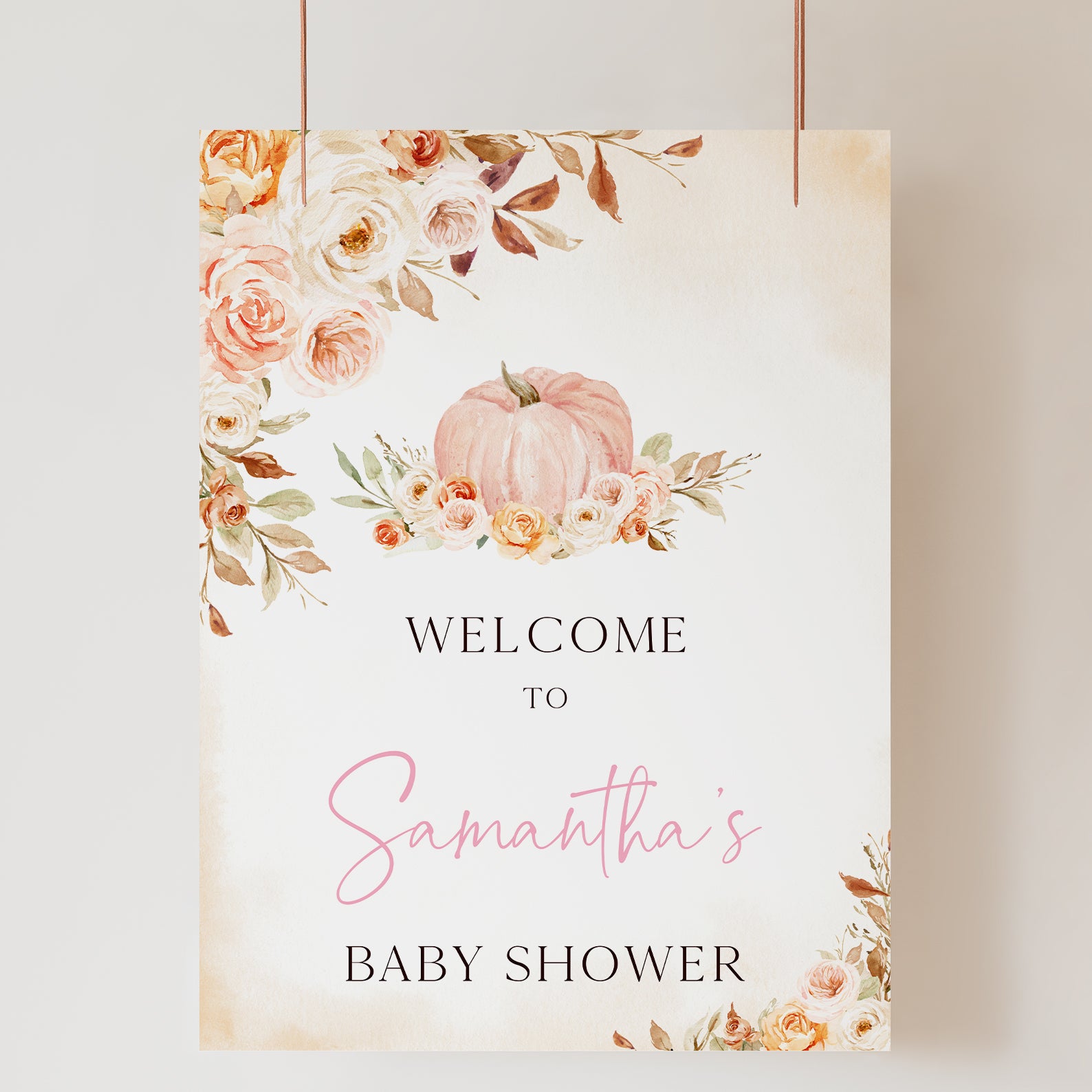 - Purchase this Charming Fall Pink Baby Shower Welcome Sign with Roses & Pumpkins template