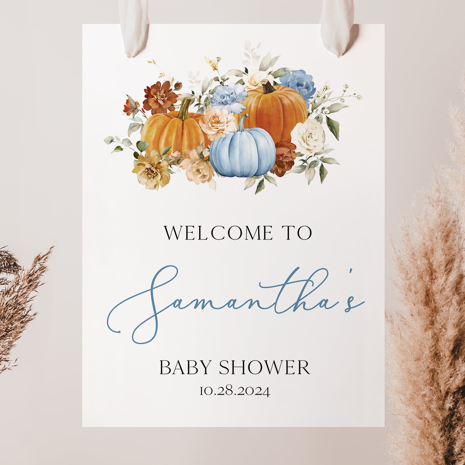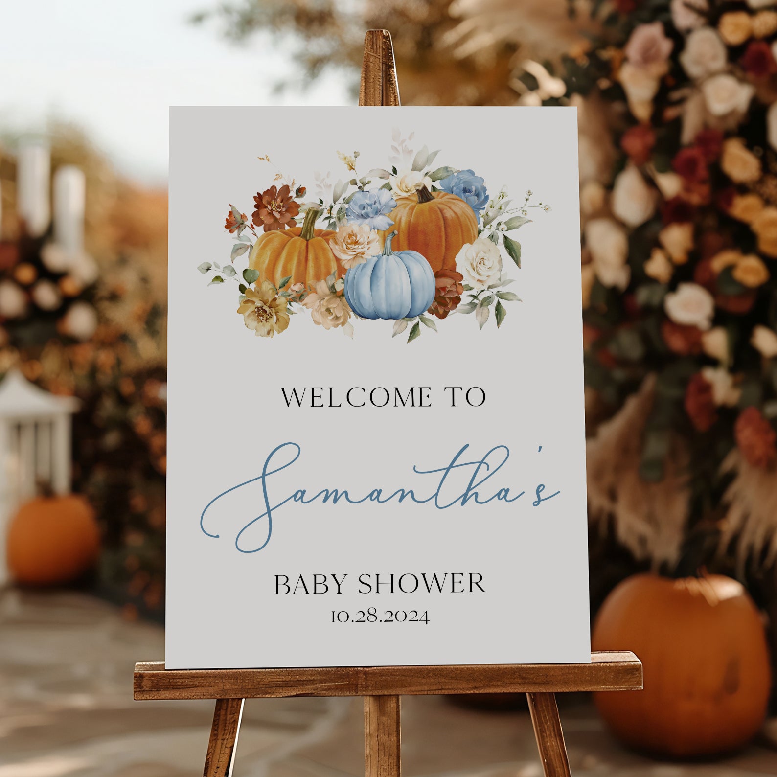 Greet guests with our charming fall baby shower digital welcome sign! Featuring vibrant orange and blue pumpkins surrounded by beautiful florals, this sign captures the essence of autumn and adds a warm touch to your gathering. Easy to customize and display, it’s the perfect way to welcome friends and family as you prepare for your little pumpkin’s arrival.