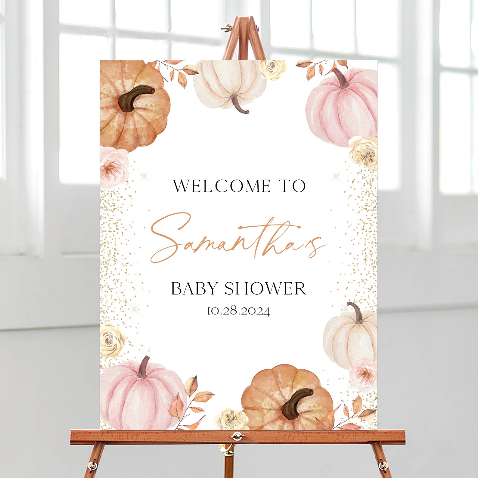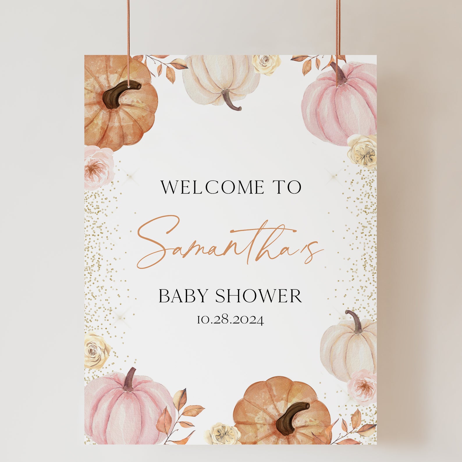 - Purchase this Little Pumpkin Baby Shower Welcome Sign: Watercolor Pumpkins & Gold template