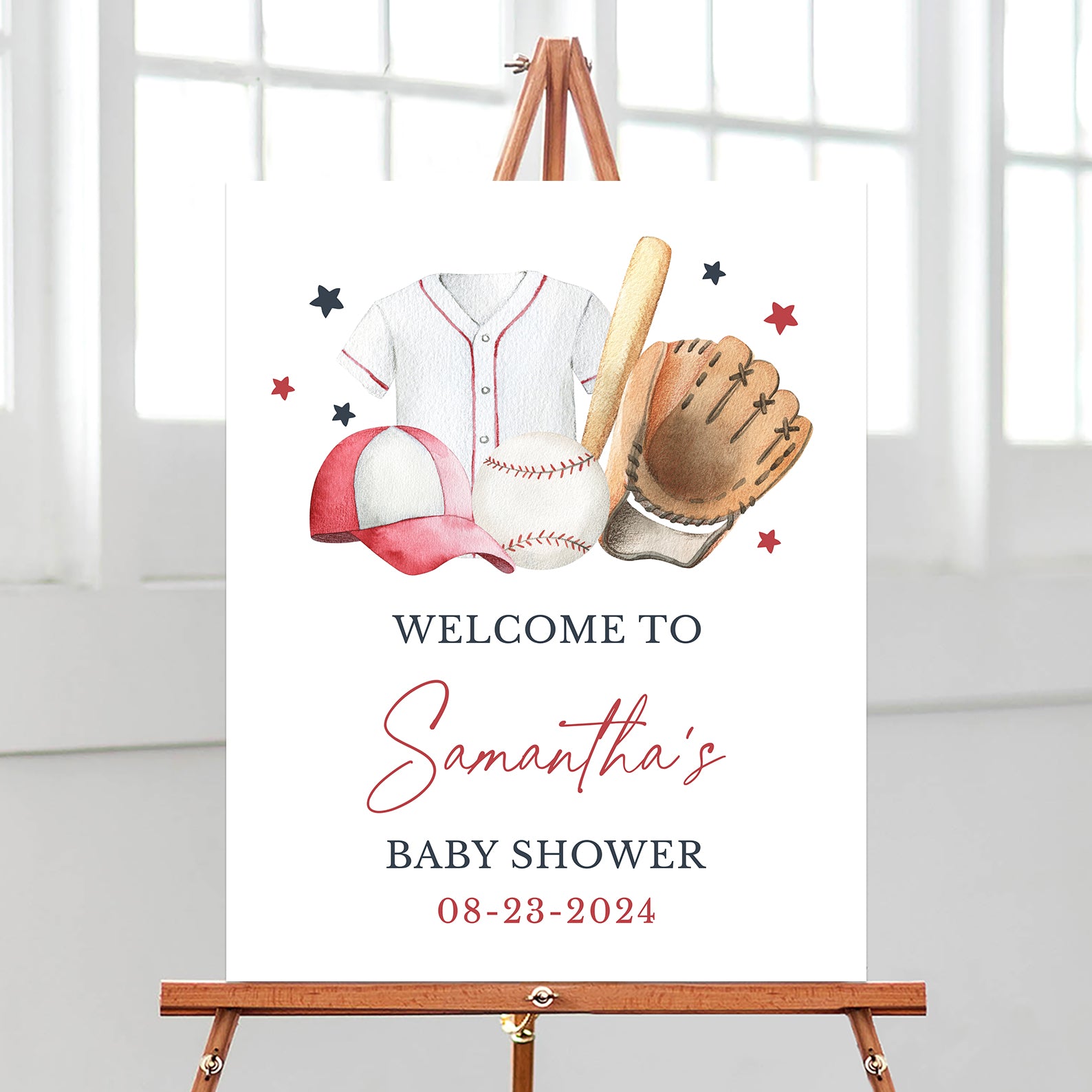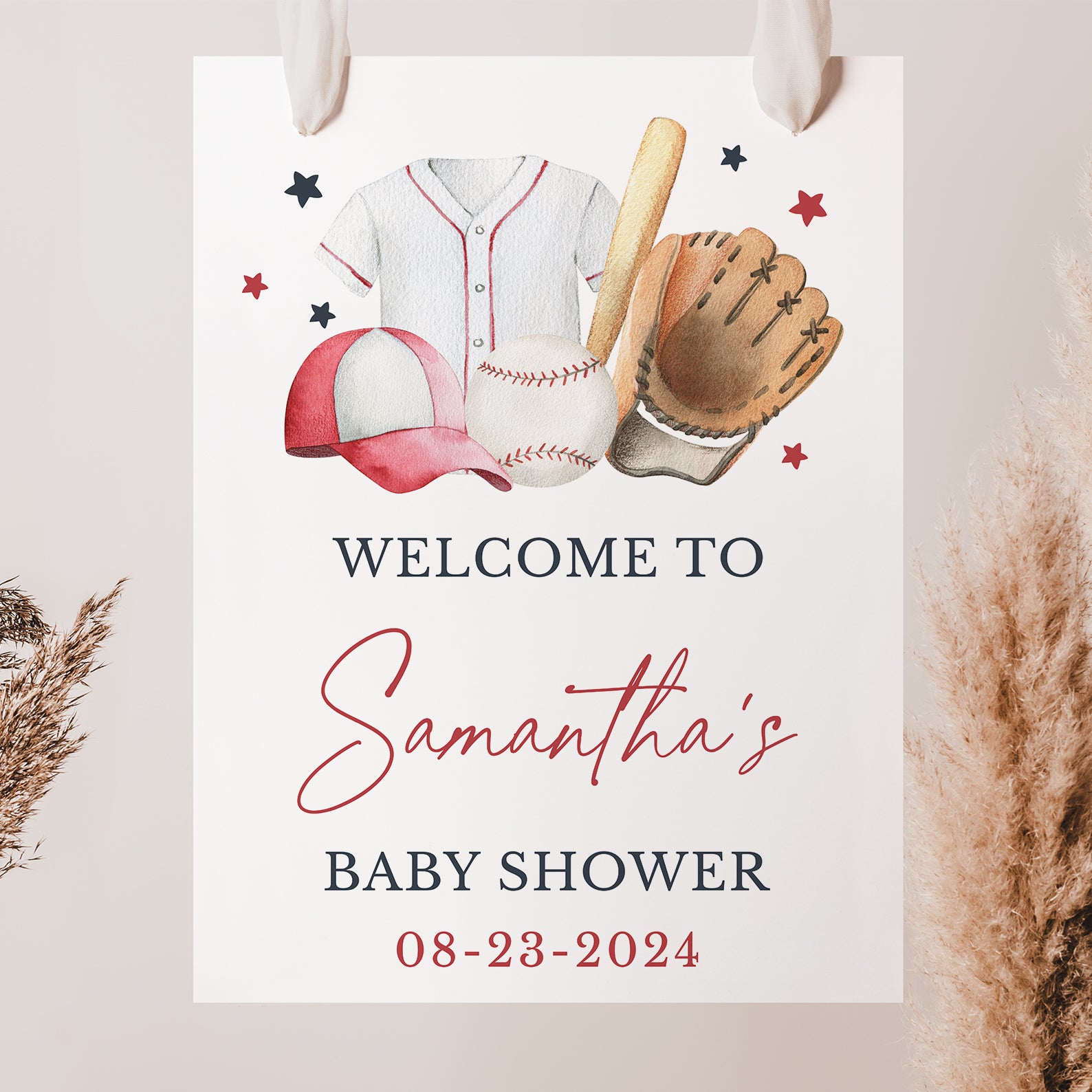 Knock your baby shower out of the park with this playful welcome sign, designed to match your little slugger theme! Set on a crisp white background, it features a baseball cap, bat, ball, gloves, and a tiny jersey, all surrounded by red and blue stars for that all-American charm. It’s the perfect way to greet guests and set a sporty, fun tone for your baseball-themed celebration. Fully editable and easy to print!