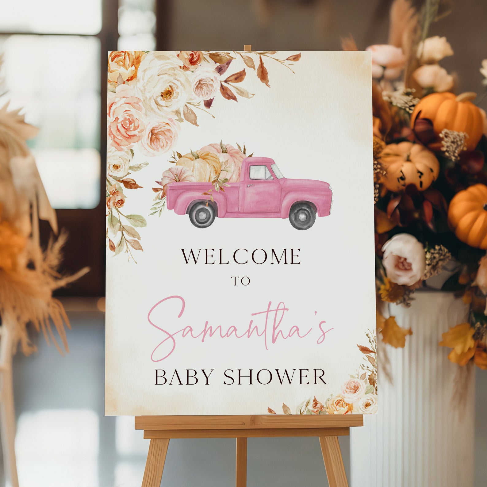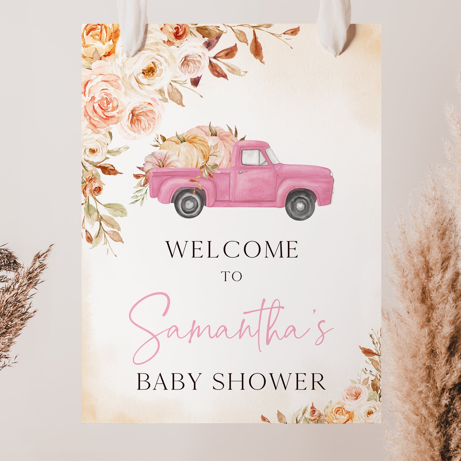 - Purchase this Pickup Truck & Pumpkins with Roses Pink Fall Baby Shower Welcome Sign template
