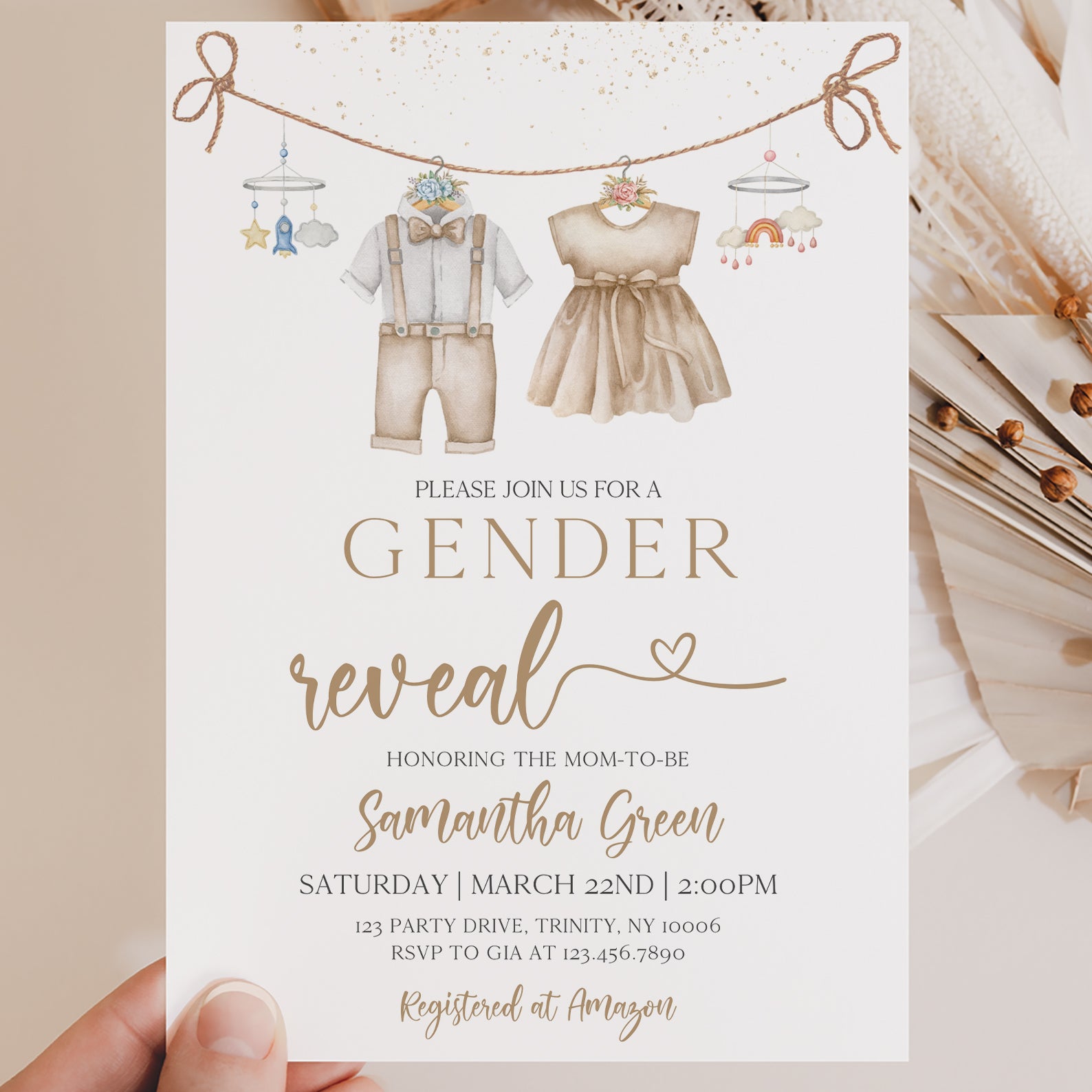 This charming evergreen gender reveal digital invitation sets the perfect tone for your celebration. Featuring a delightful brown theme, it showcases adorable hanging baby clothes for both baby boy and baby girl, complemented by a whimsical nursery mobile on either side. The elegant gold accents at the top add a touch of sophistication, making it an inviting choice for friends and family to join in the excitement of your little one's upcoming arrival.