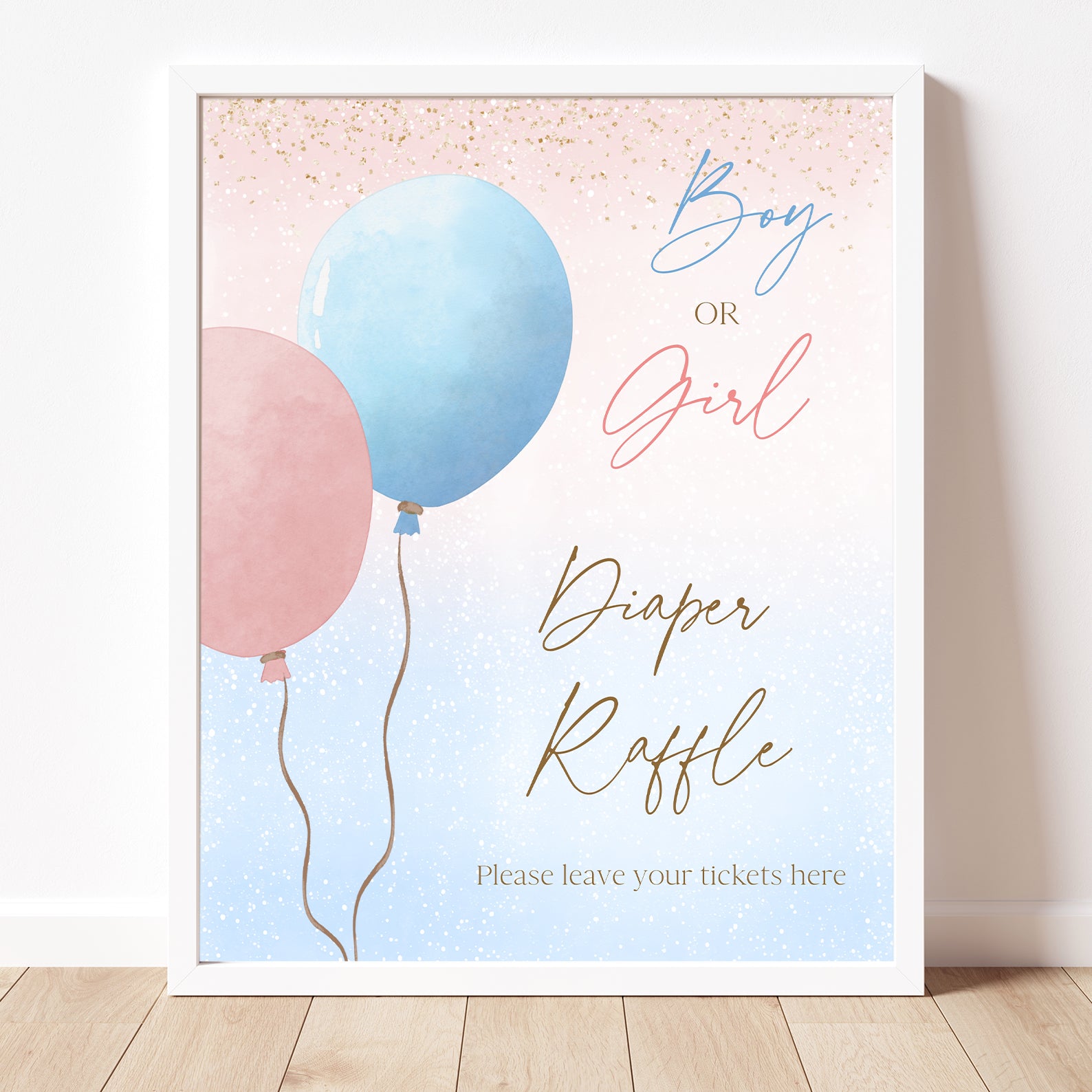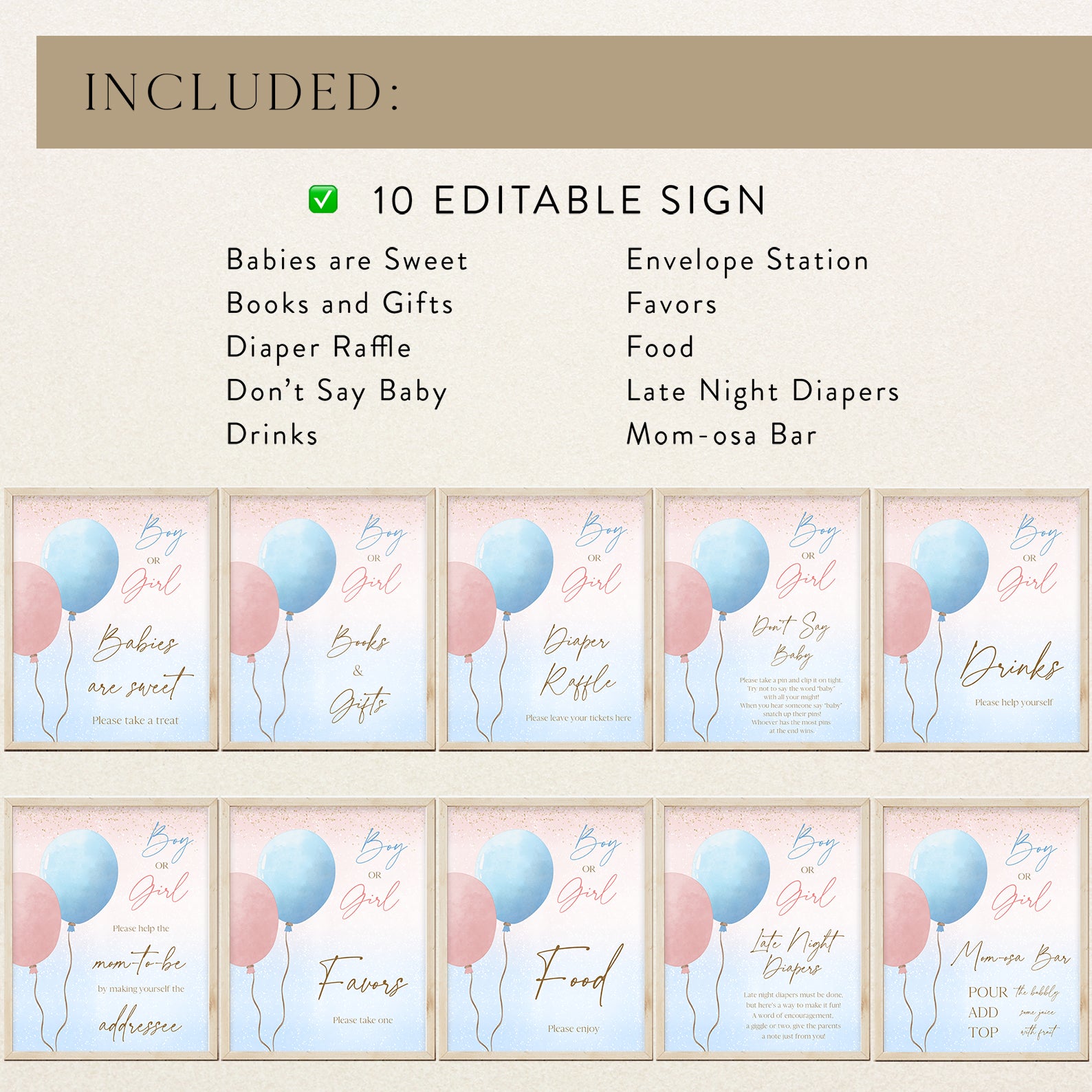 Enhance your gender reveal celebration with this set of ten editable table signs, designed to complement your special event. Featuring charming pink and blue balloons, elegant gold details, and a captivating gradient background, these signs add a stylish touch to your party décor. The set includes Babies Are Sweet, Books and Gifts, Diaper Raffle, Don't Say Baby, Drinks, Envelope Station, Favors, Food, Late Night Diapers, and Mom-osa Bar, ensuring a beautifully coordinated event as guests gather to discover if it's a boy or a girl!
