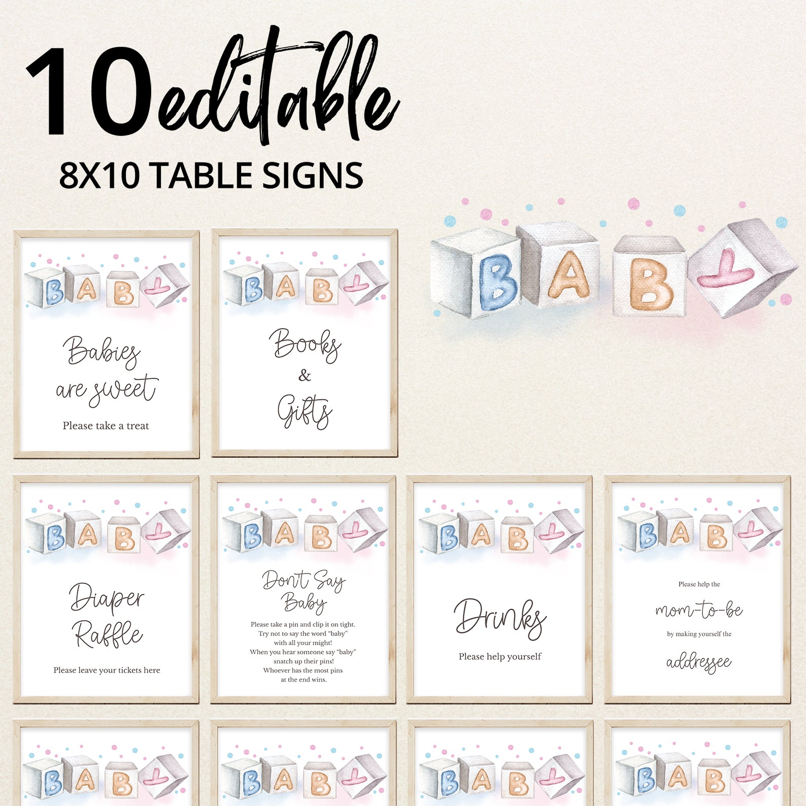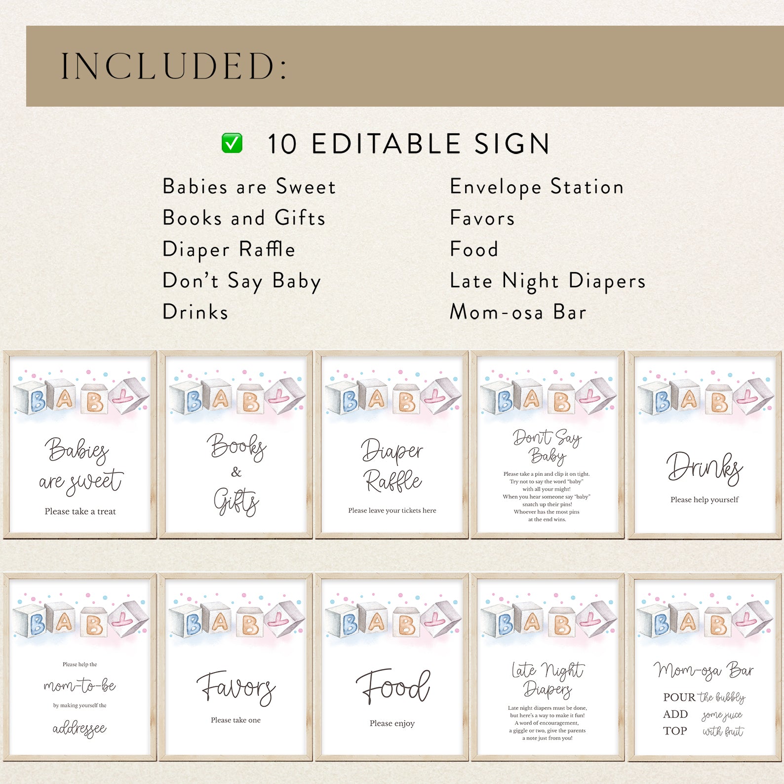 Add a touch of charm to your gender reveal with this set of ten editable table signs, designed in a minimalist style to match your celebration. Featuring soft pink and blue bubbles alongside classic baby blocks, these signs bring a stylish yet playful touch to your event. The set includes Babies Are Sweet, Books and Gifts, Diaper Raffle, Don't Say Baby, Drinks, Envelope Station, Favors, Food, Late Night Diapers, and Mom-osa Bar, making it the perfect addition to your special day!
