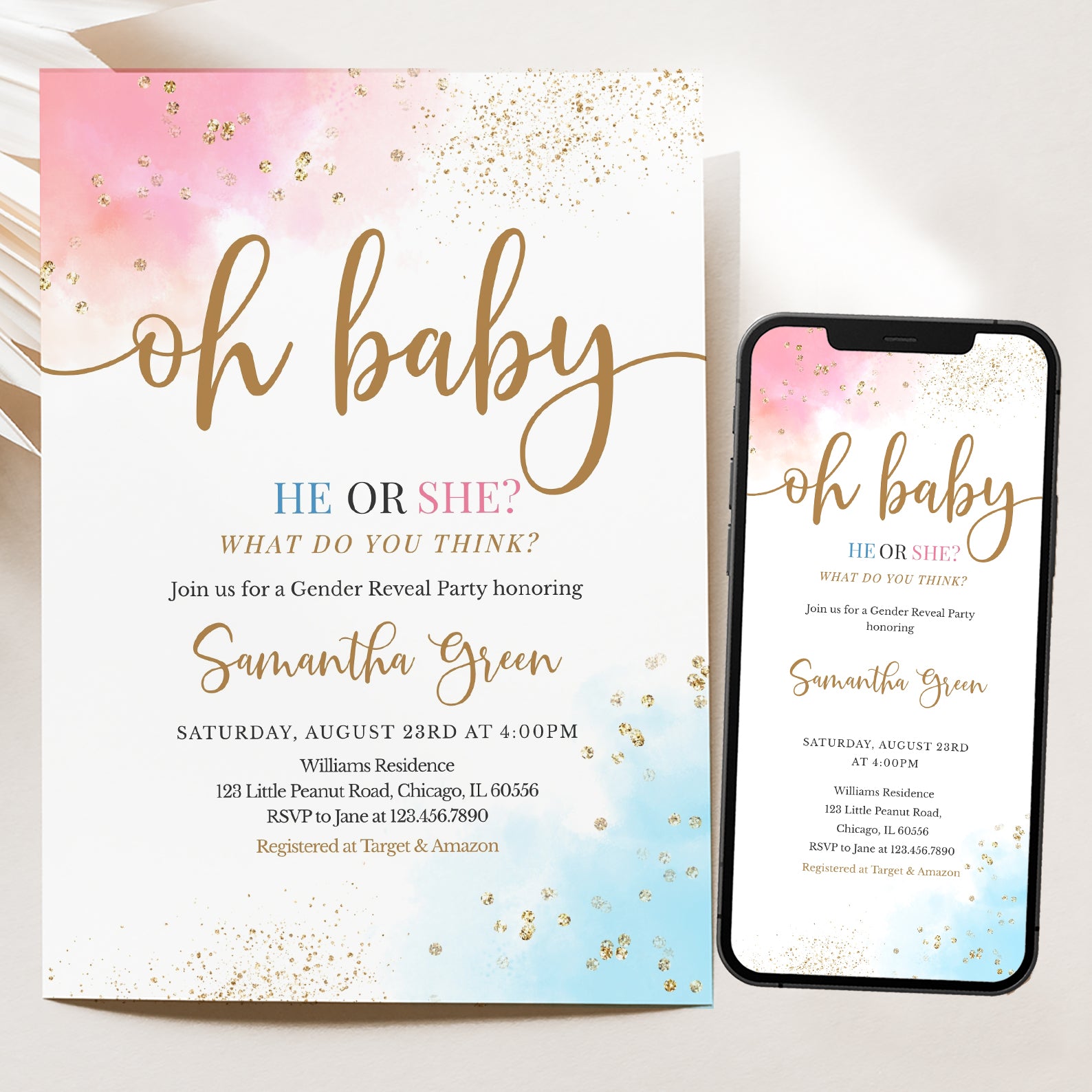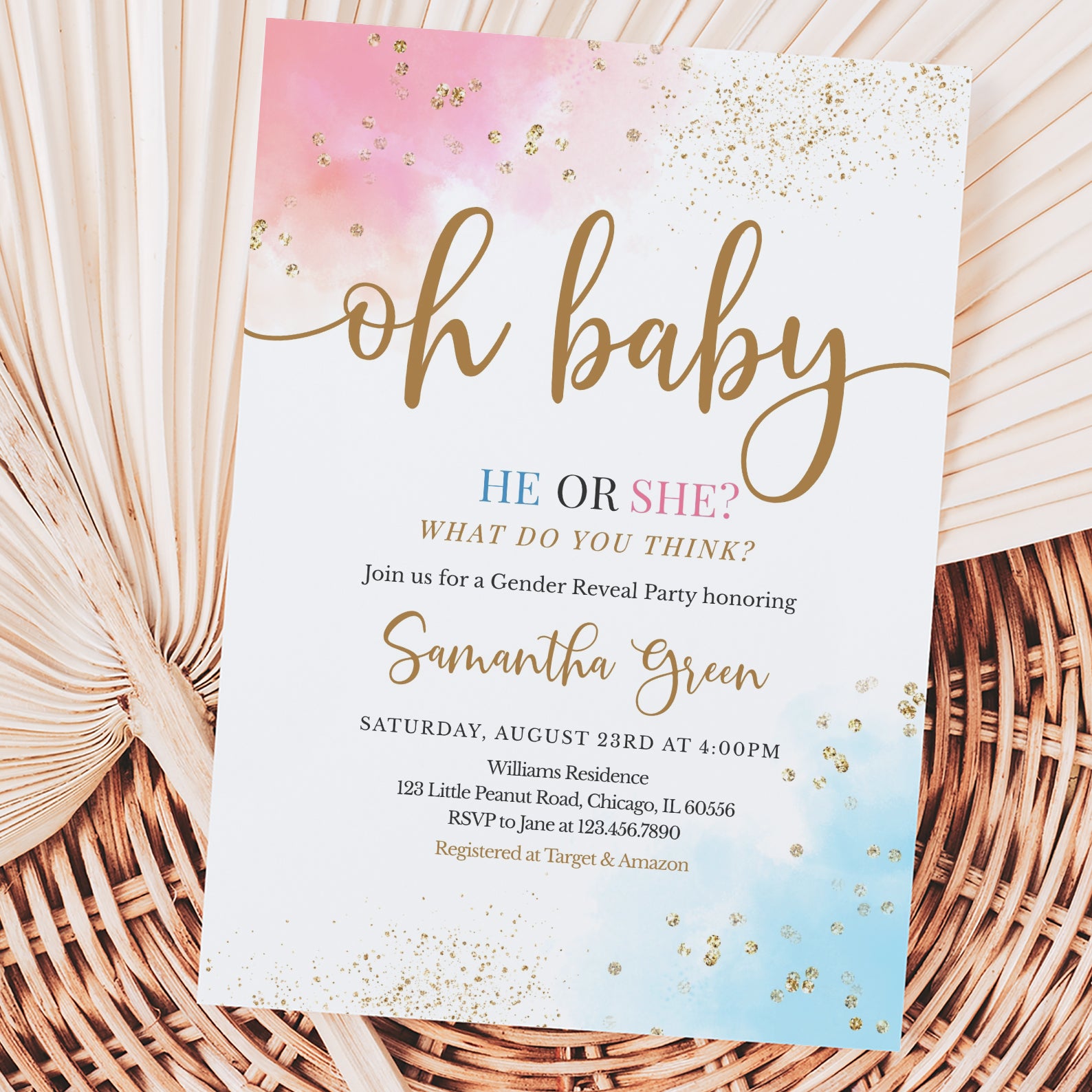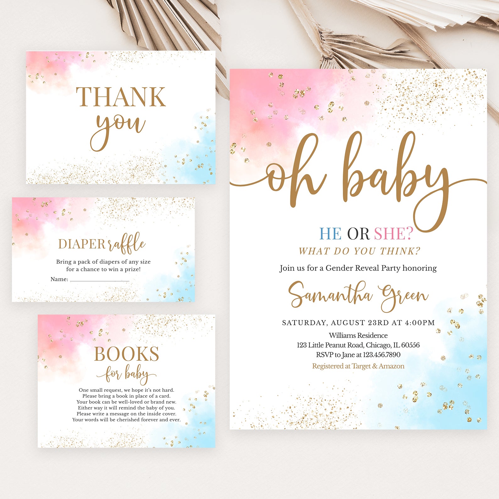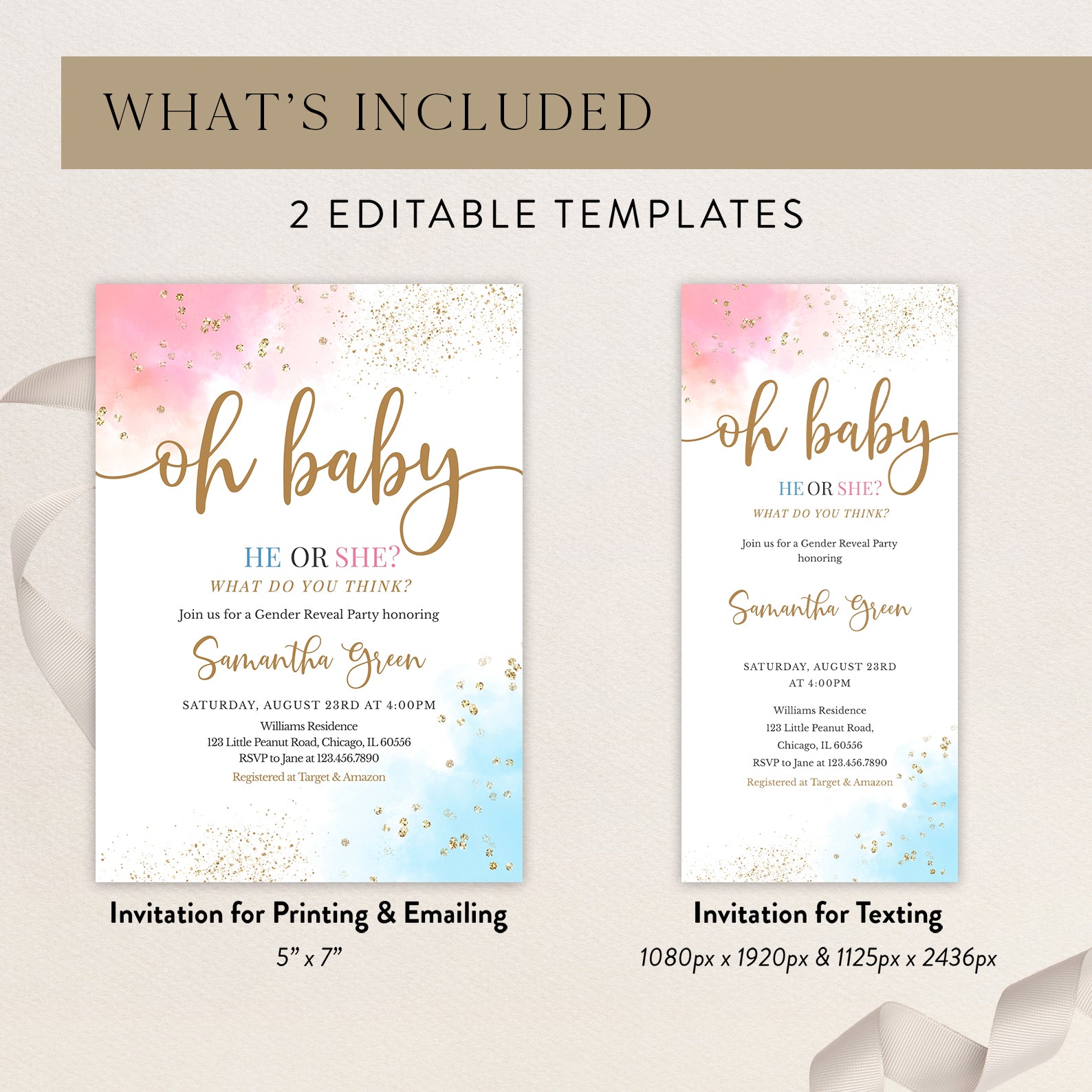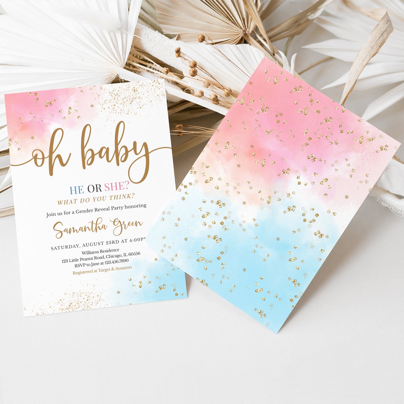 - Purchase this Oh Baby Gender Reveal Digital Invite Bundle, Pink Blue Gold Accents template