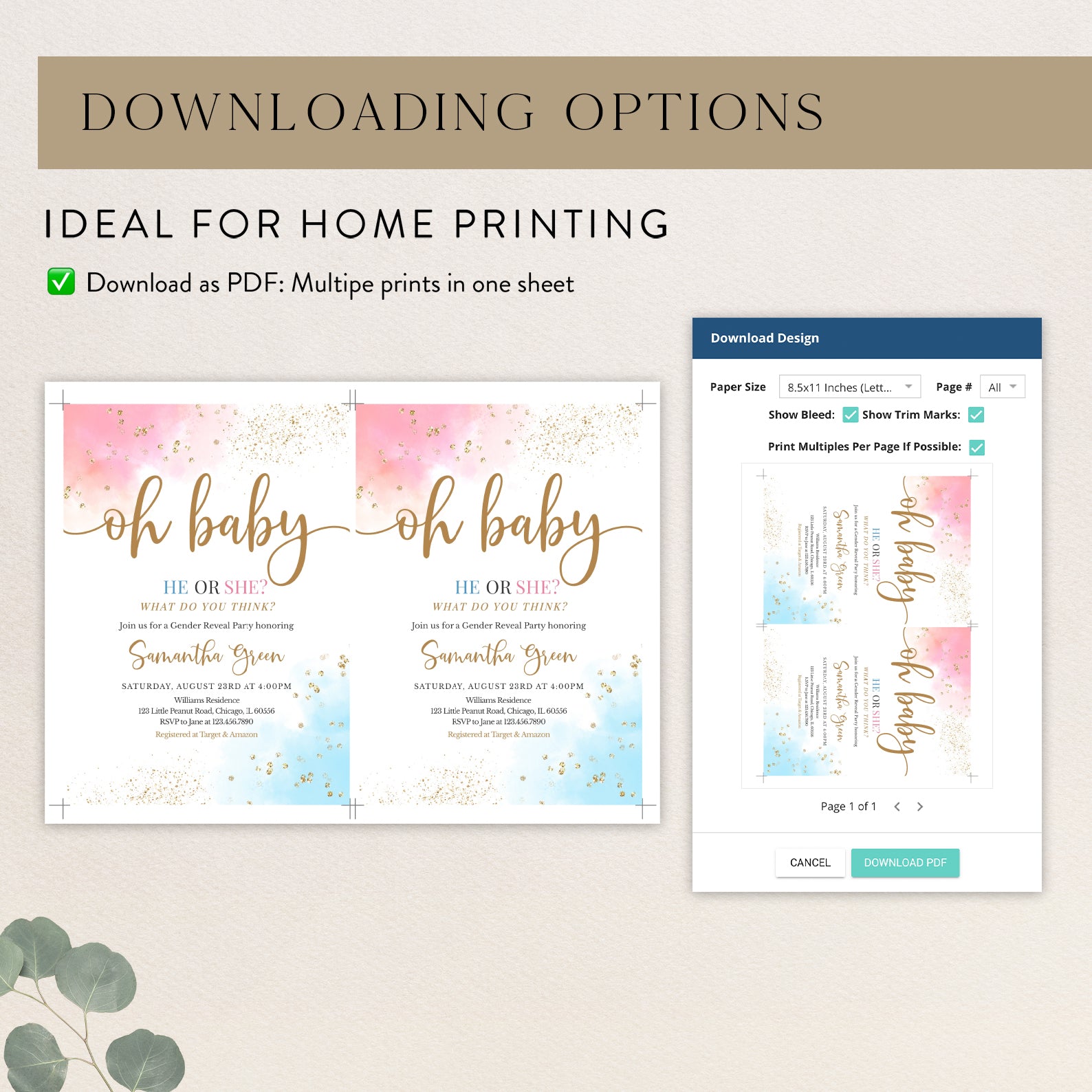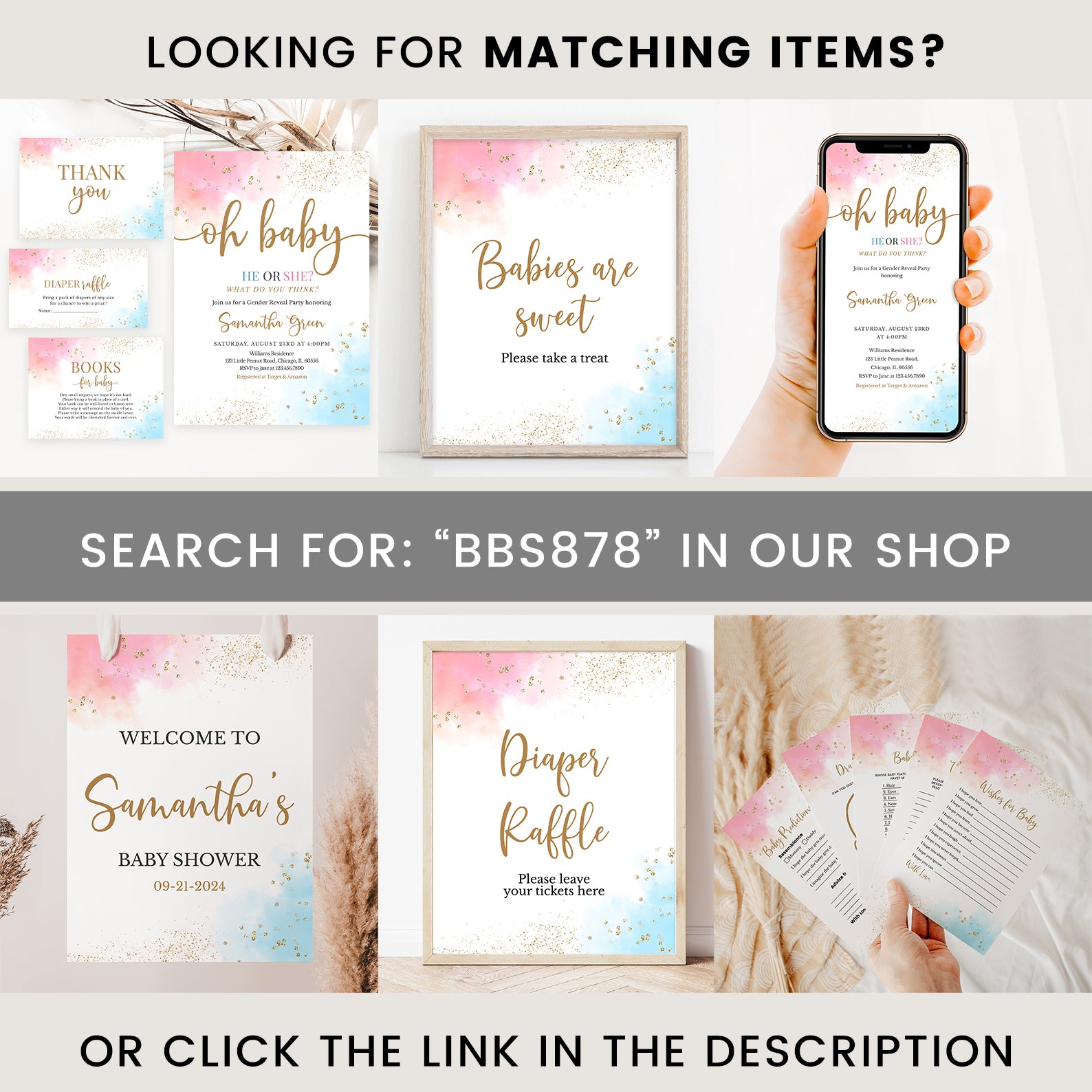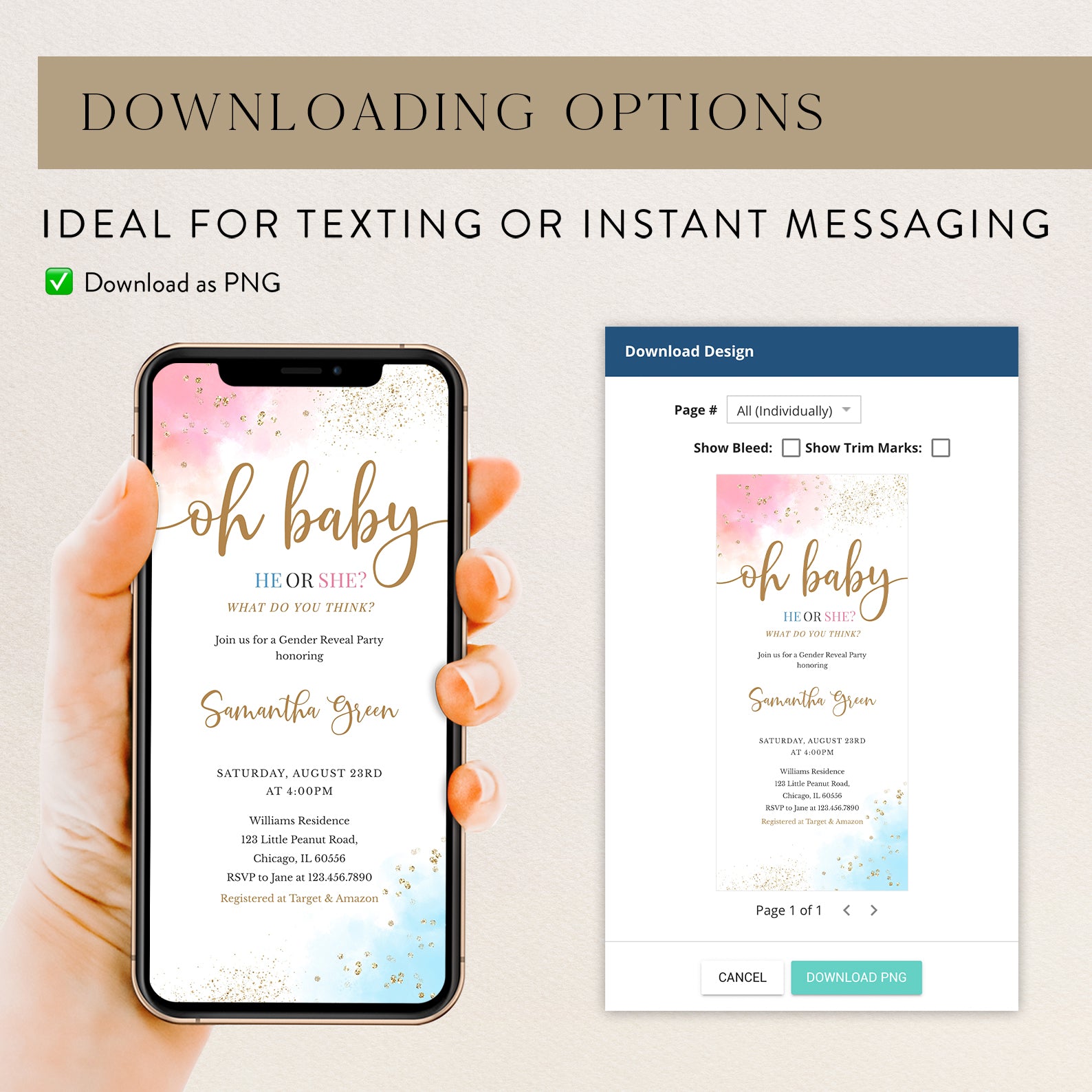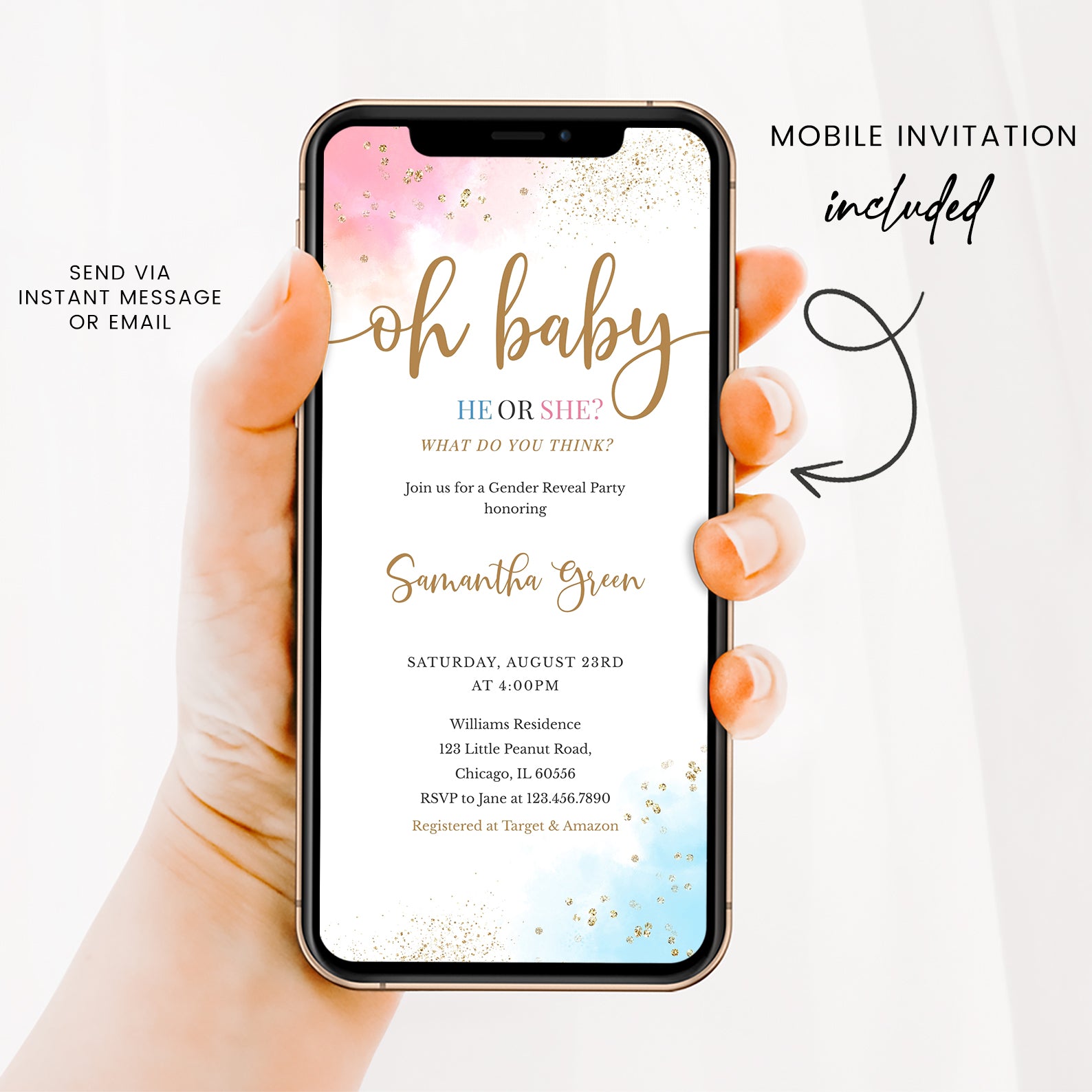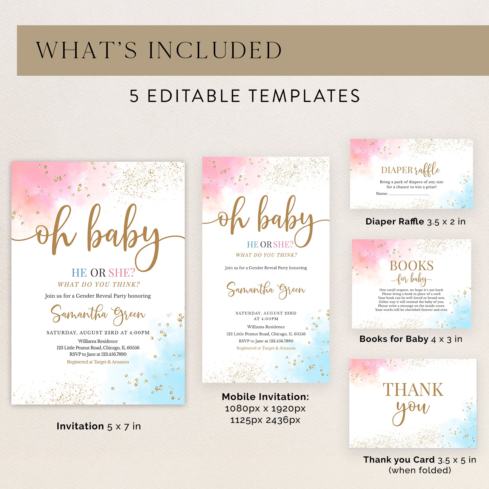 - Purchase this Oh Baby Gender Reveal Digital Invite Bundle, Pink Blue Gold Accents template