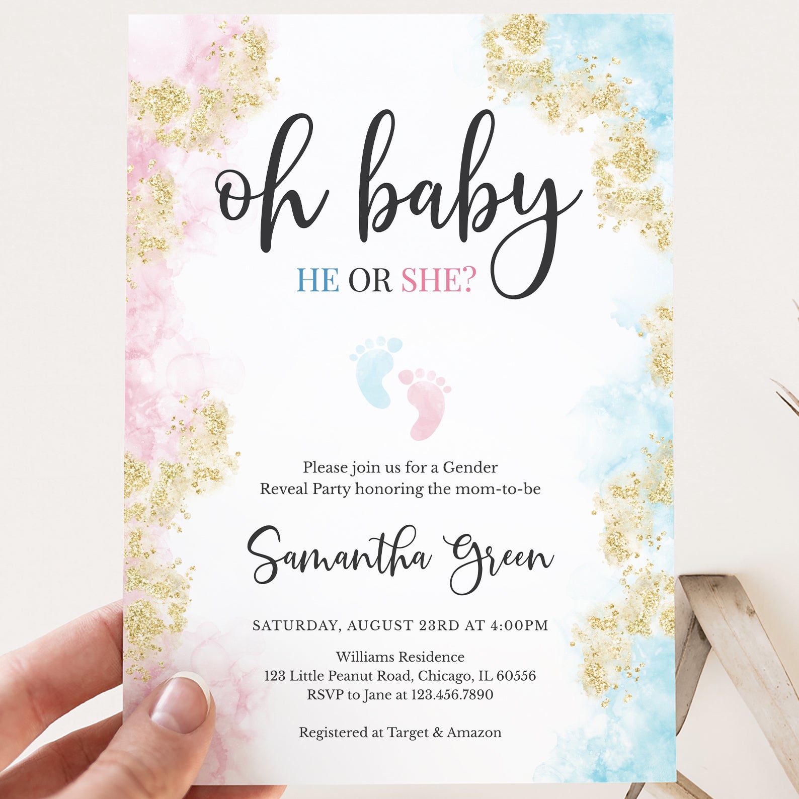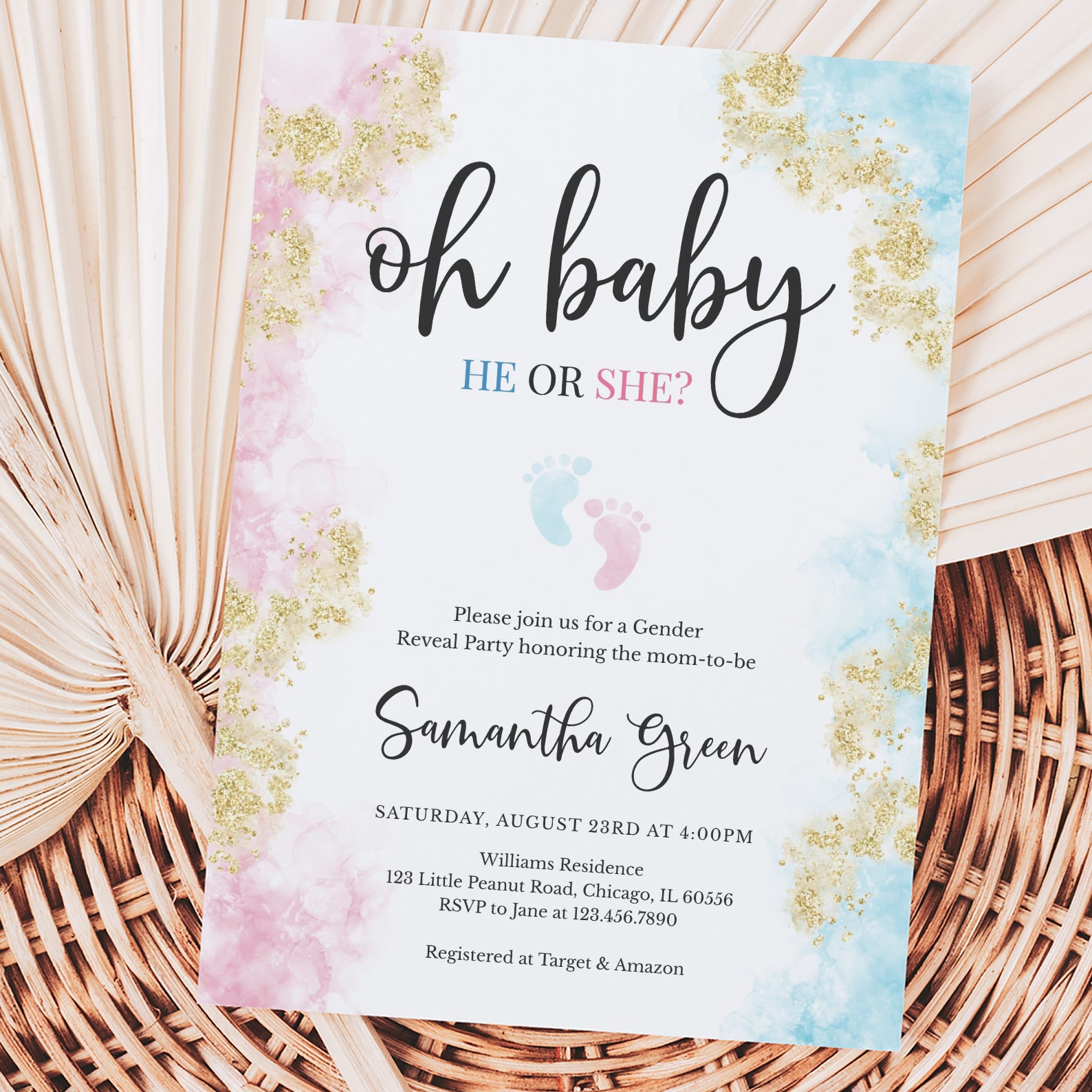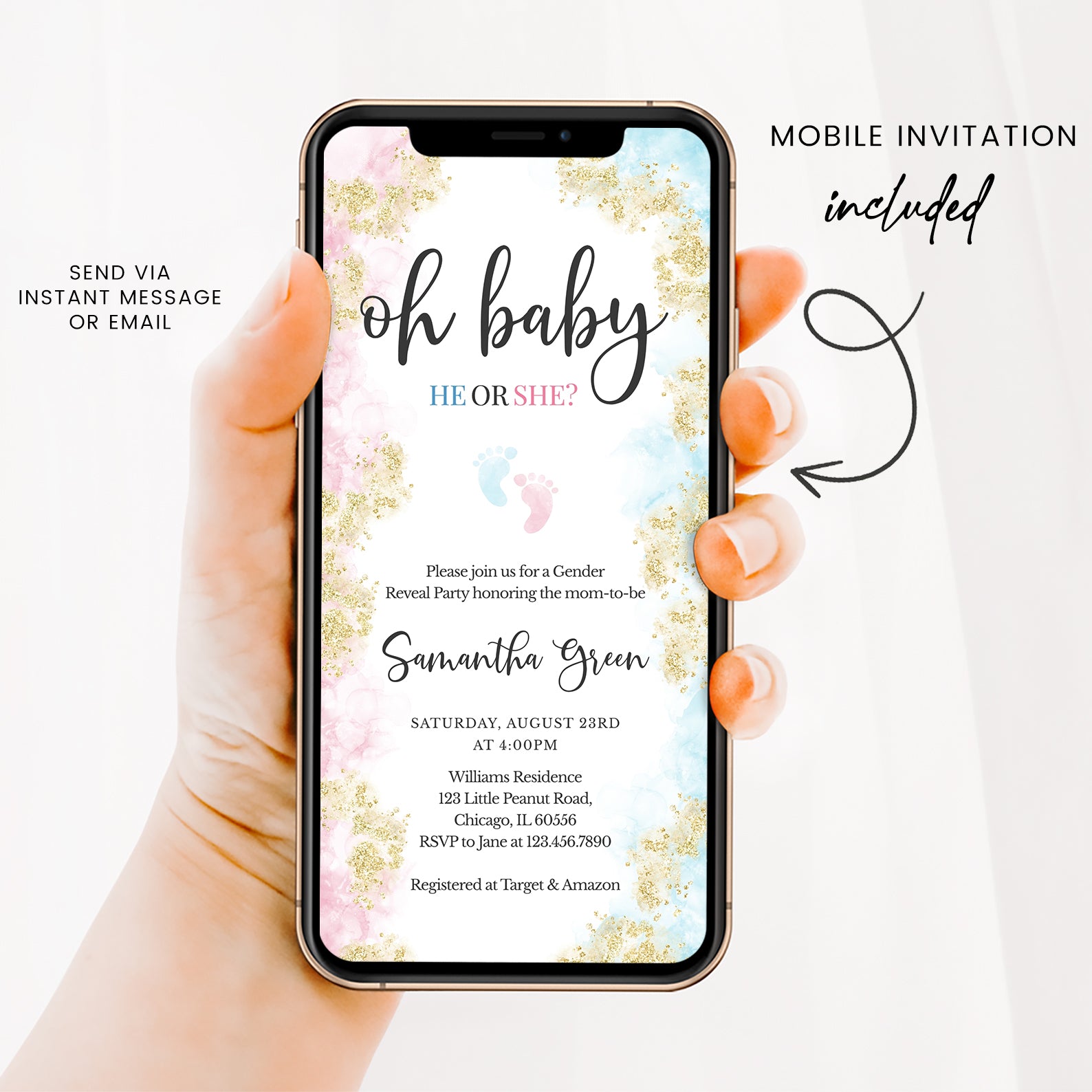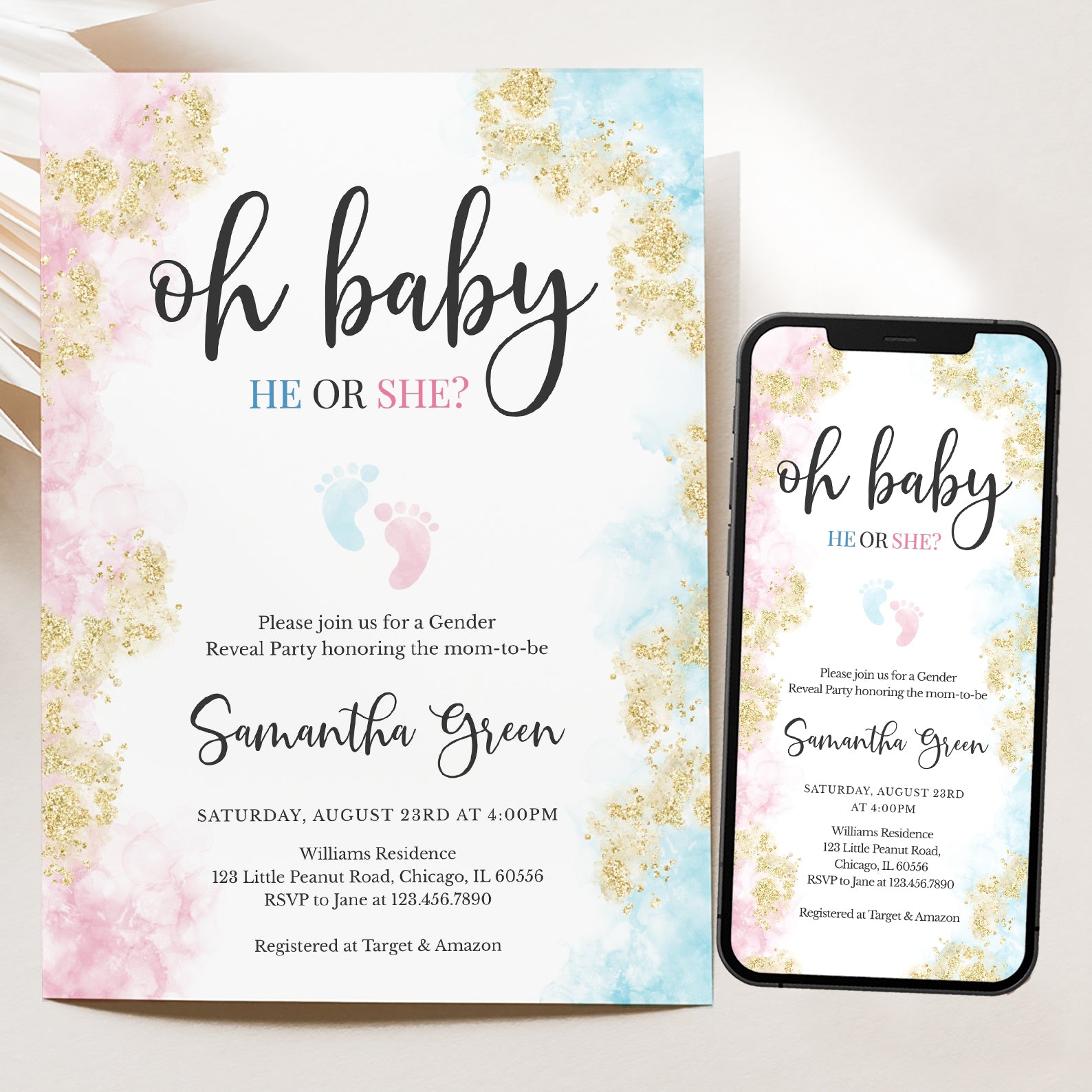 Celebrate your special moment with our charming gender reveal digital invitation, "Oh Baby." Featuring adorable tiny little feet at the center, this design beautifully balances pastel pink and blue hues, symbolizing the excitement of your upcoming arrival. The elegant gold accents add a touch of sophistication, making it perfect for sharing the big news with family and friends. Effortlessly customizable and easy to send, this invitation sets the tone for a memorable celebration. Get ready to reveal the joy in style!