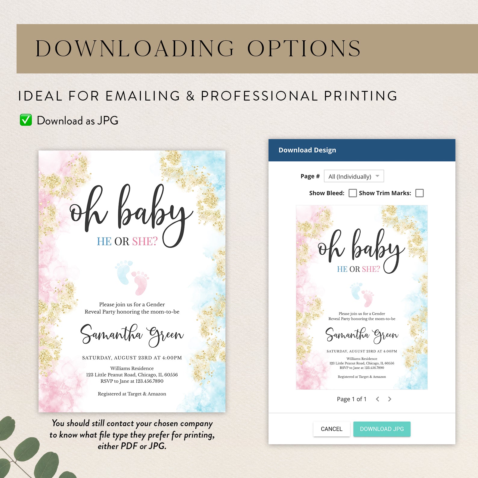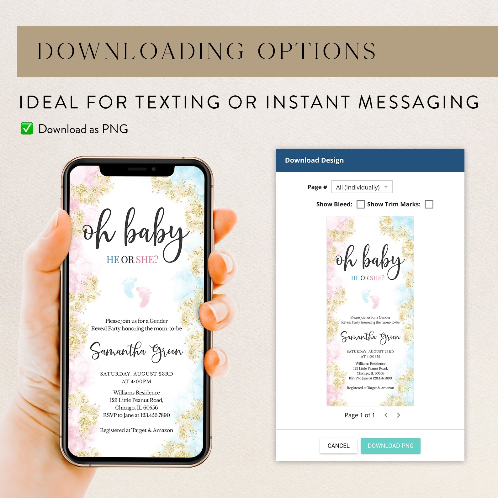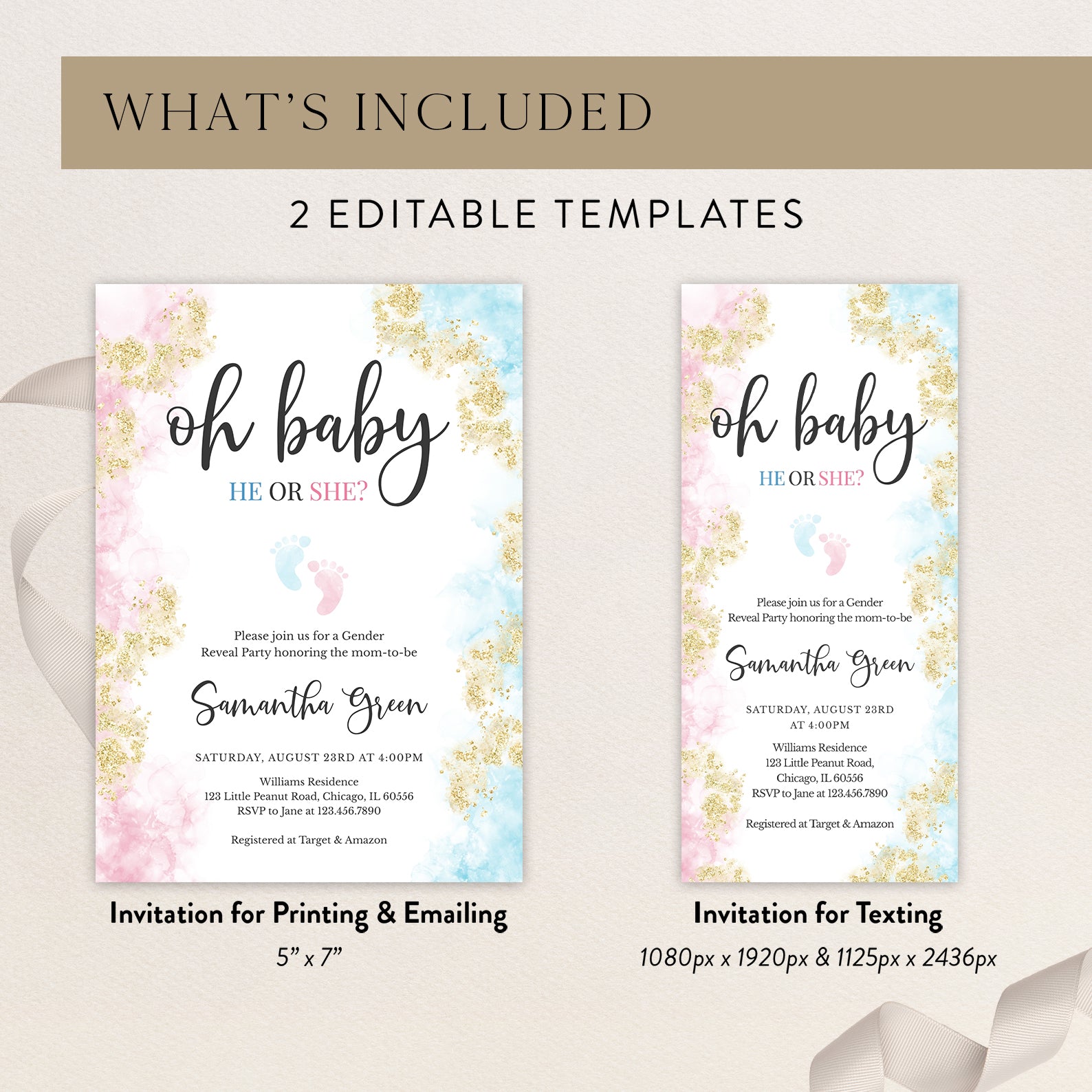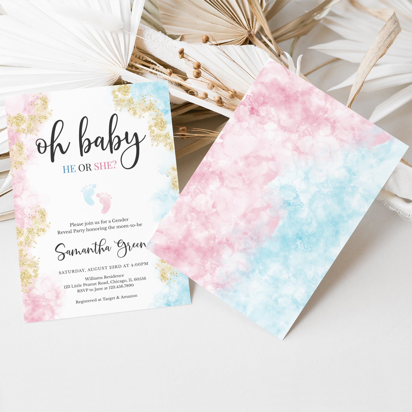 - Purchase this Pink and Blue Oh Baby Gender Reveal Digital Invitation template