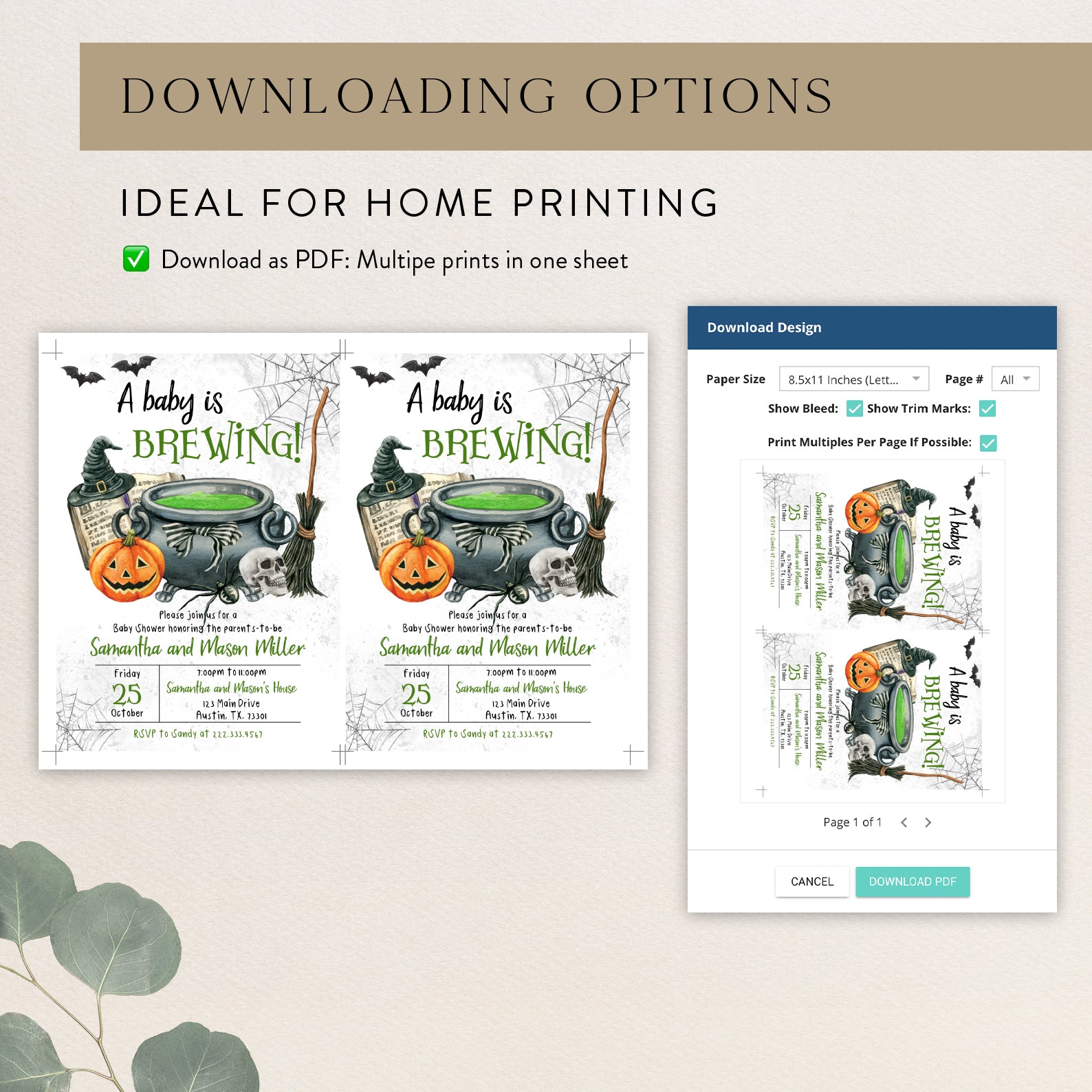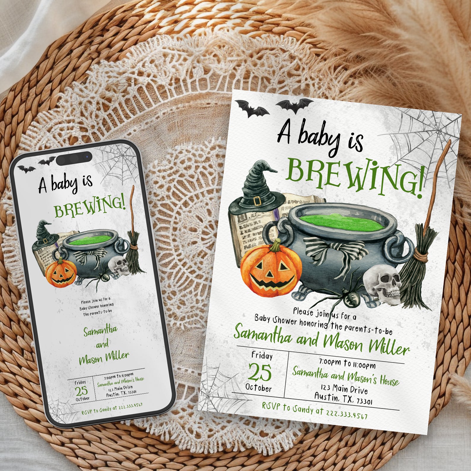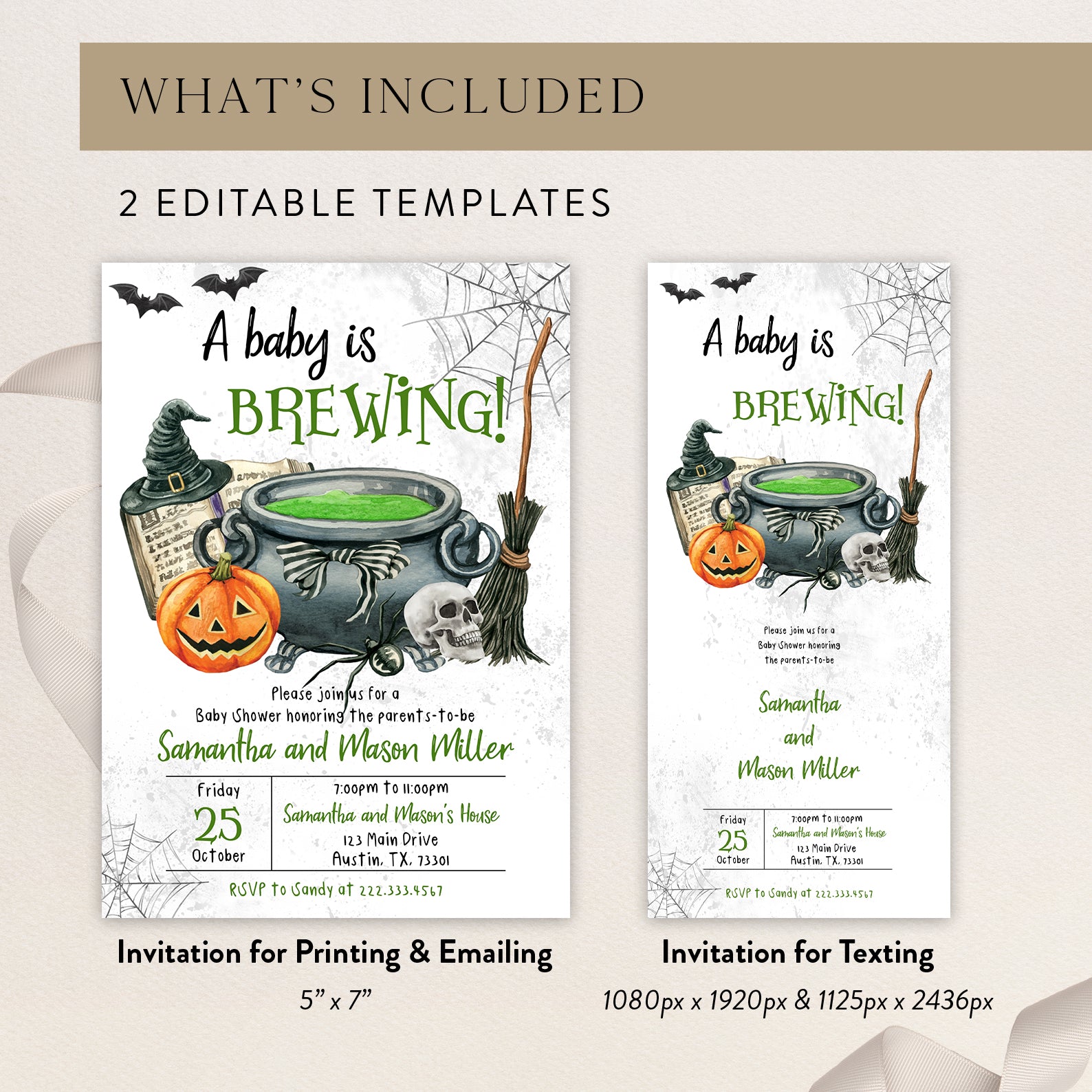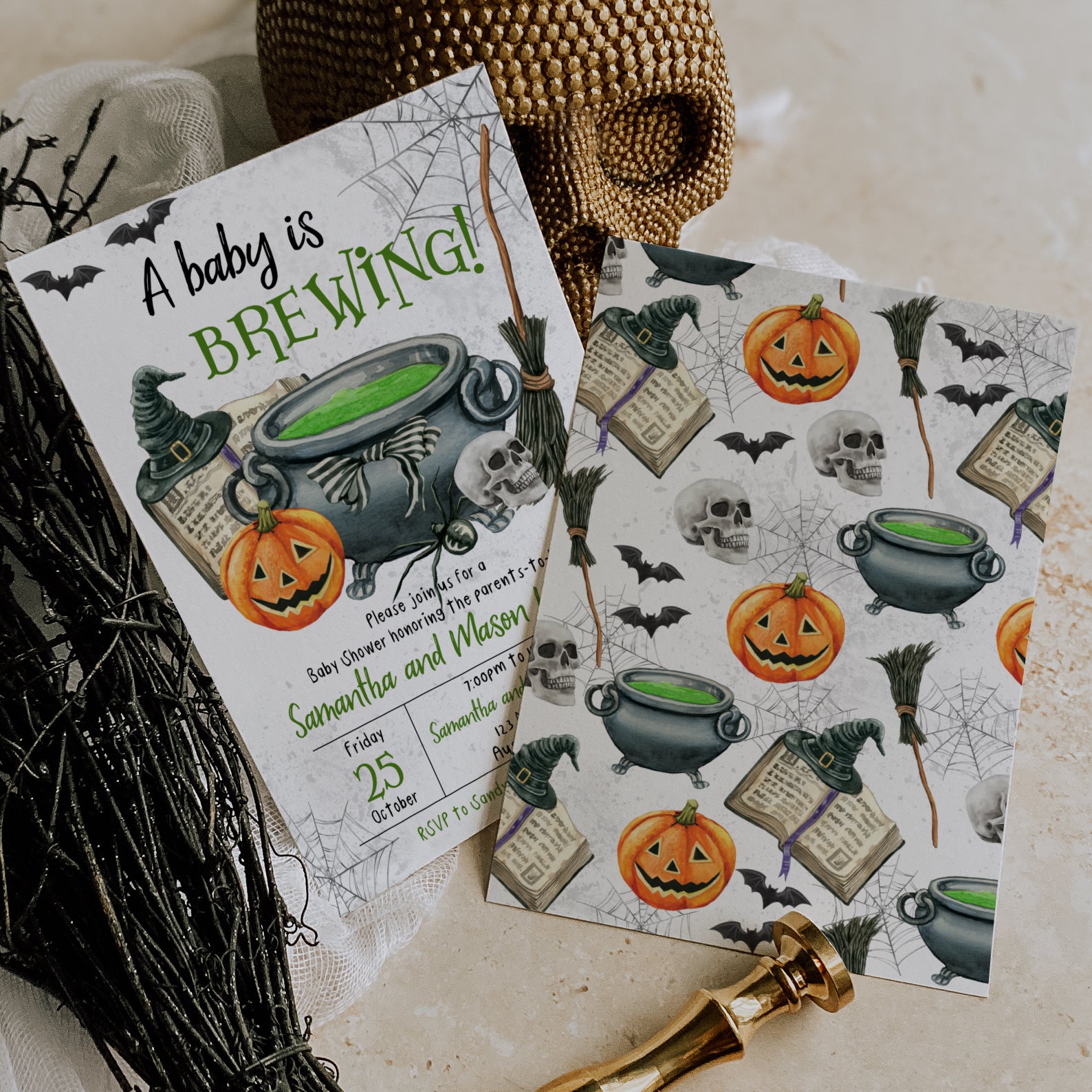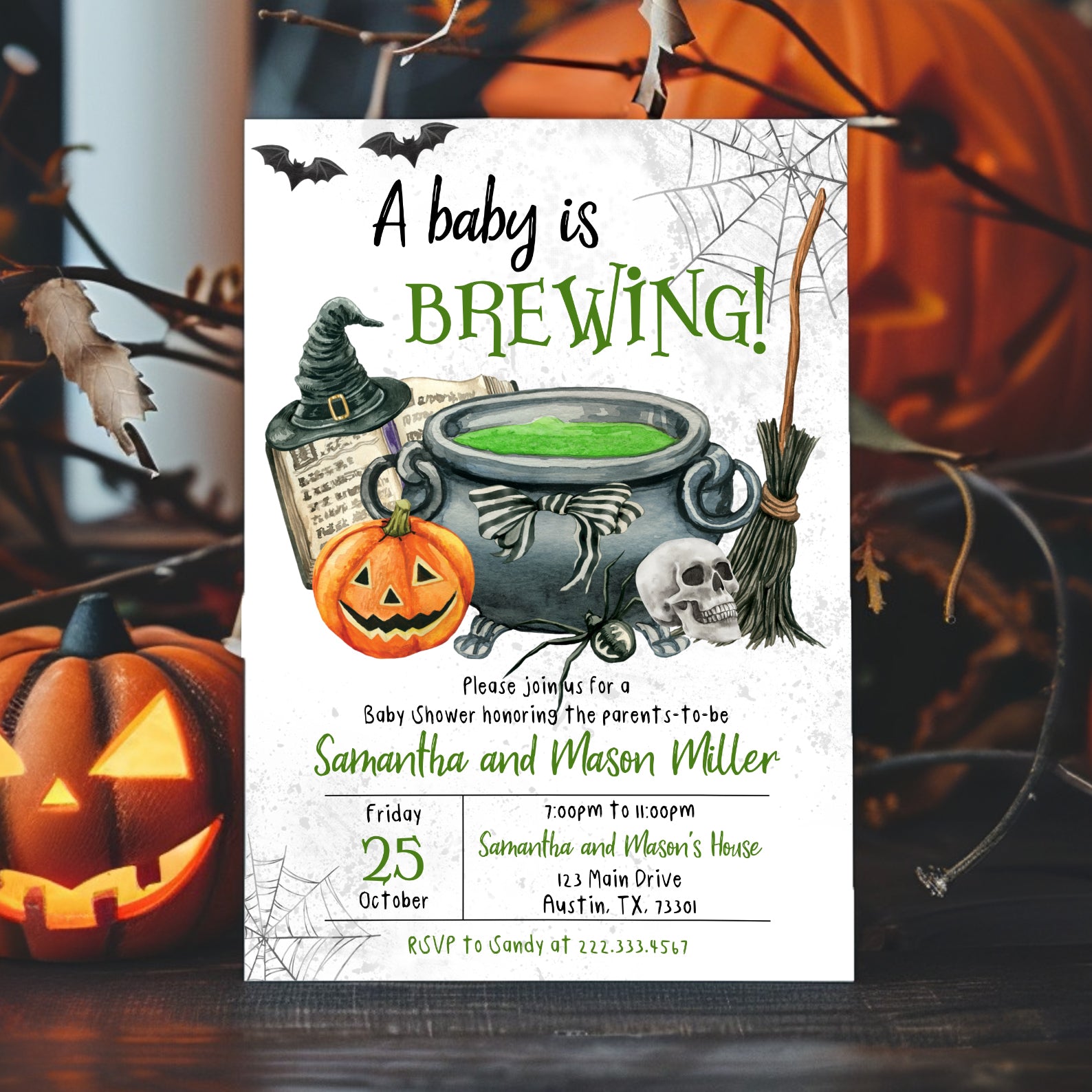 - Purchase this A Baby is Brewing: Whimsical Halloween Green Baby Shower Invite! template