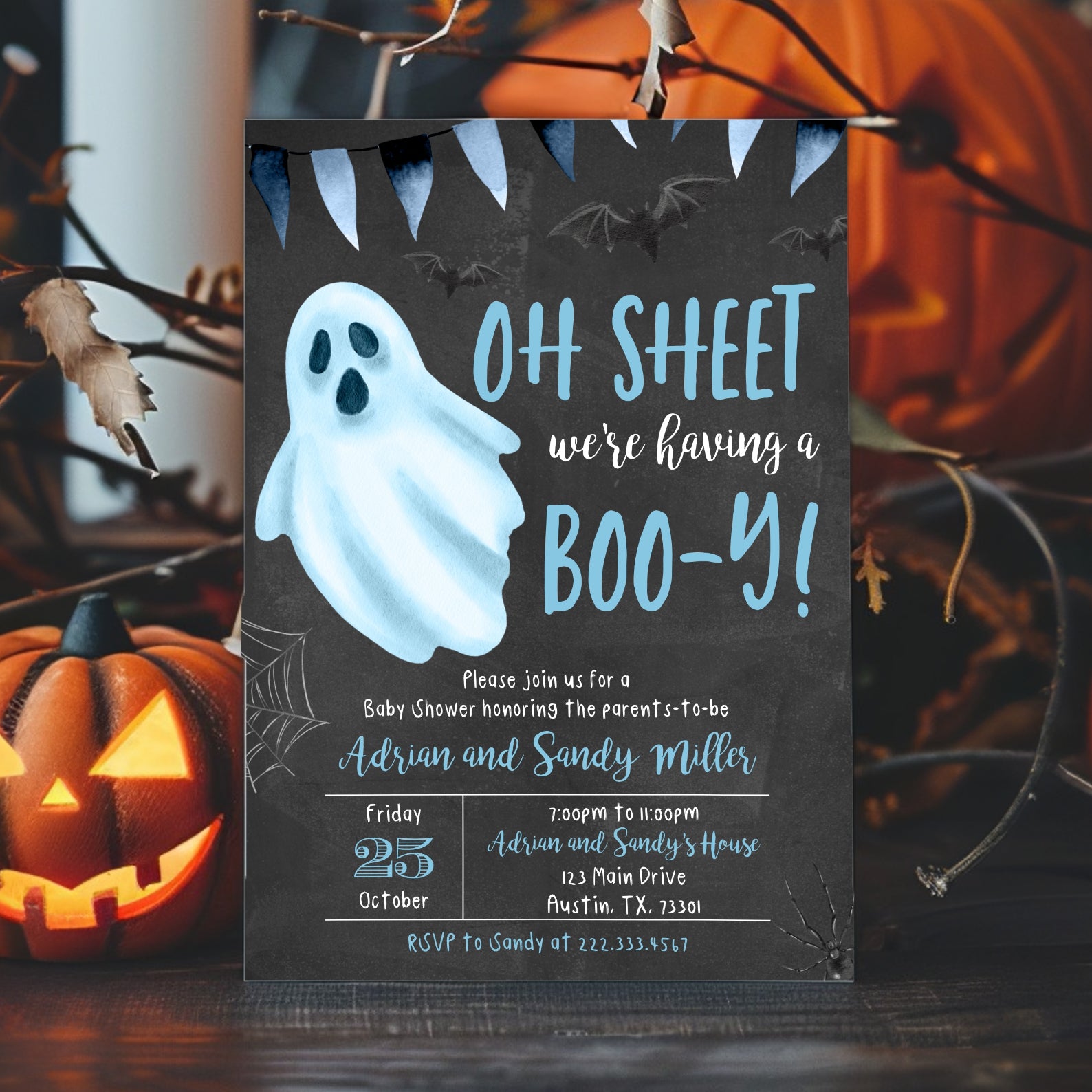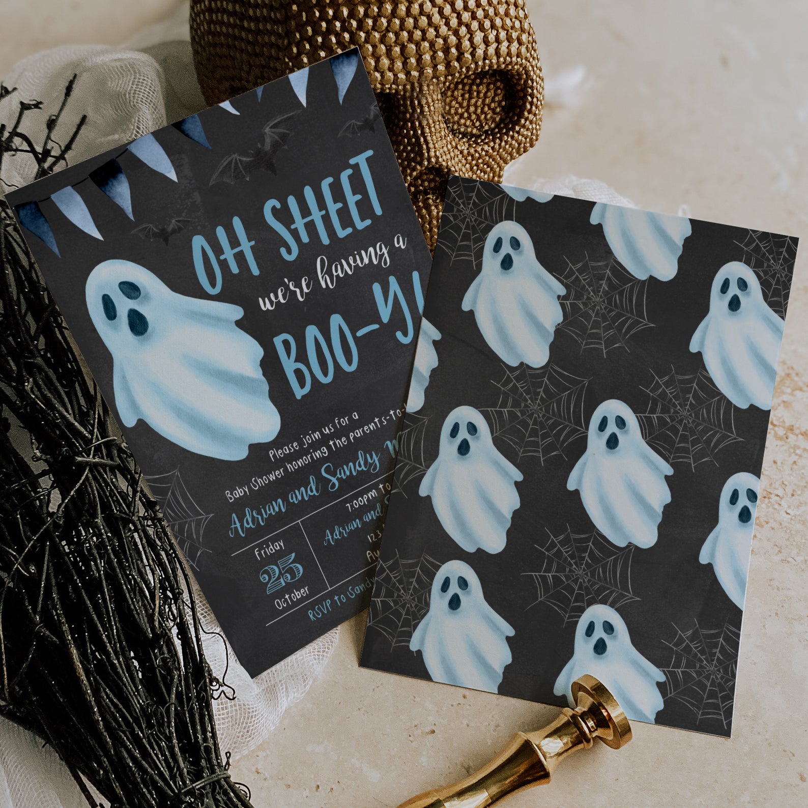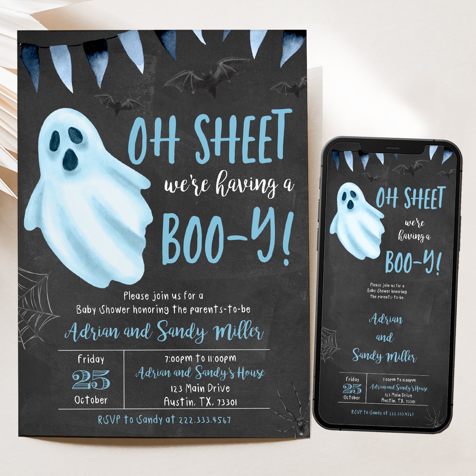 - Purchase this Oh Sheet Boo-y Blue Baby Shower Digital Invite: Spooky Fun Awaits! template