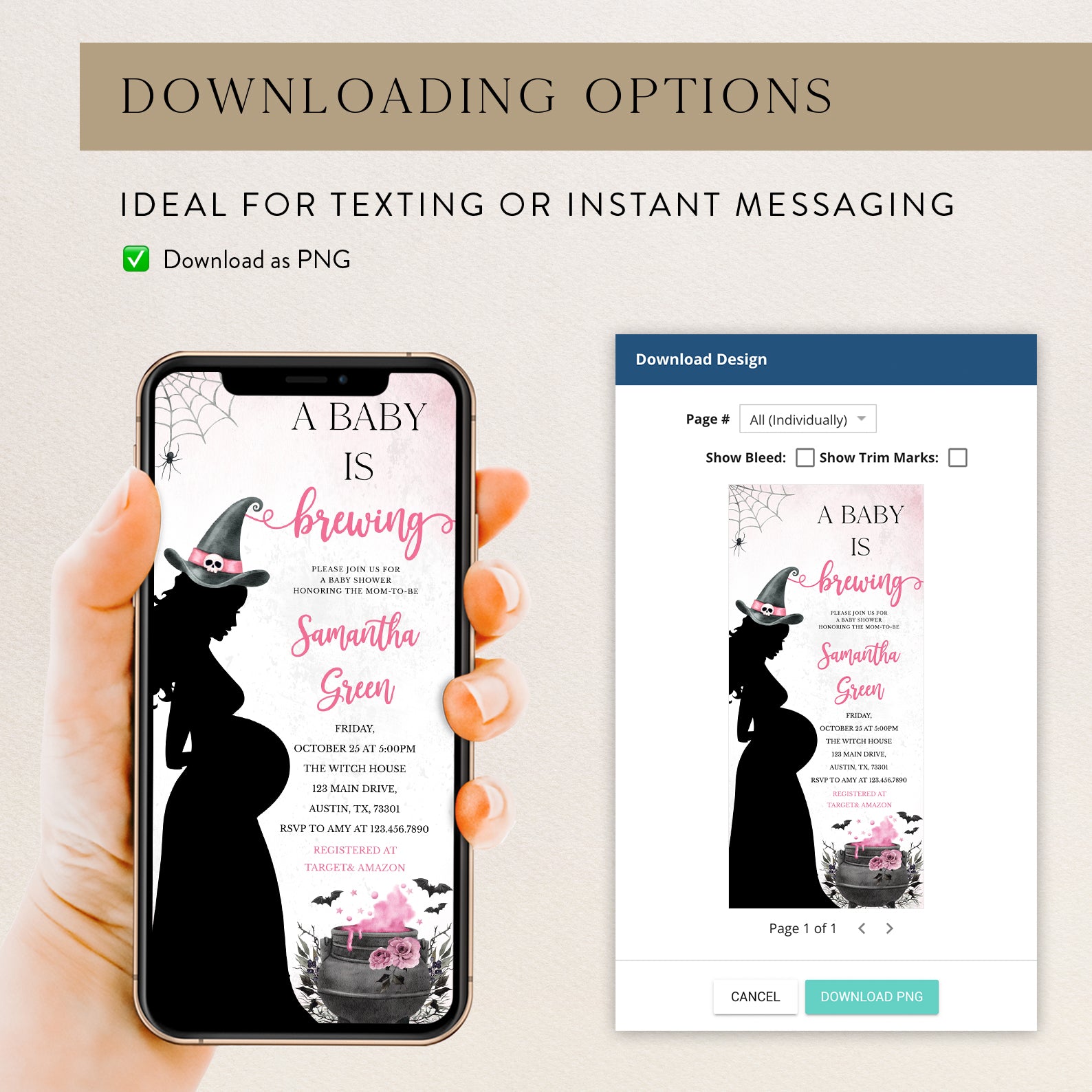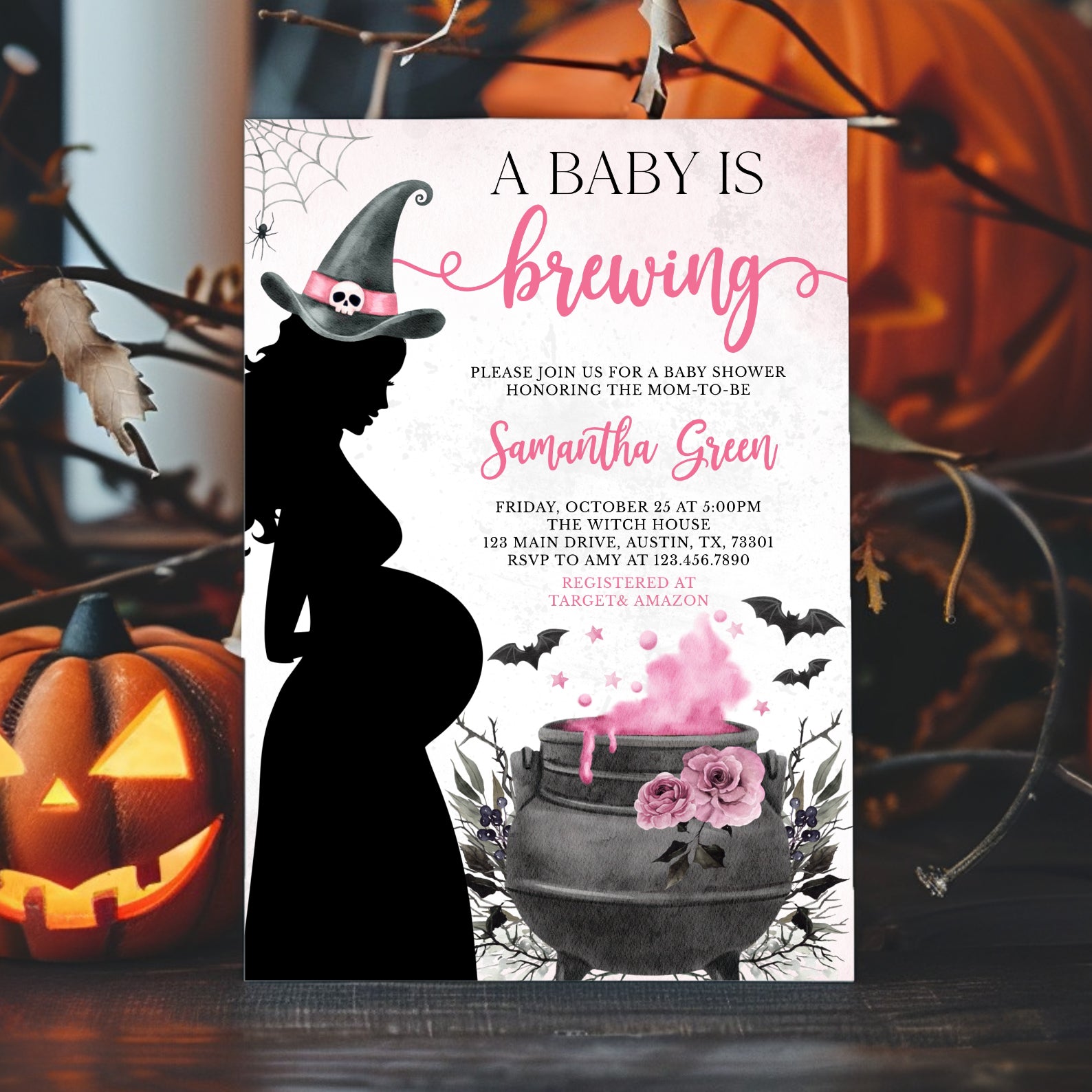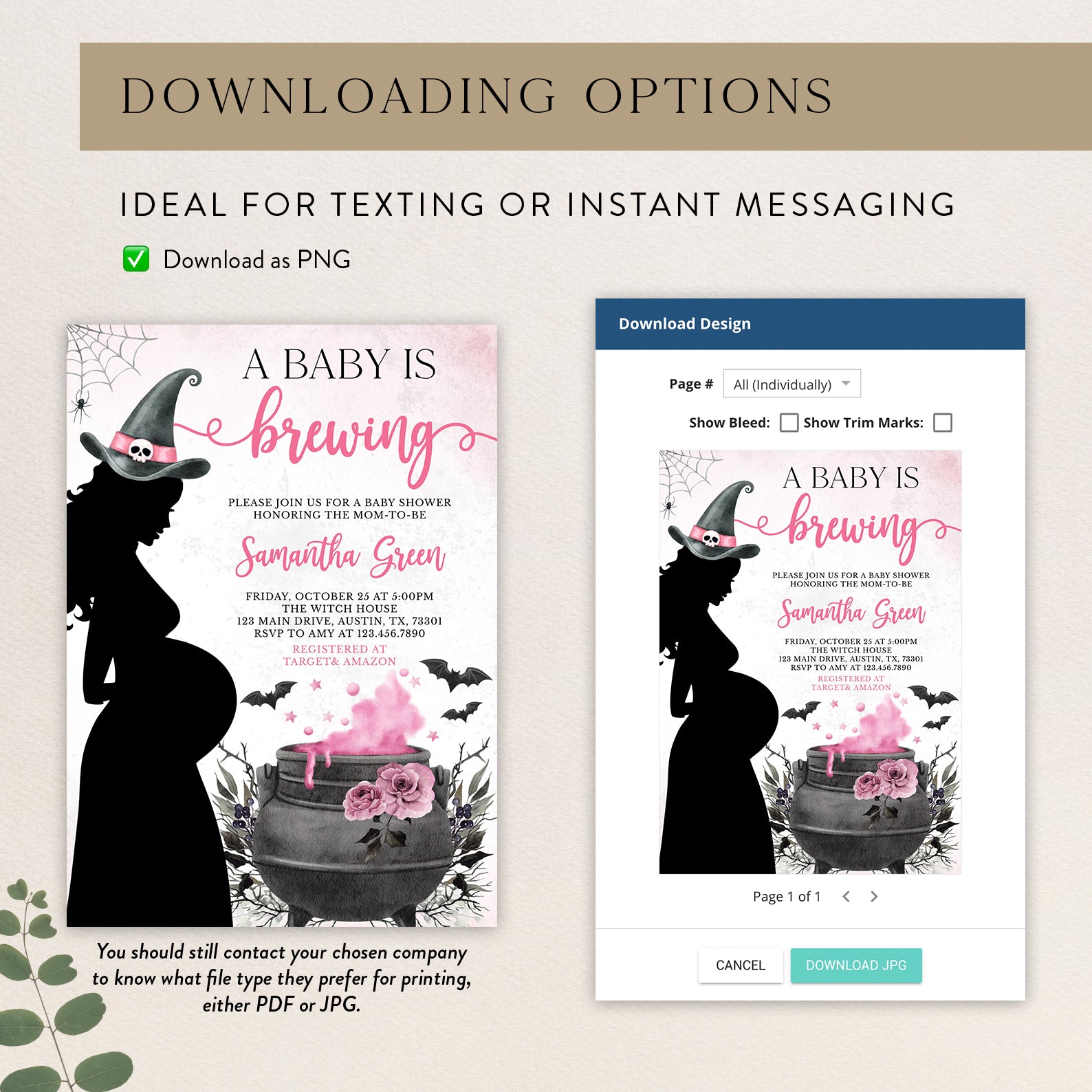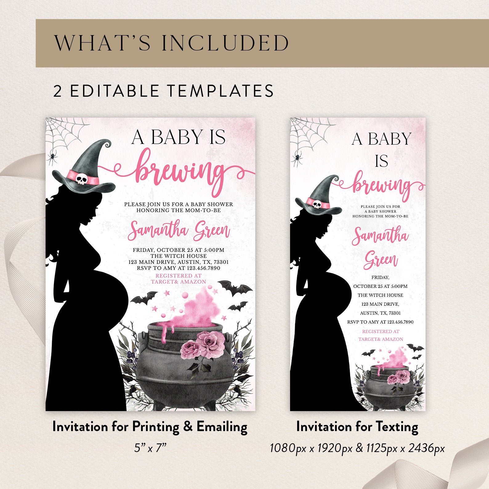 Cast a spell for your little one’s arrival with our enchanting "Baby is Brewing" digital invitation! Available in vibrant colors like red, green, purple, orange, blue, and pink, this whimsical design features a playful spider and web at the top, alongside a charming pregnant witch brewing a potion in her cauldron. Adorned with roses and flying bats, the potion-themed background adds a magical touch, making it the perfect invite for your spooky baby shower!