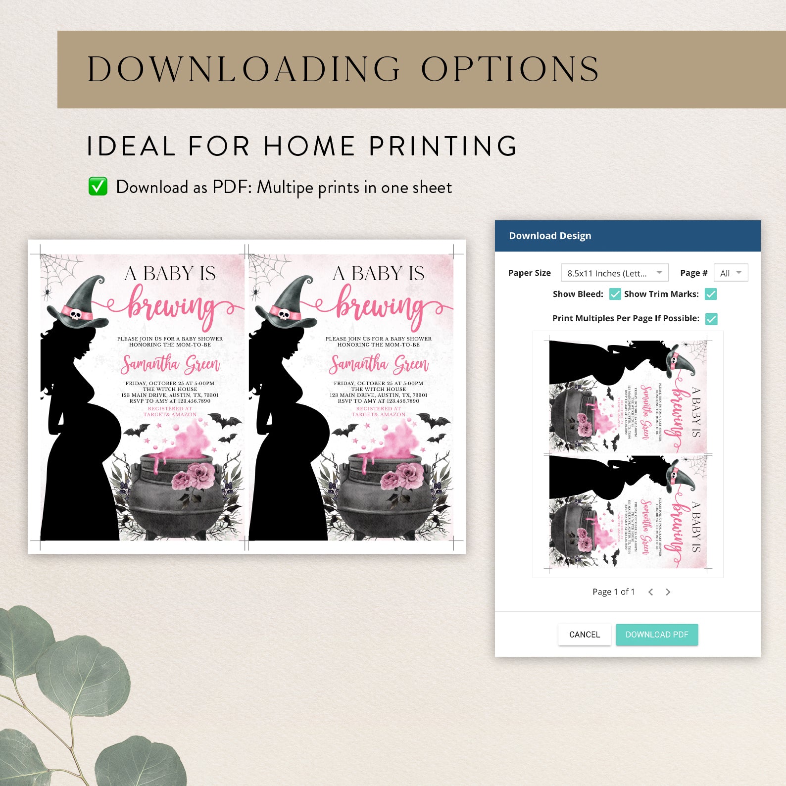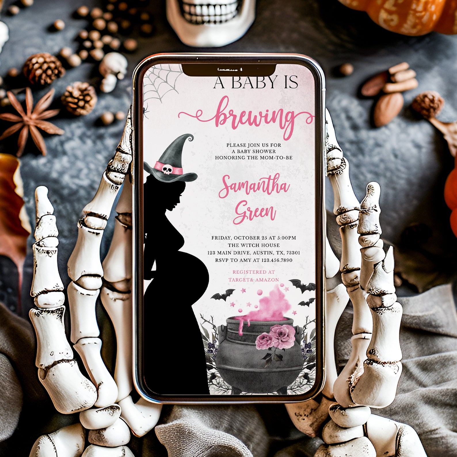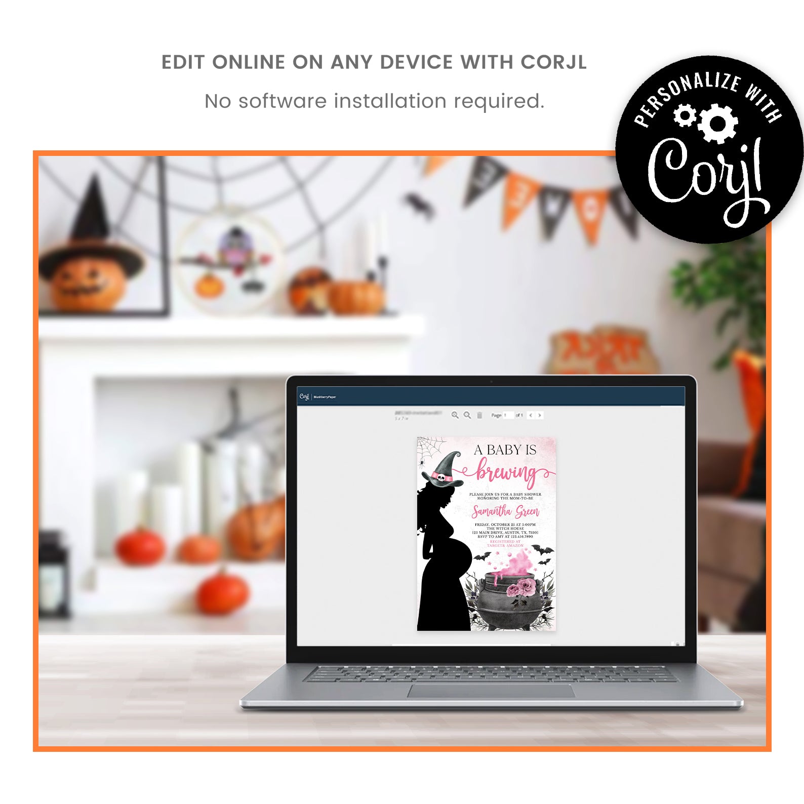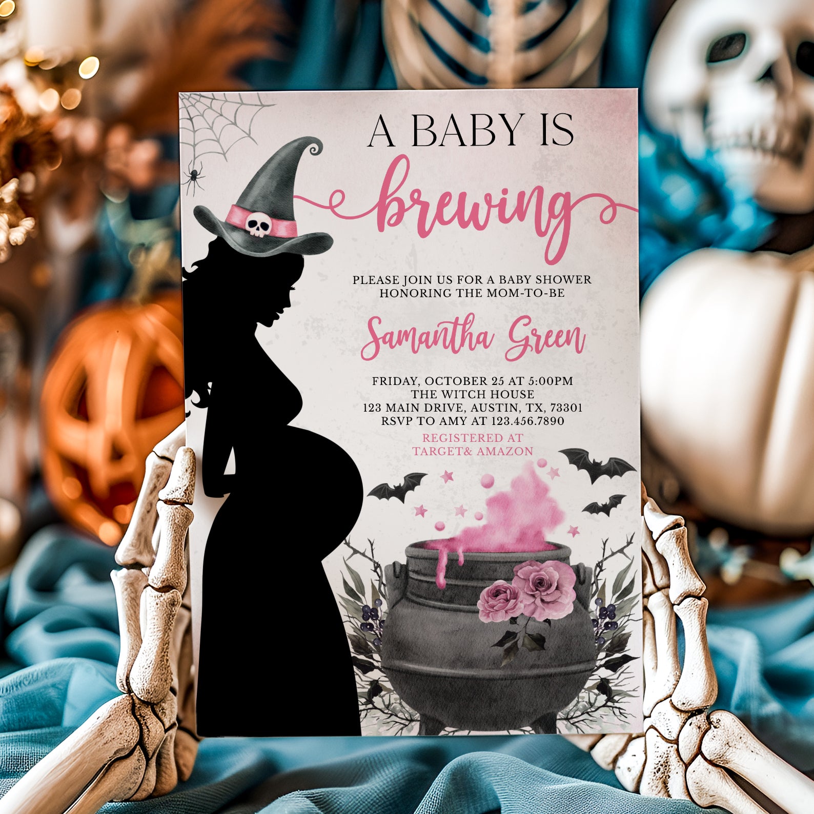 Cast a spell for your little one’s arrival with our enchanting "Baby is Brewing" digital invitation! Available in vibrant colors like red, green, purple, orange, blue, and pink, this whimsical design features a playful spider and web at the top, alongside a charming pregnant witch brewing a potion in her cauldron. Adorned with roses and flying bats, the potion-themed background adds a magical touch, making it the perfect invite for your spooky baby shower!