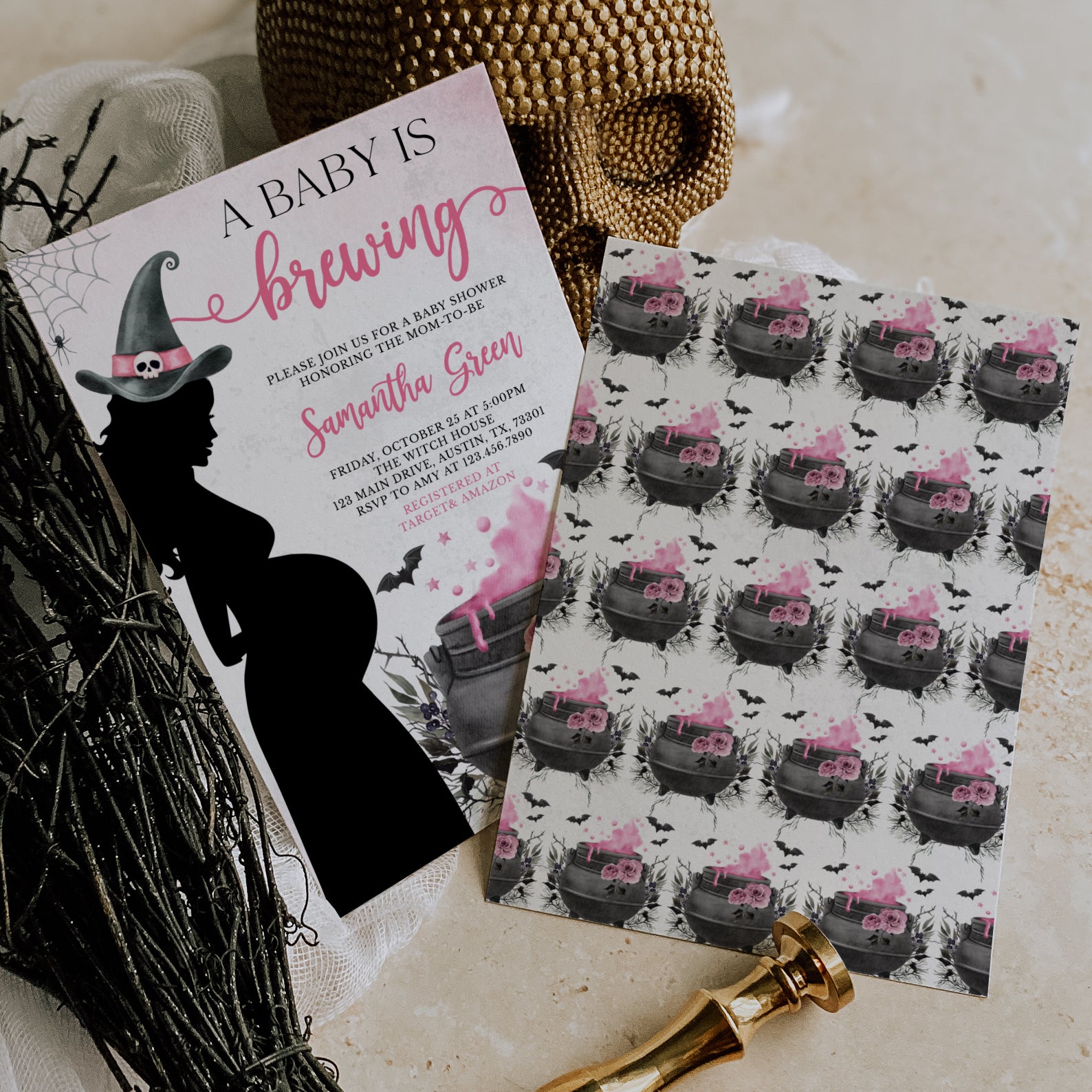 Spellbinding Pink Baby Shower Invite: Pregnant Witch & Cauldron