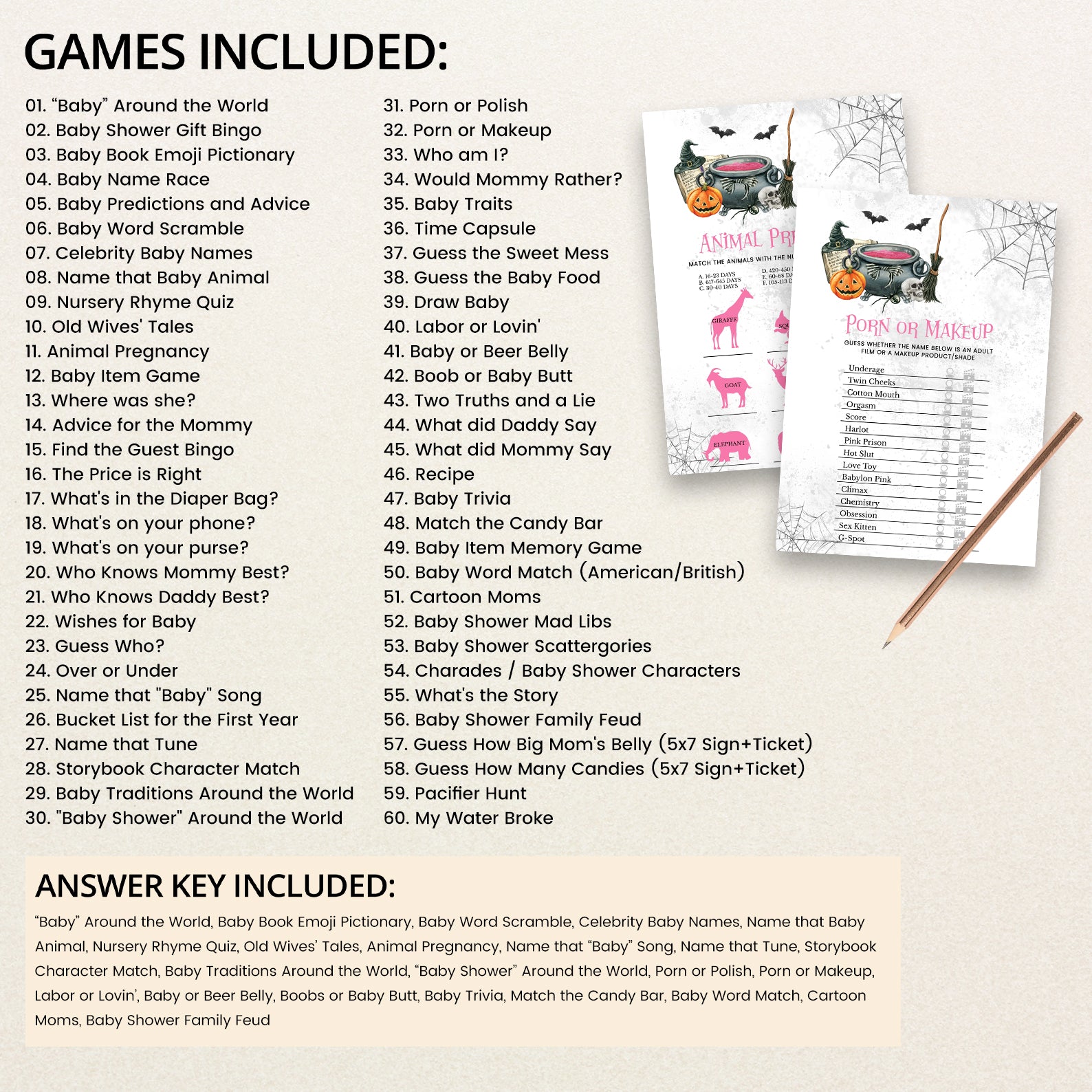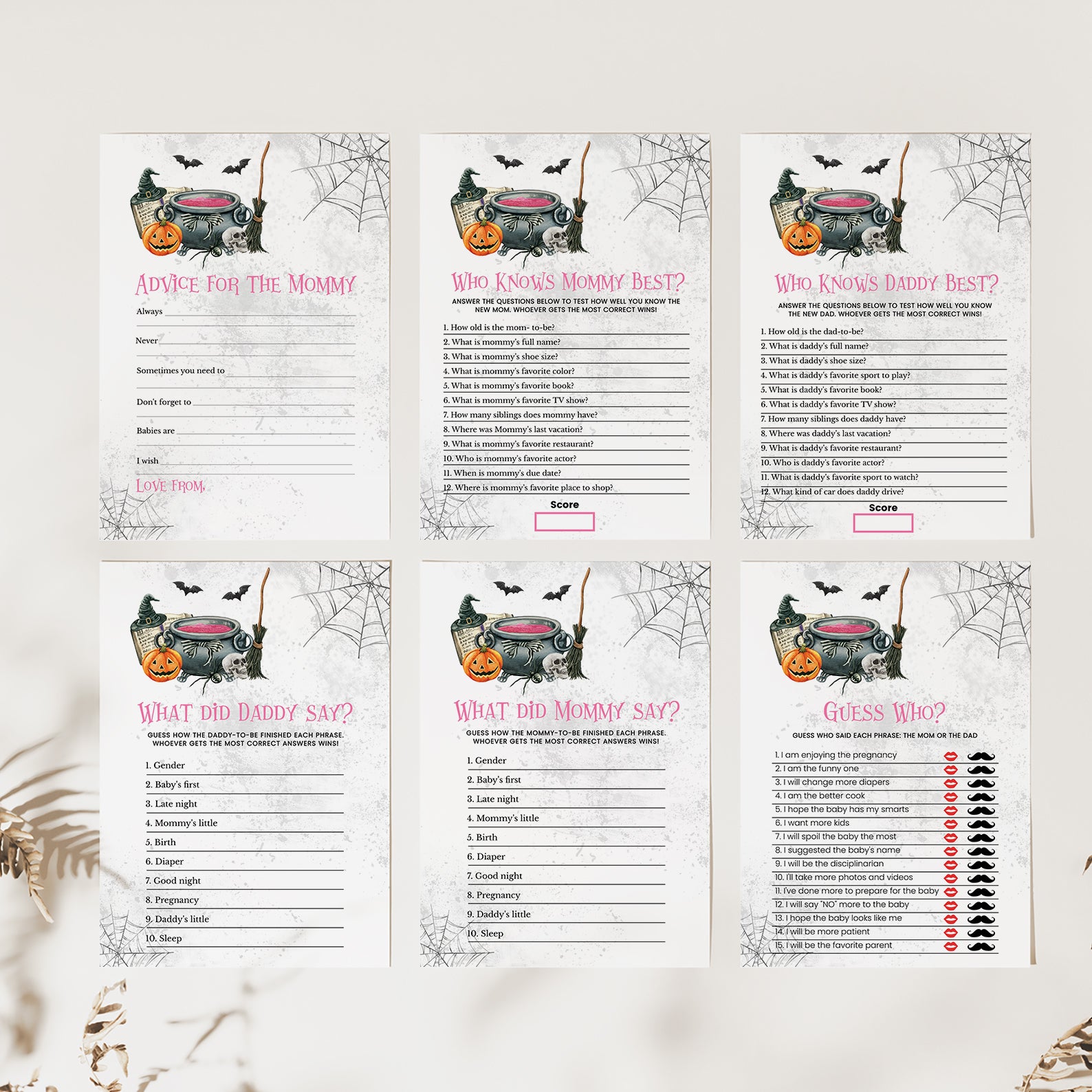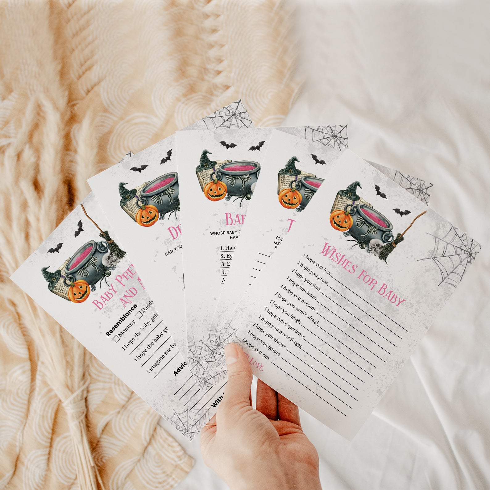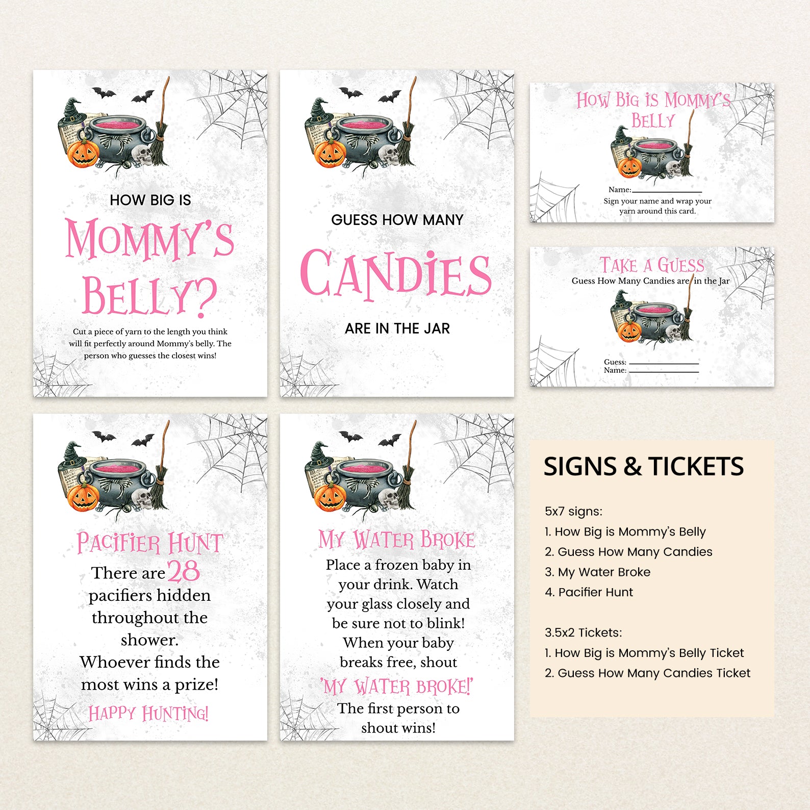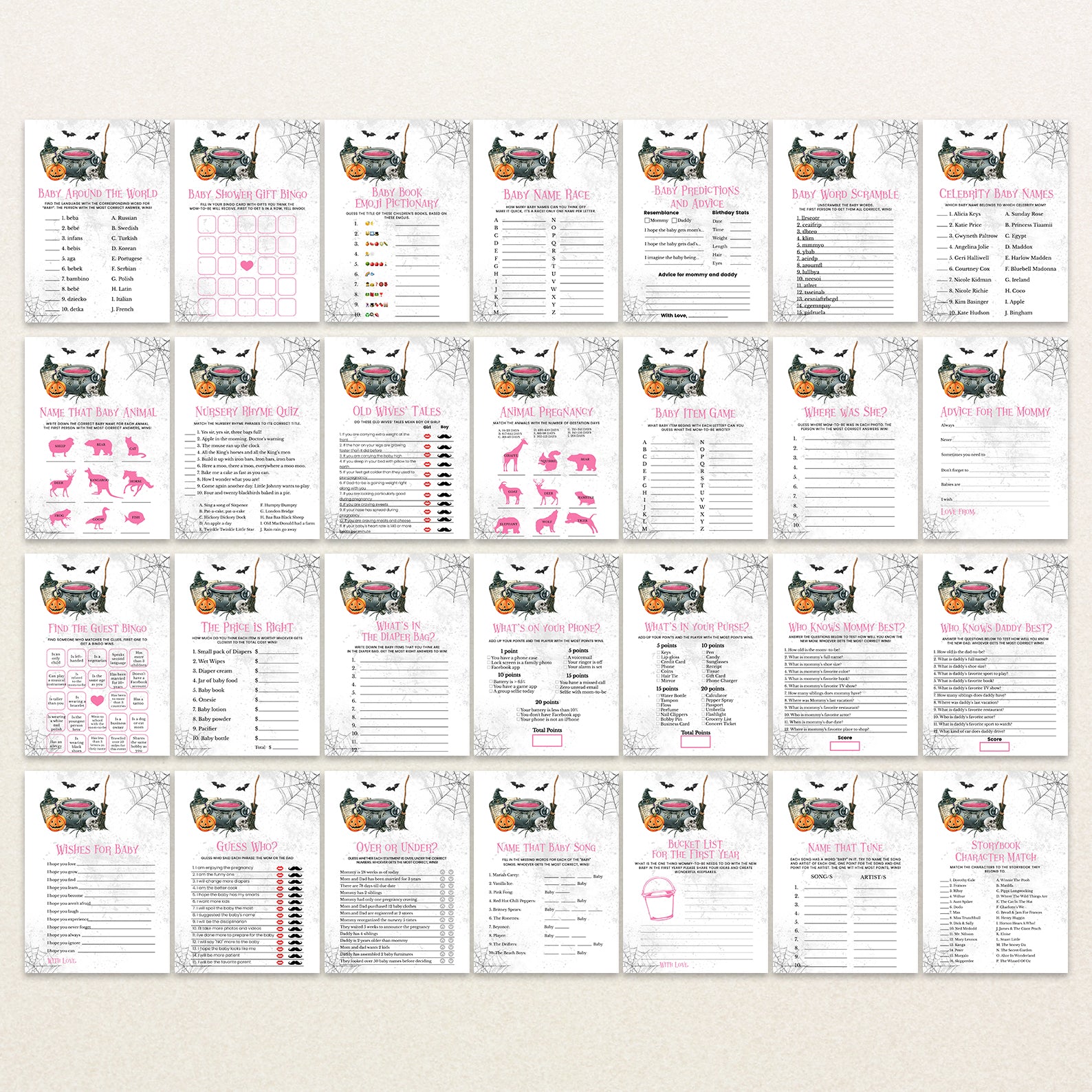 A Baby is Brewing: Whimsical Halloween Pink Baby Shower Game Bundle