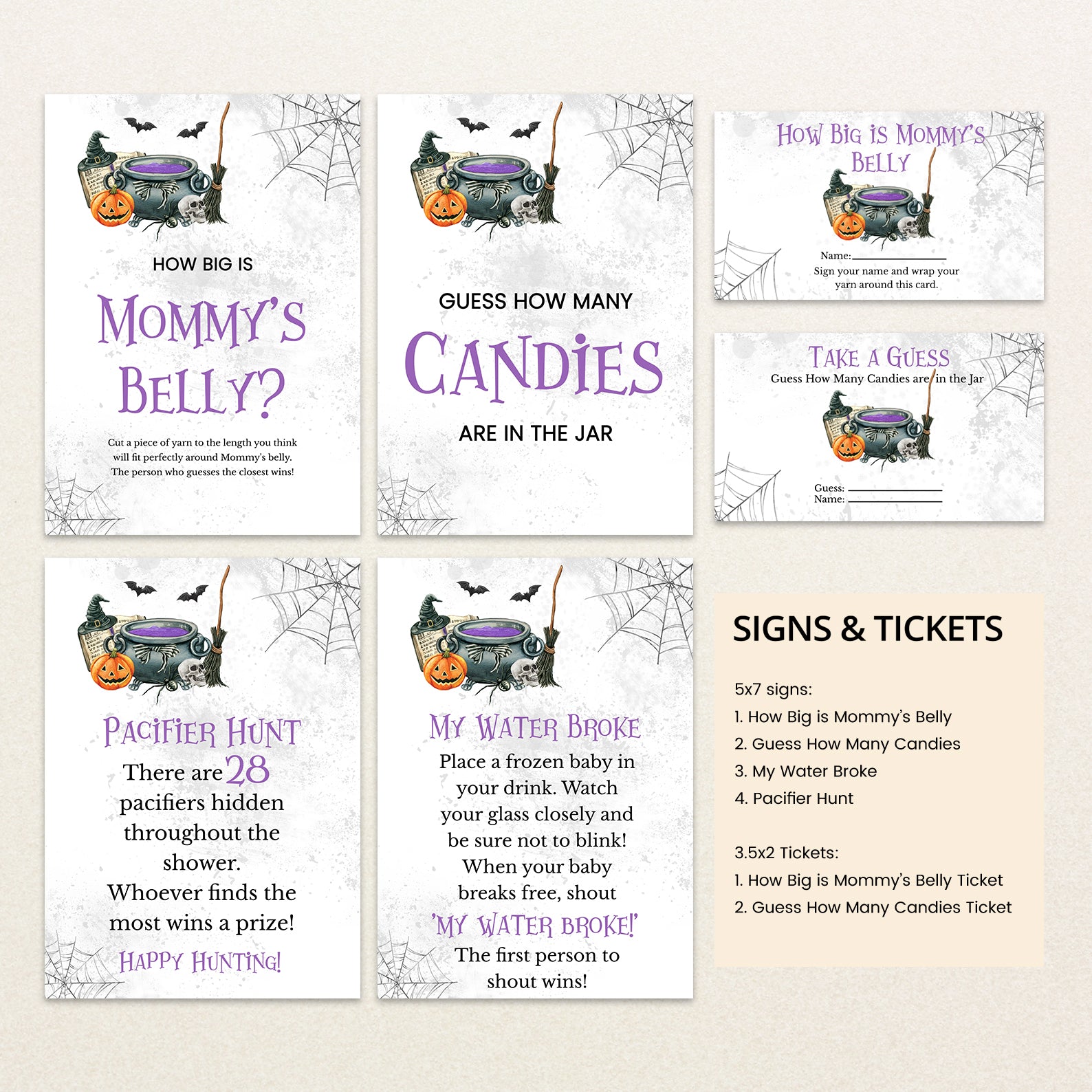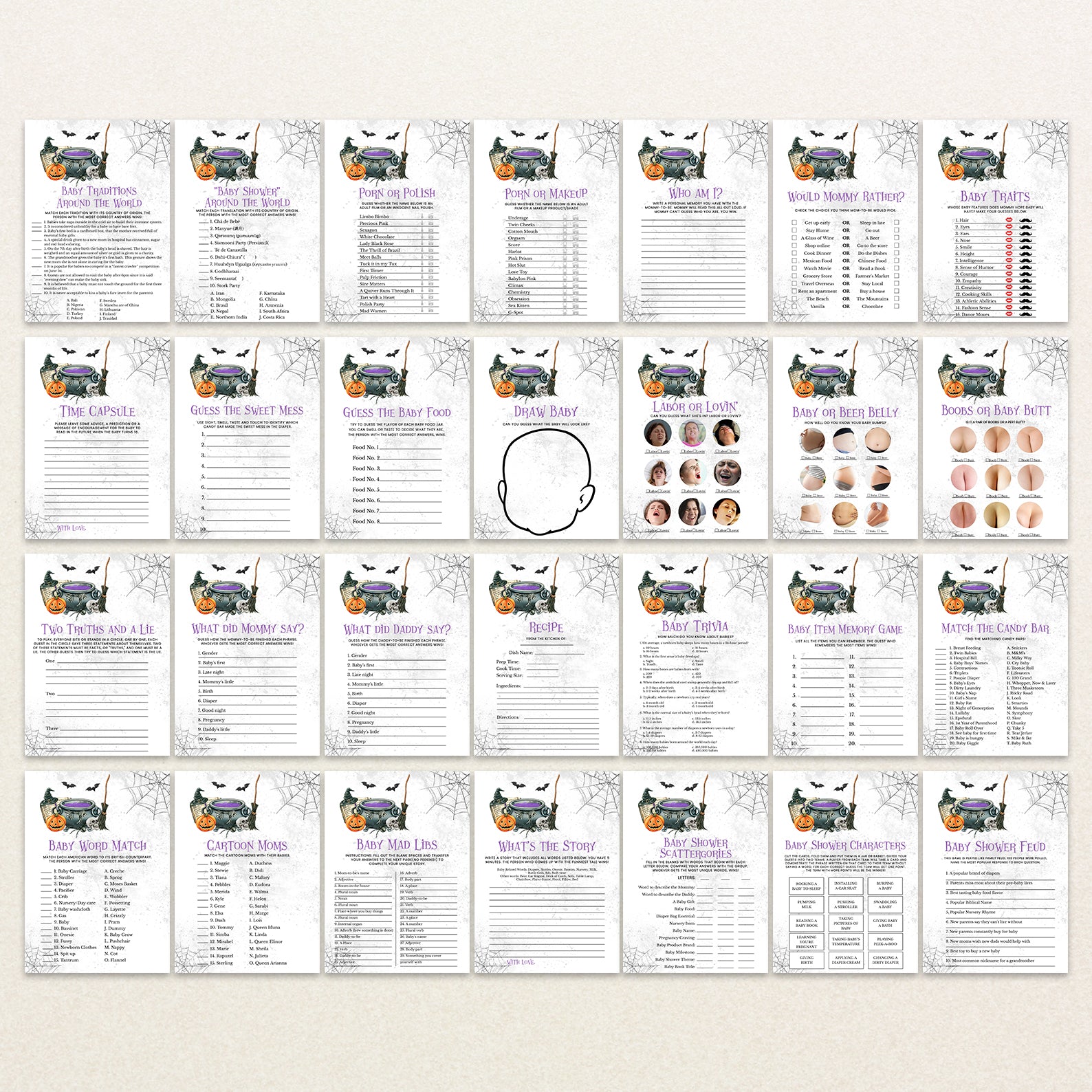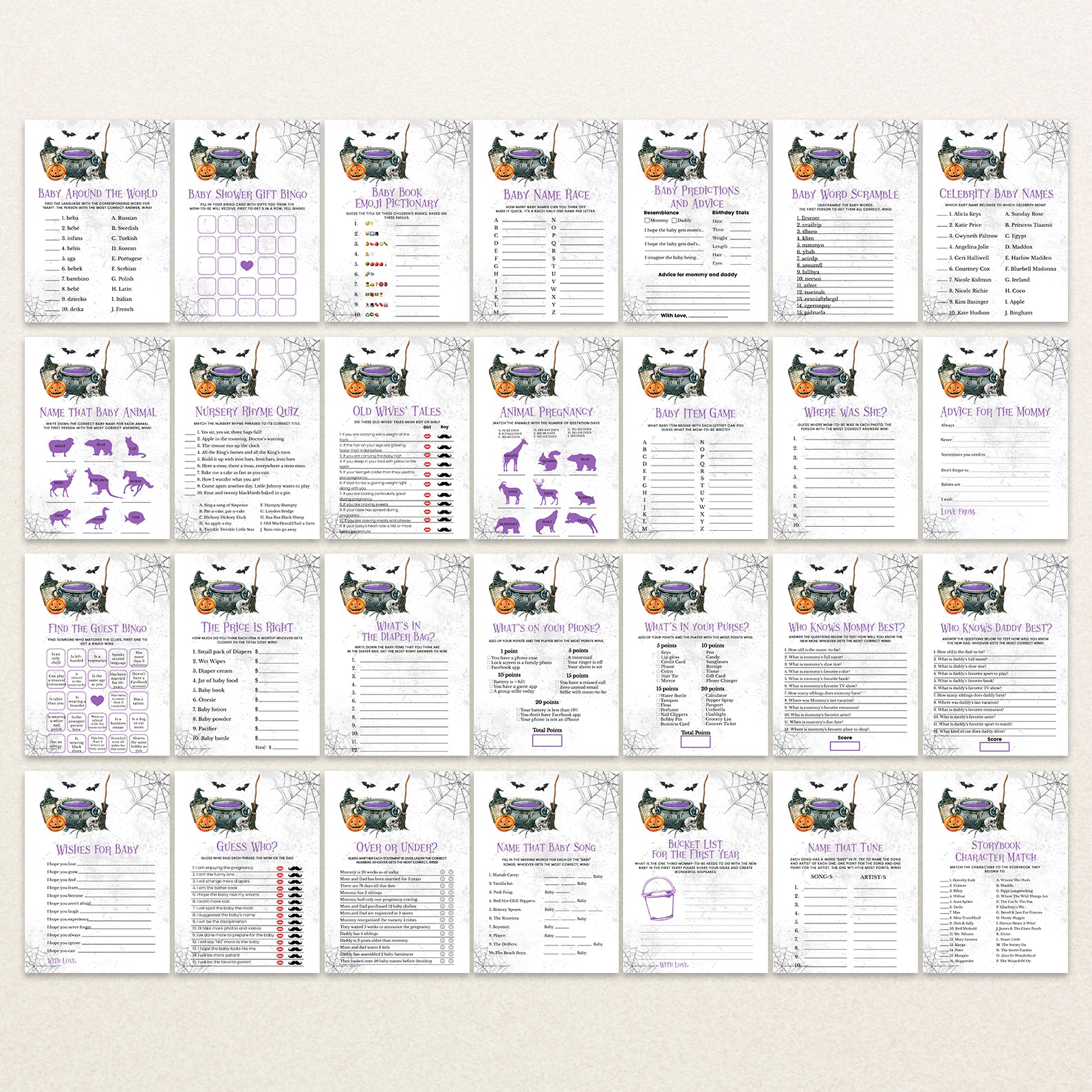 - Purchase this A Baby is Brewing: Whimsical Halloween Purple Baby Shower Game Bundle! template