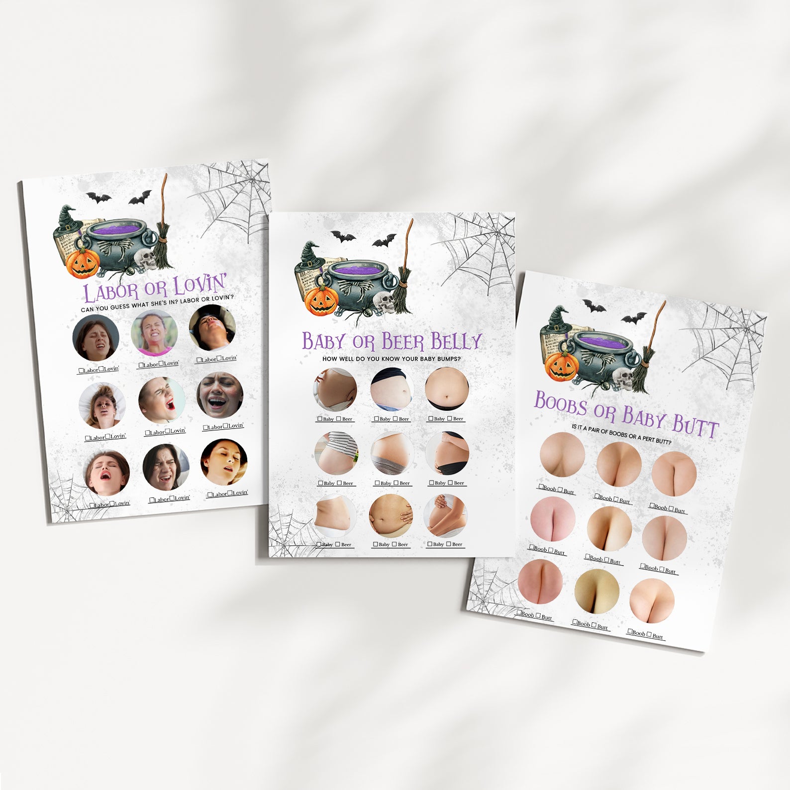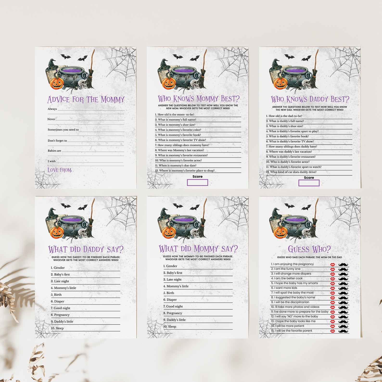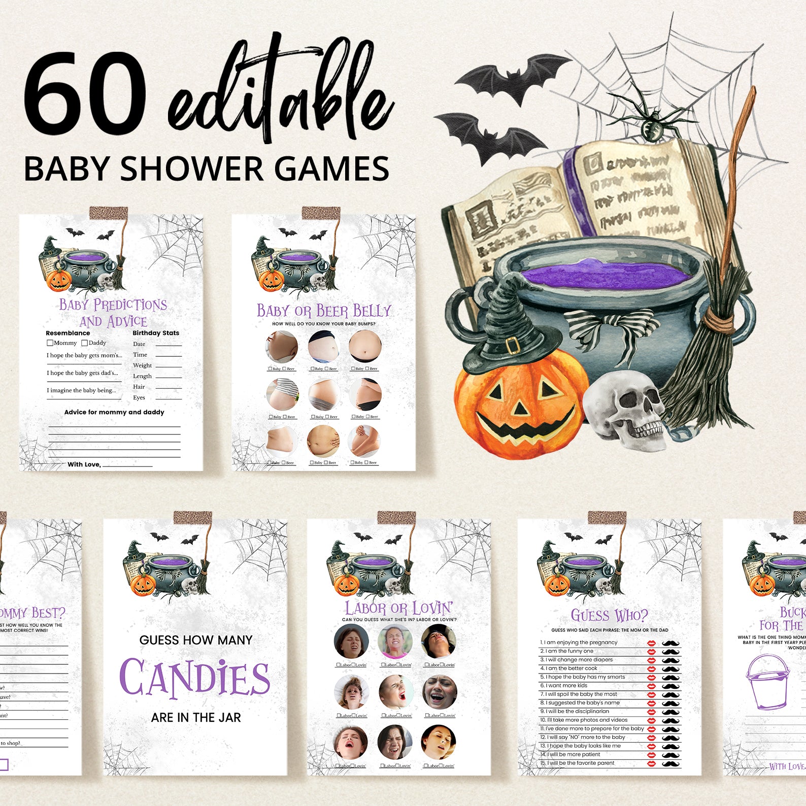 - Purchase this A Baby is Brewing: Whimsical Halloween Purple Baby Shower Game Bundle! template