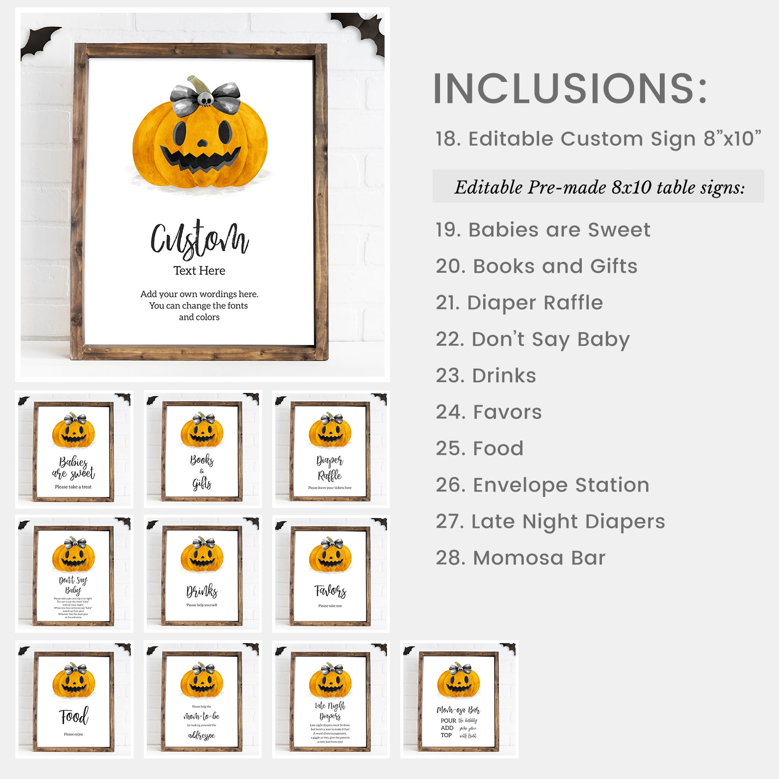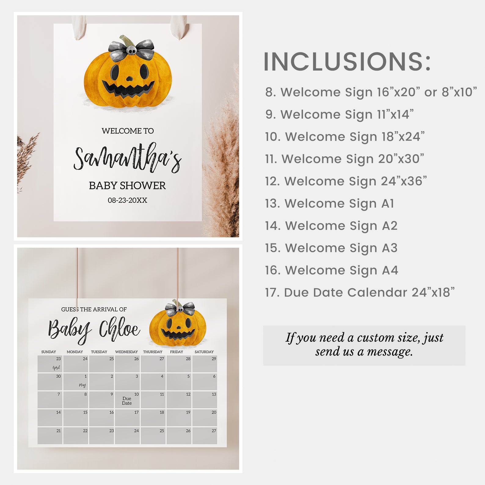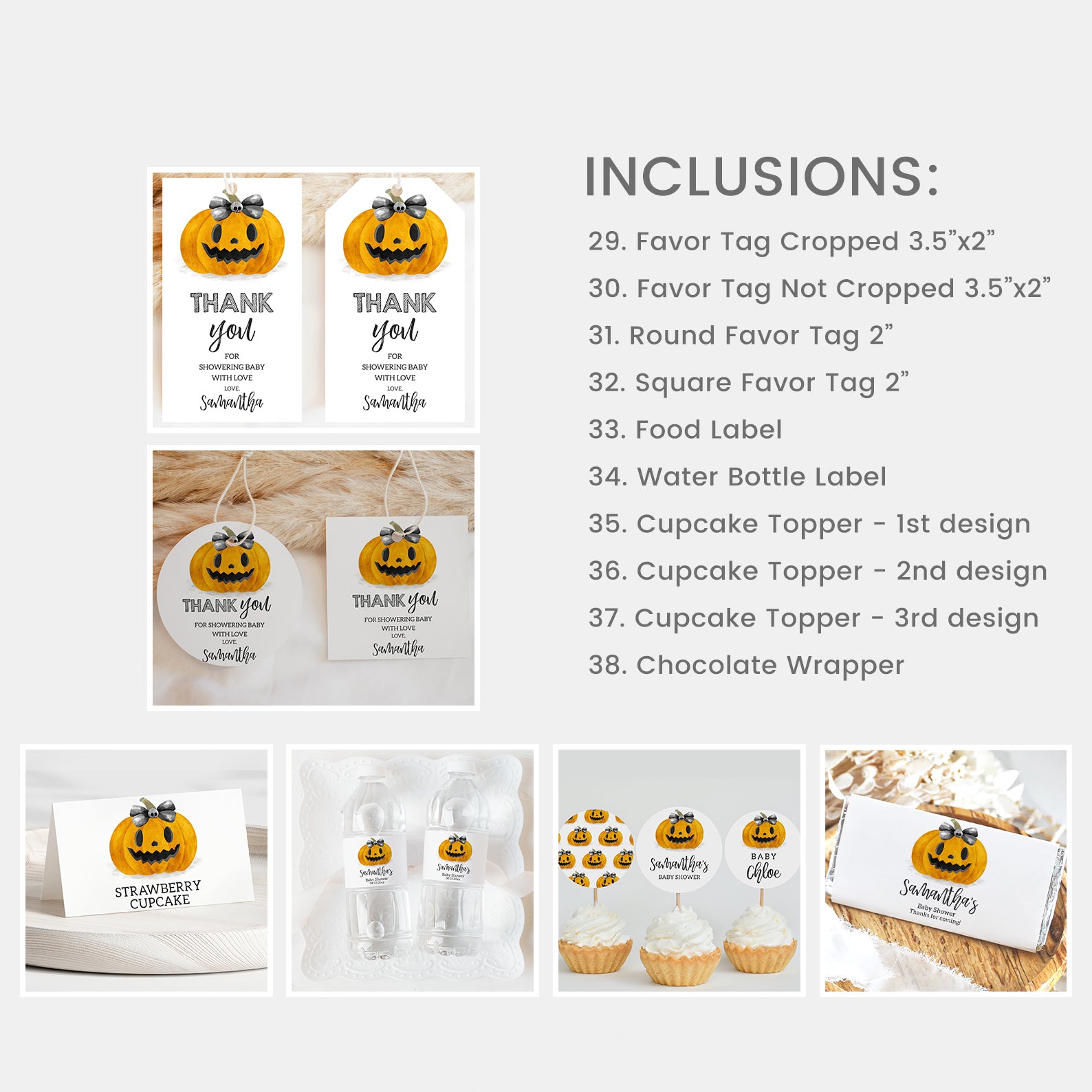 Host a spooktacular celebration with our Halloween Baby Shower Mega Bundle! Featuring 100 editable itemsfrom invitations and games to favor tags and cupcake toppers. This set has everything you need for a boo-tiful bash. The design includes a chic pumpkin with a black skull bow, soft seasonal tones, and playful Halloween accents like ghosts, cobwebs, and treats. Perfect for celebrating your little pumpkin in style!