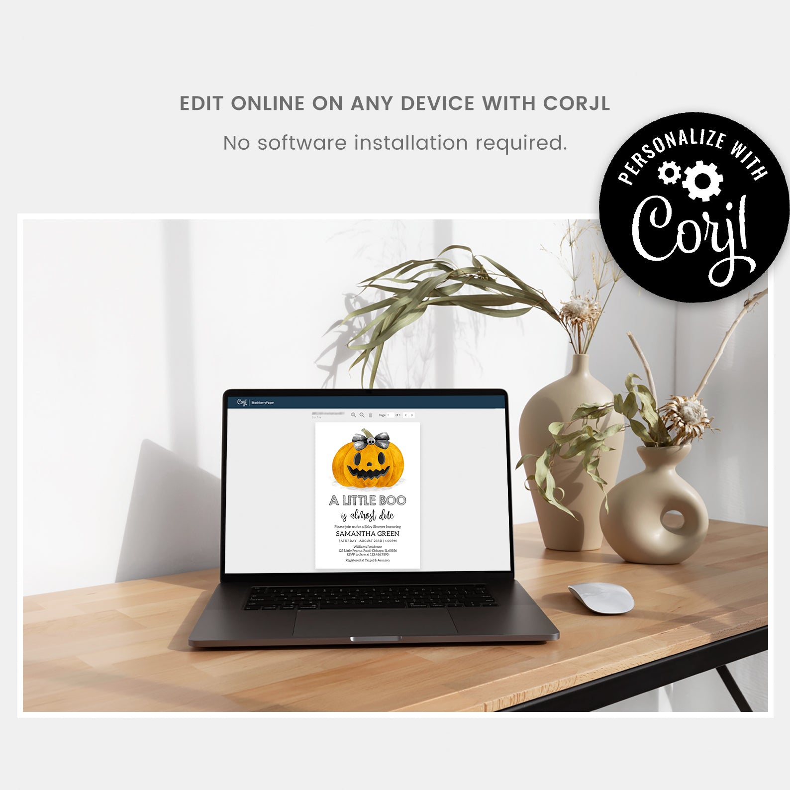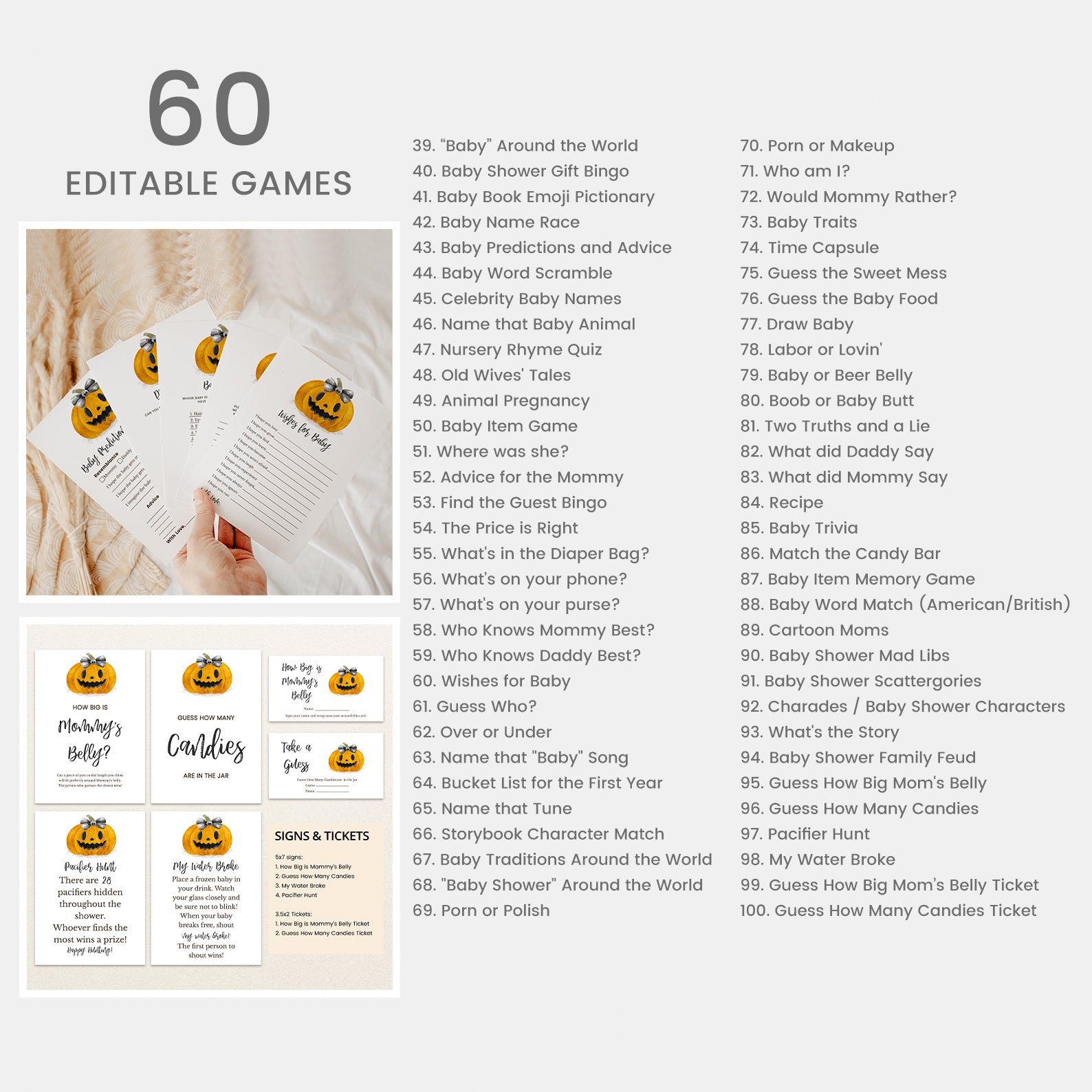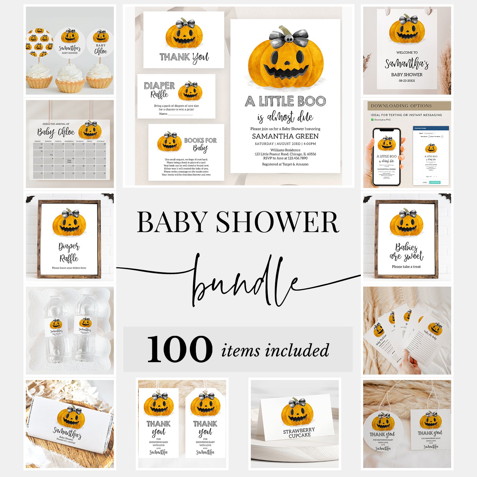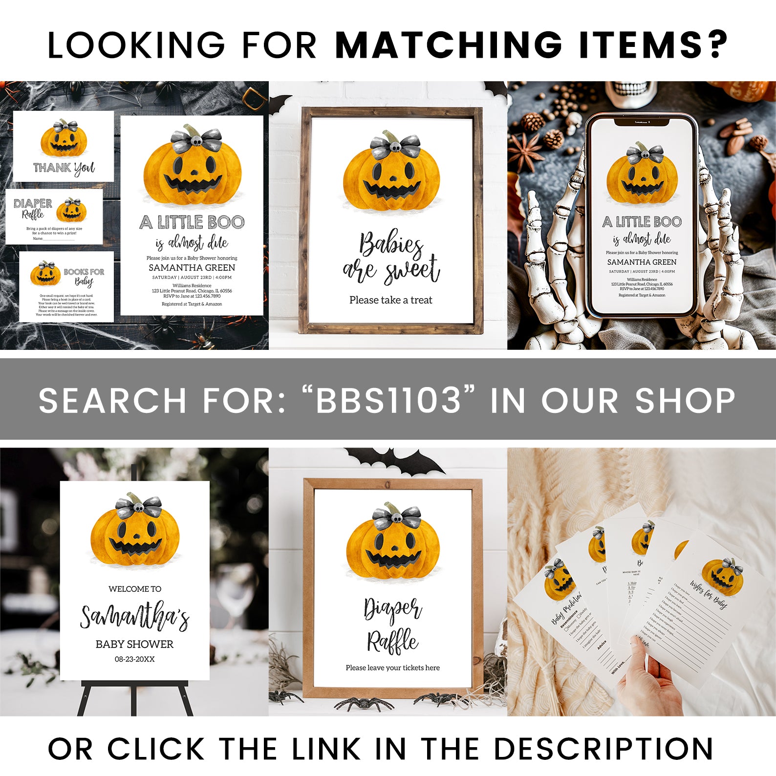 Host a spooktacular celebration with our Halloween Baby Shower Mega Bundle! Featuring 100 editable itemsfrom invitations and games to favor tags and cupcake toppers. This set has everything you need for a boo-tiful bash. The design includes a chic pumpkin with a black skull bow, soft seasonal tones, and playful Halloween accents like ghosts, cobwebs, and treats. Perfect for celebrating your little pumpkin in style!