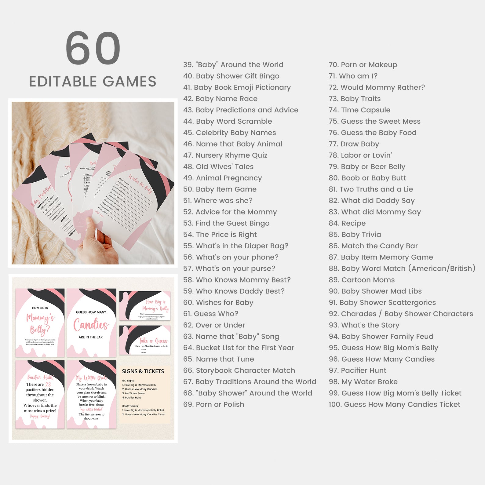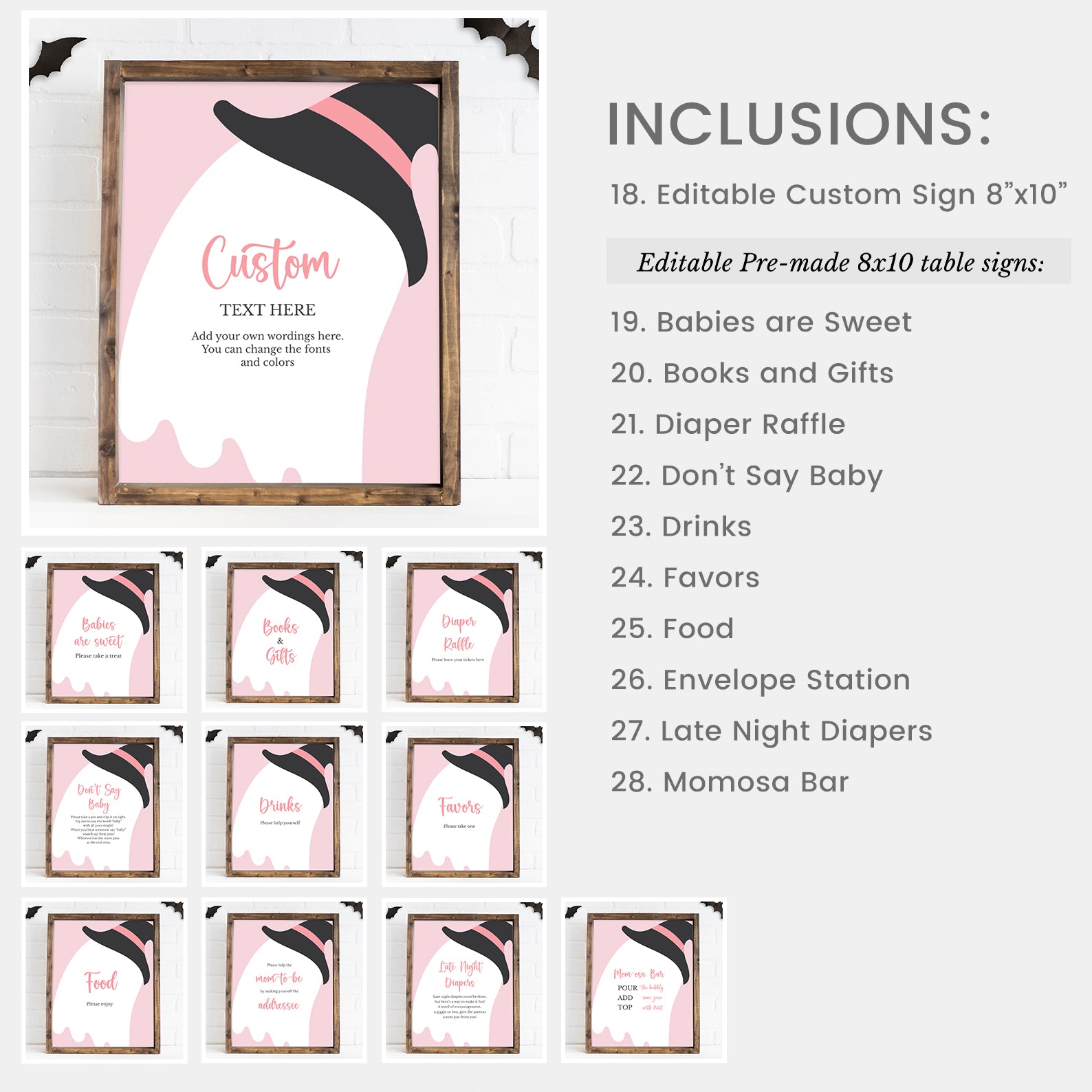 Celebrate your little boo with our Halloween Baby Shower Mega Bundle! This 100-piece editable set includes everything you need from digital invitations and thank-you cards to party decor like table signs, cupcake toppers, and games. Featuring a cute ghost in a pink-and-black witch hat against a soft pink background, this bundle brings sweet Halloween charm to your celebration while making planning easy and festive.