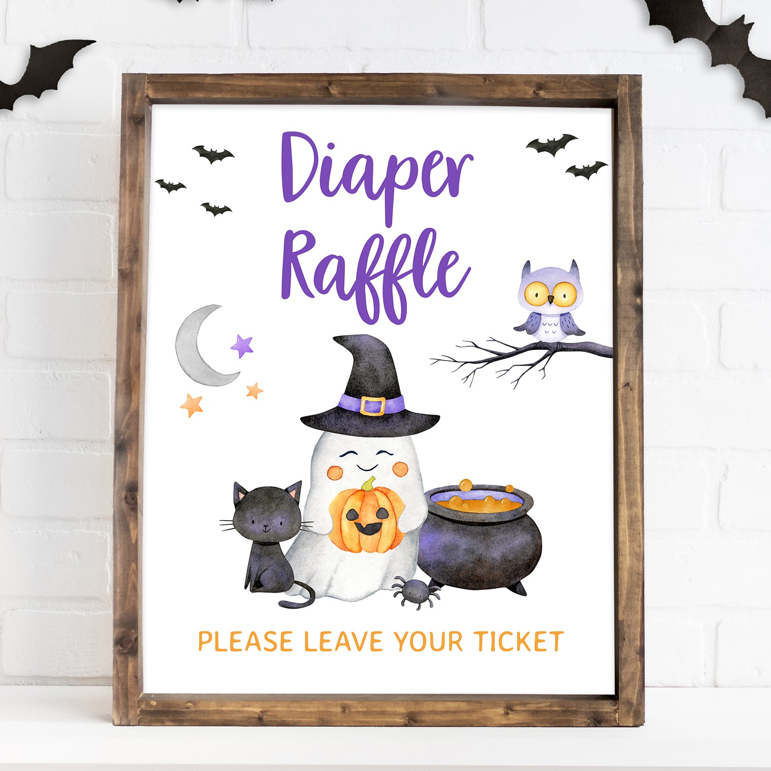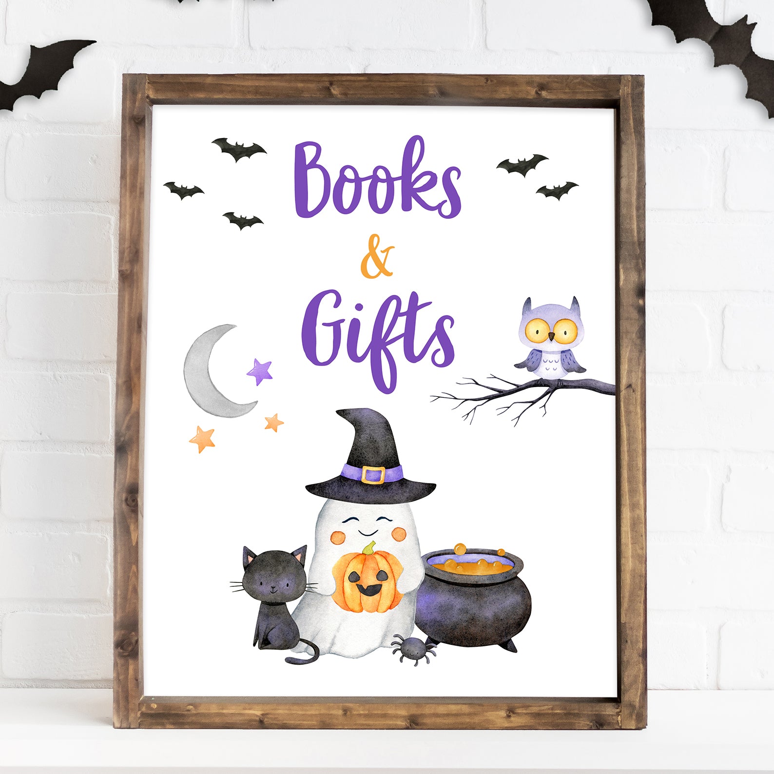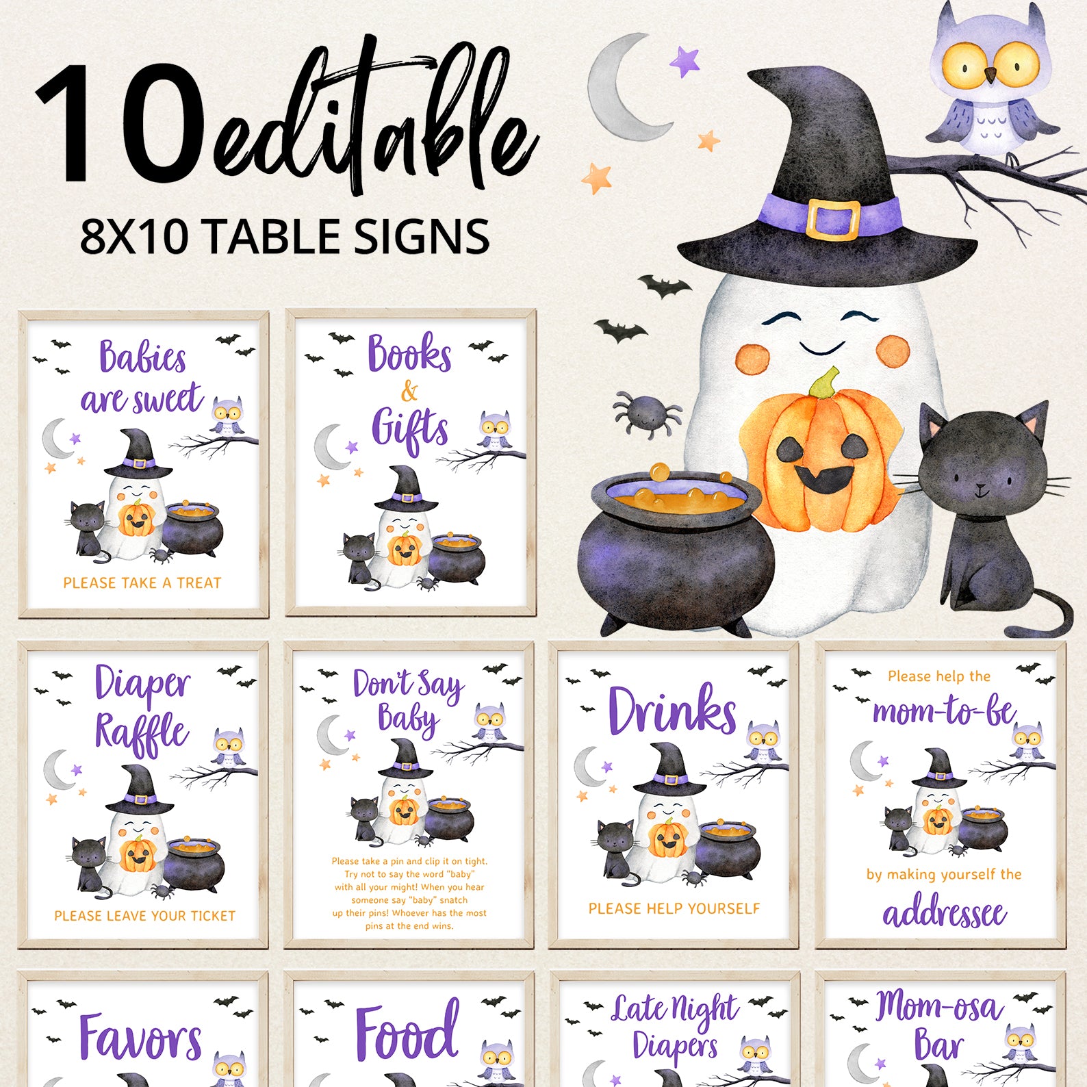 Add a whimsical touch to your baby shower with our table sign featuring a smiling ghost in a witch hat, a black cat, a brewing cauldron, an owl on a tree branch, and flying bats. Available in blue, pink, or orange, this design brings a charming and playful element to your table decor. Perfect for enhancing your celebration’s magical atmosphere!
