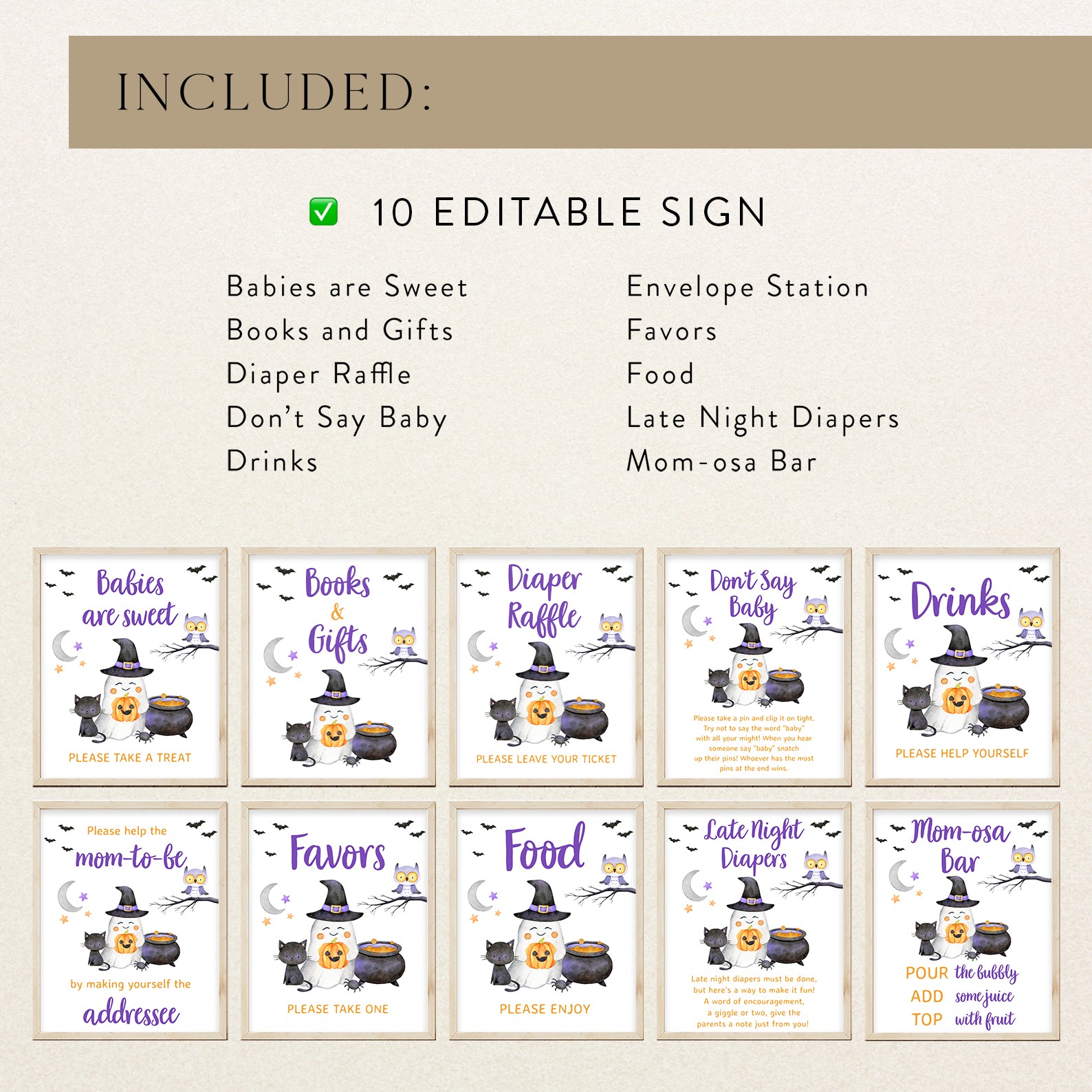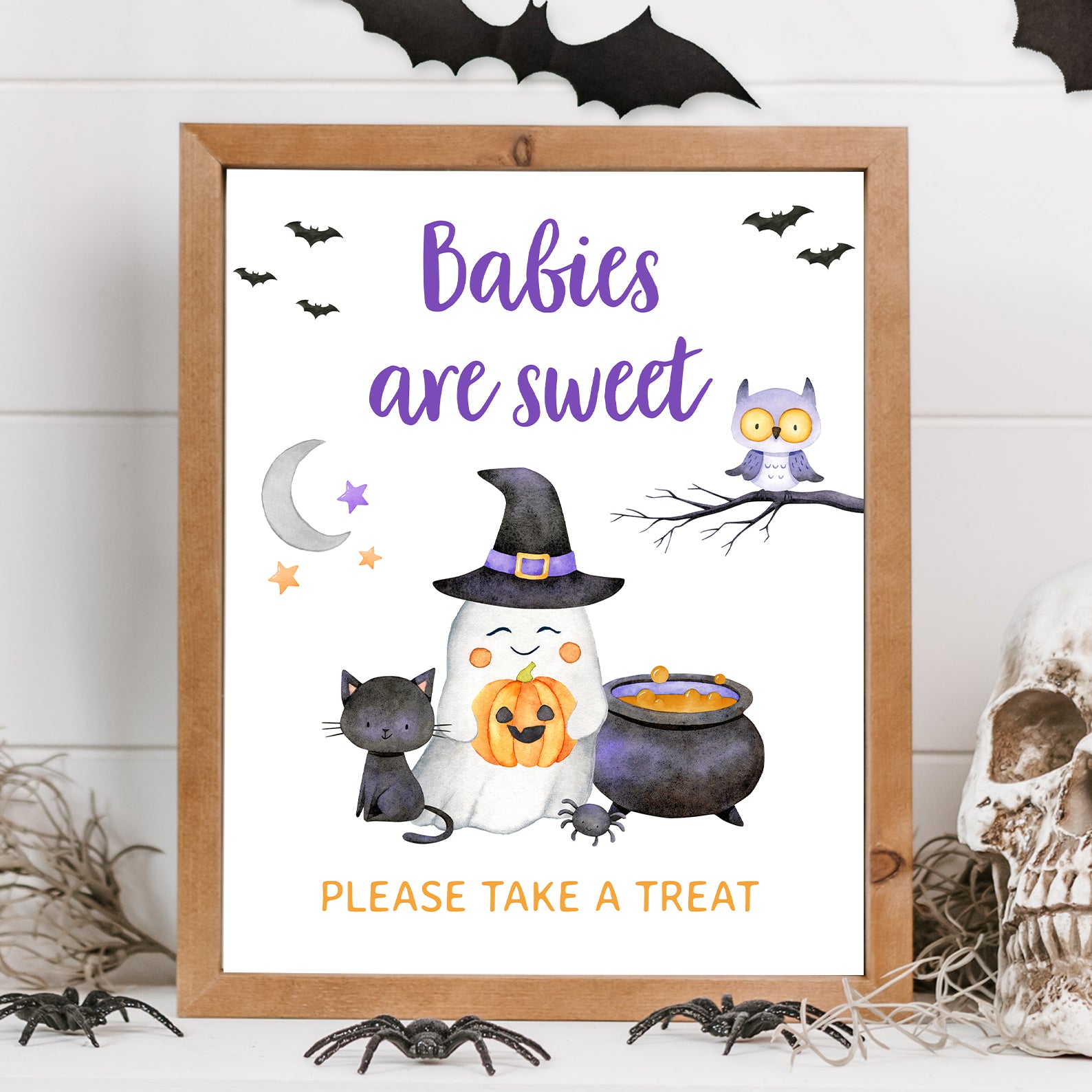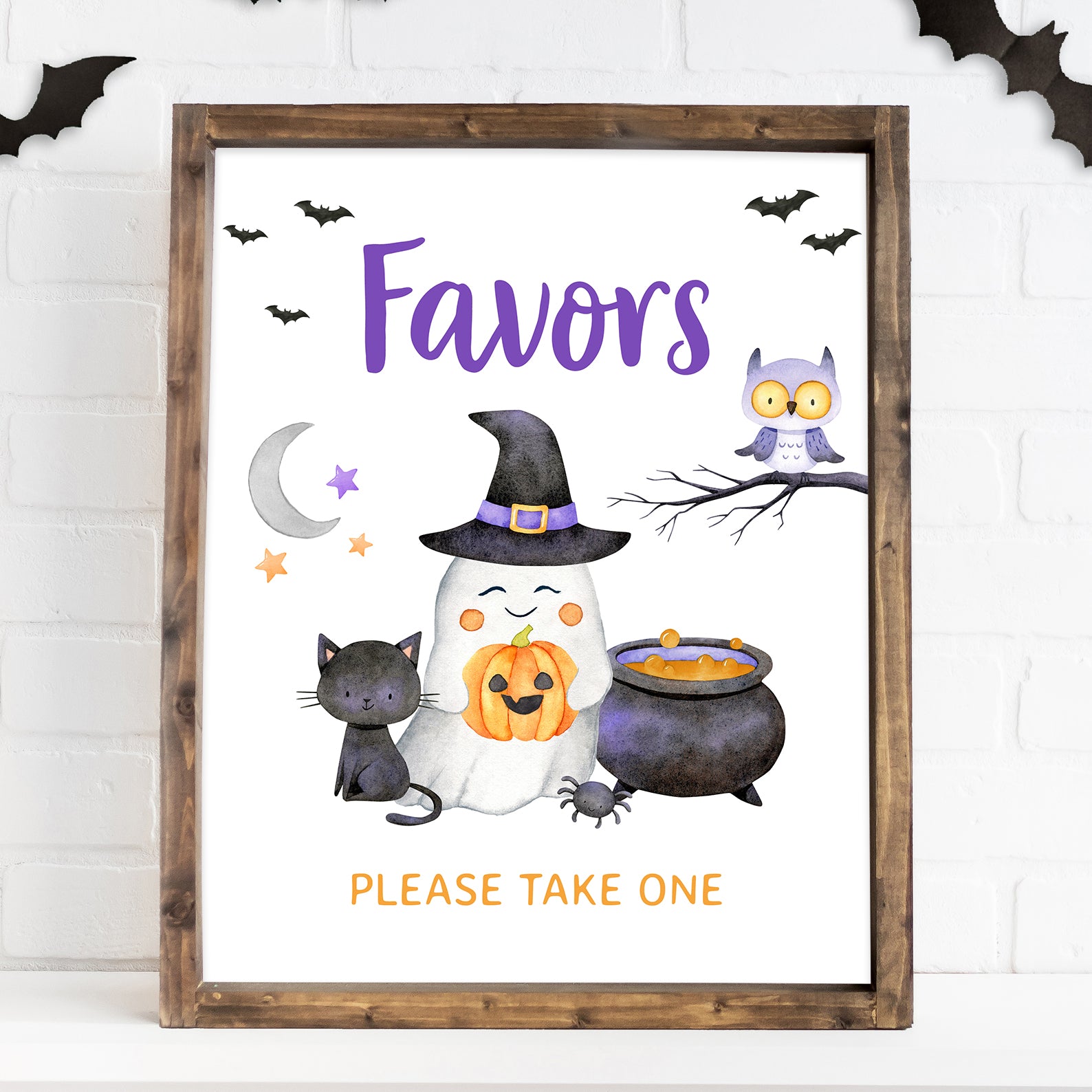 Add a whimsical touch to your baby shower with our table sign featuring a smiling ghost in a witch hat, a black cat, a brewing cauldron, an owl on a tree branch, and flying bats. Available in blue, pink, or orange, this design brings a charming and playful element to your table decor. Perfect for enhancing your celebration’s magical atmosphere!