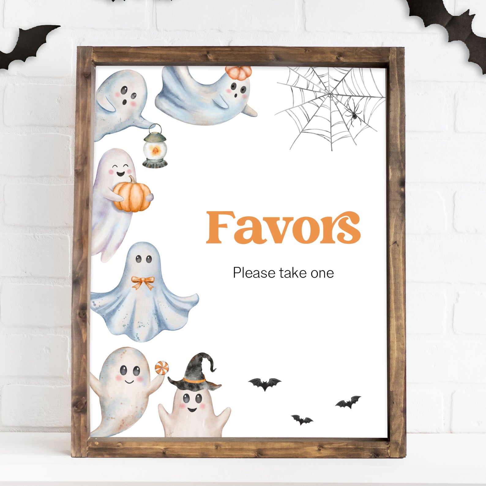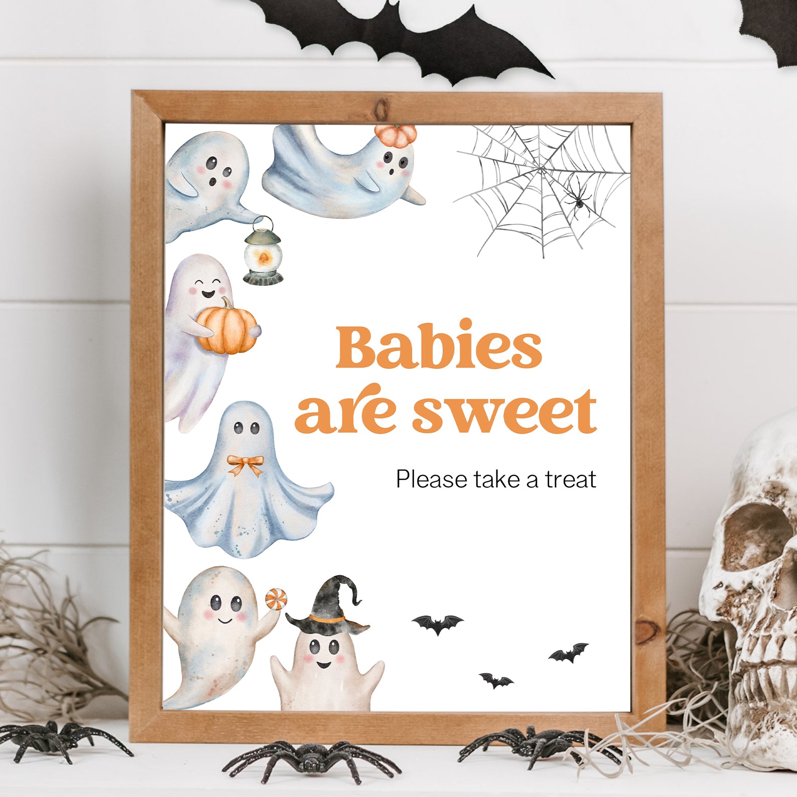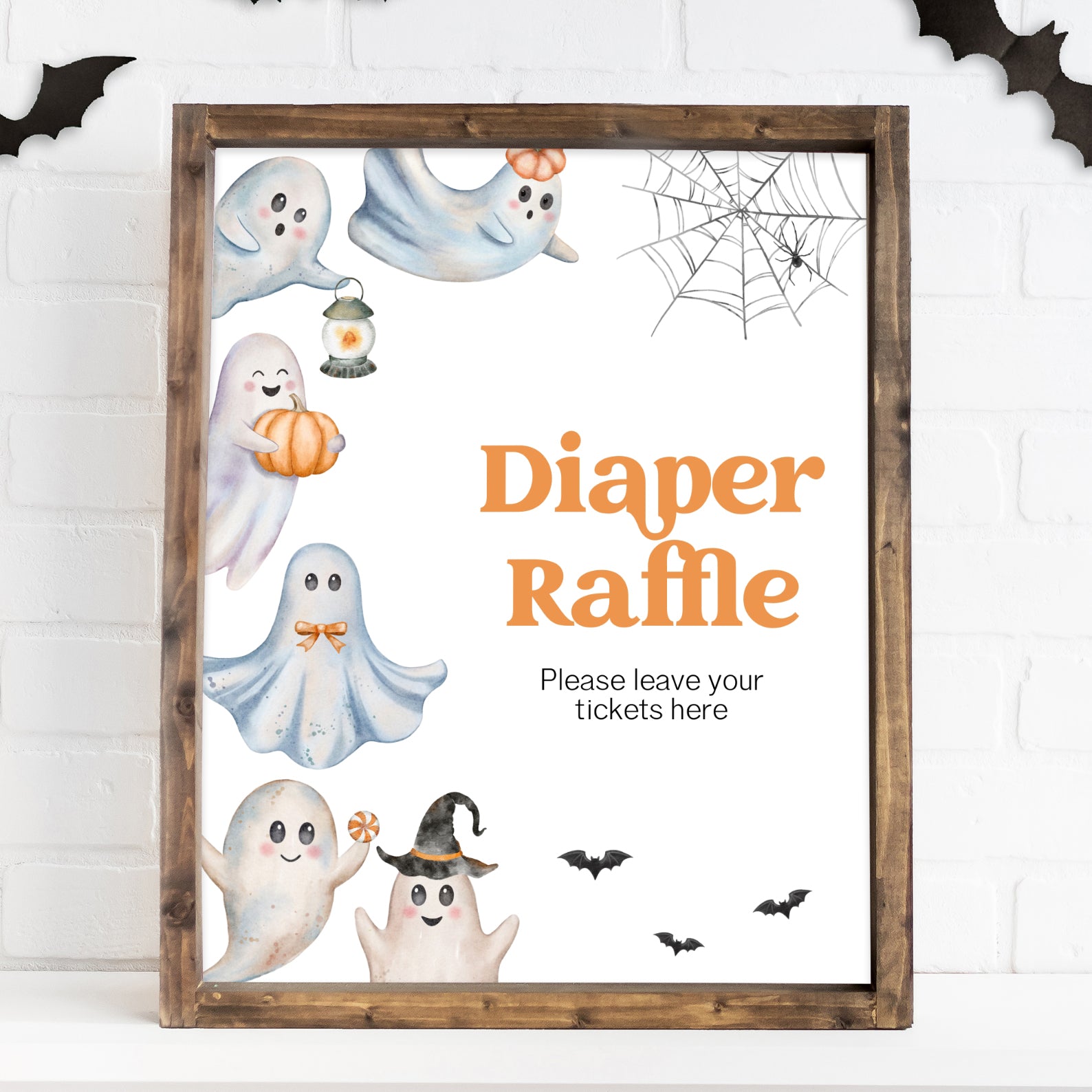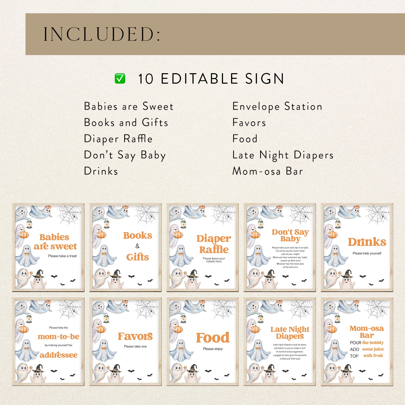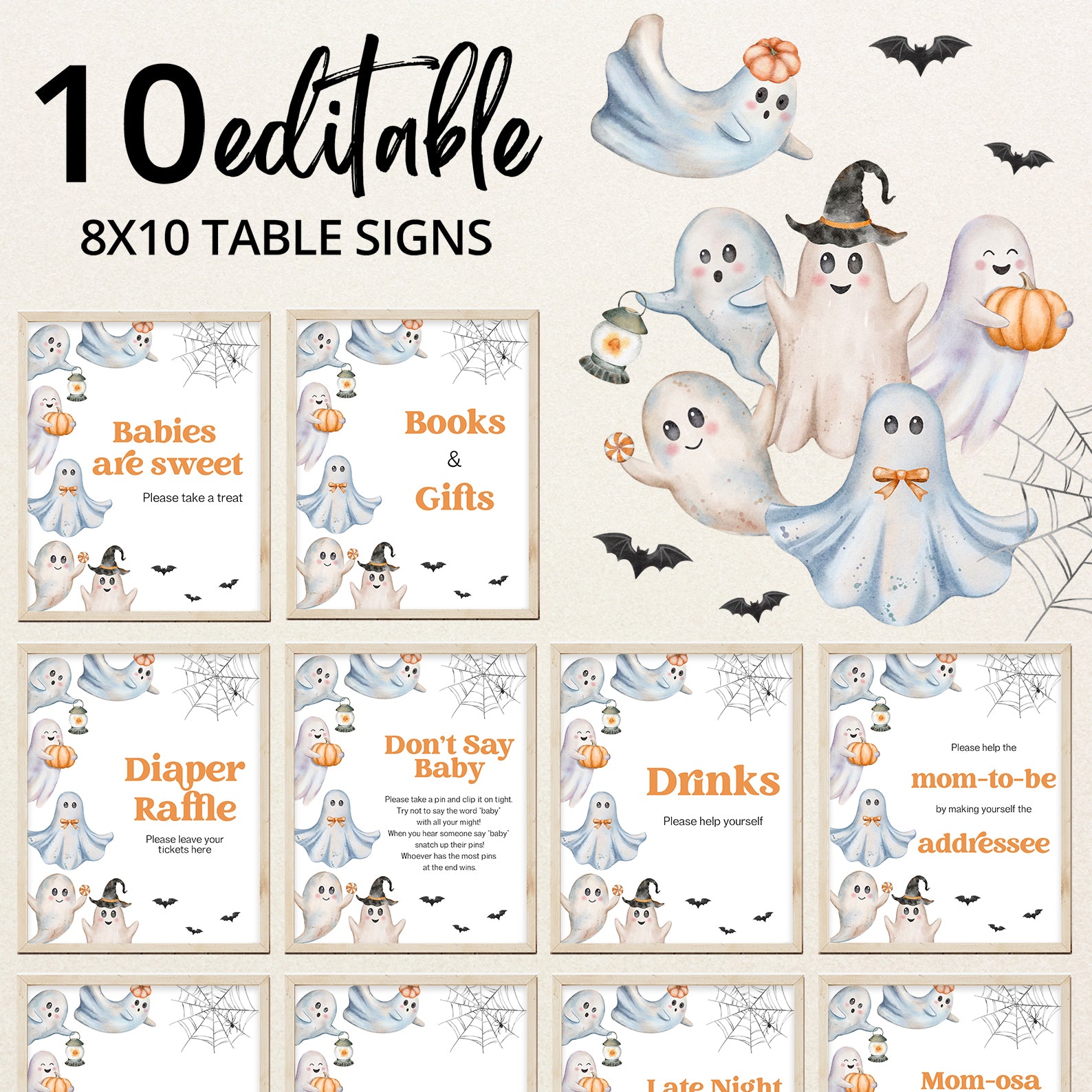 Add a festive touch to your Halloween baby shower with this set of 10 editable table signs! Each sign features adorable ghost illustrations, fluttering bats, cobwebs, and seasonal accents in a playful spooky palette. Includes favorites like Babies Are Sweet, Books and Gifts, Diaper Raffle, and Mom-osa Bar. Designed to match your Halloween theme, these signs guide guests while bringing fun and charm to your celebration décor.