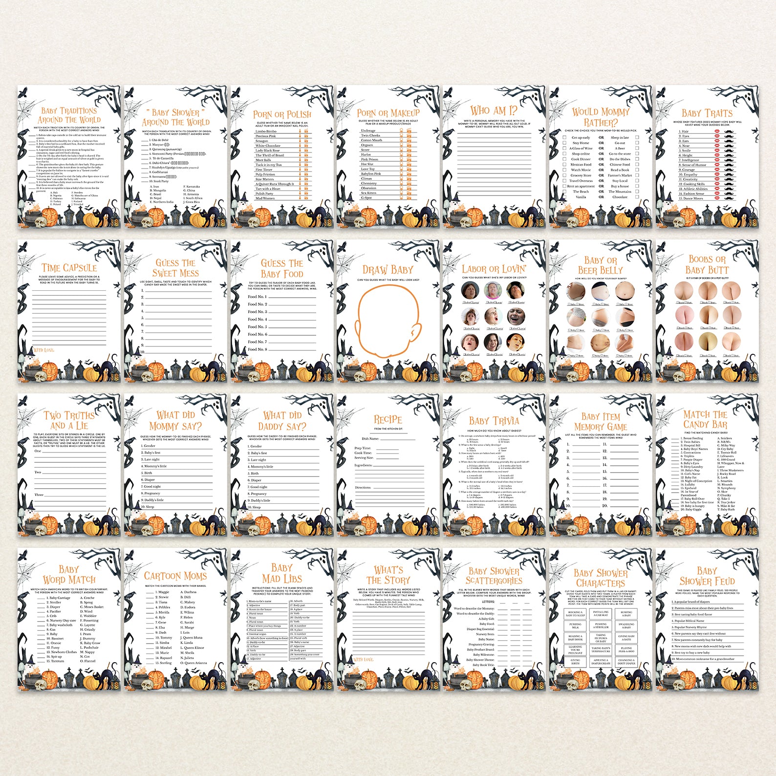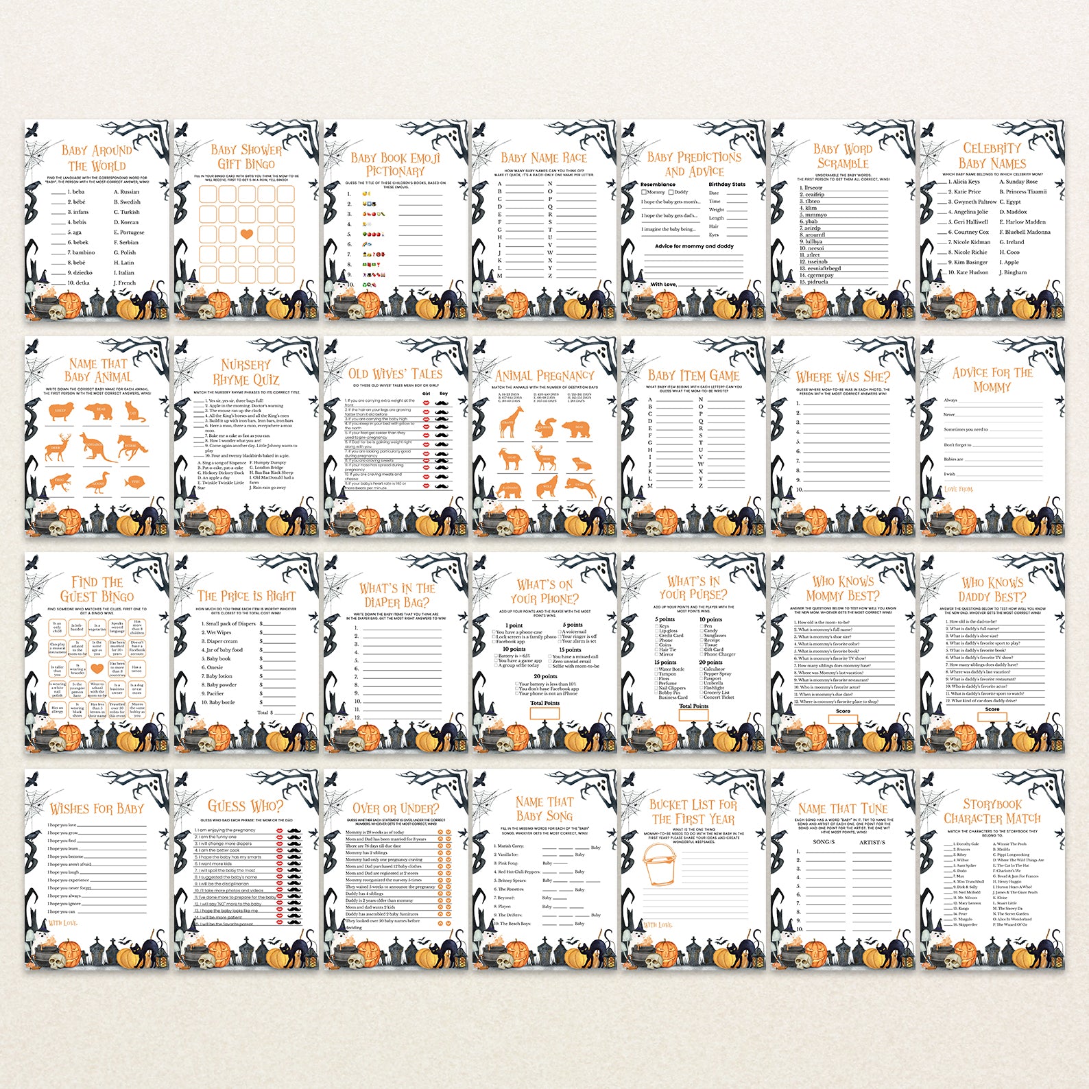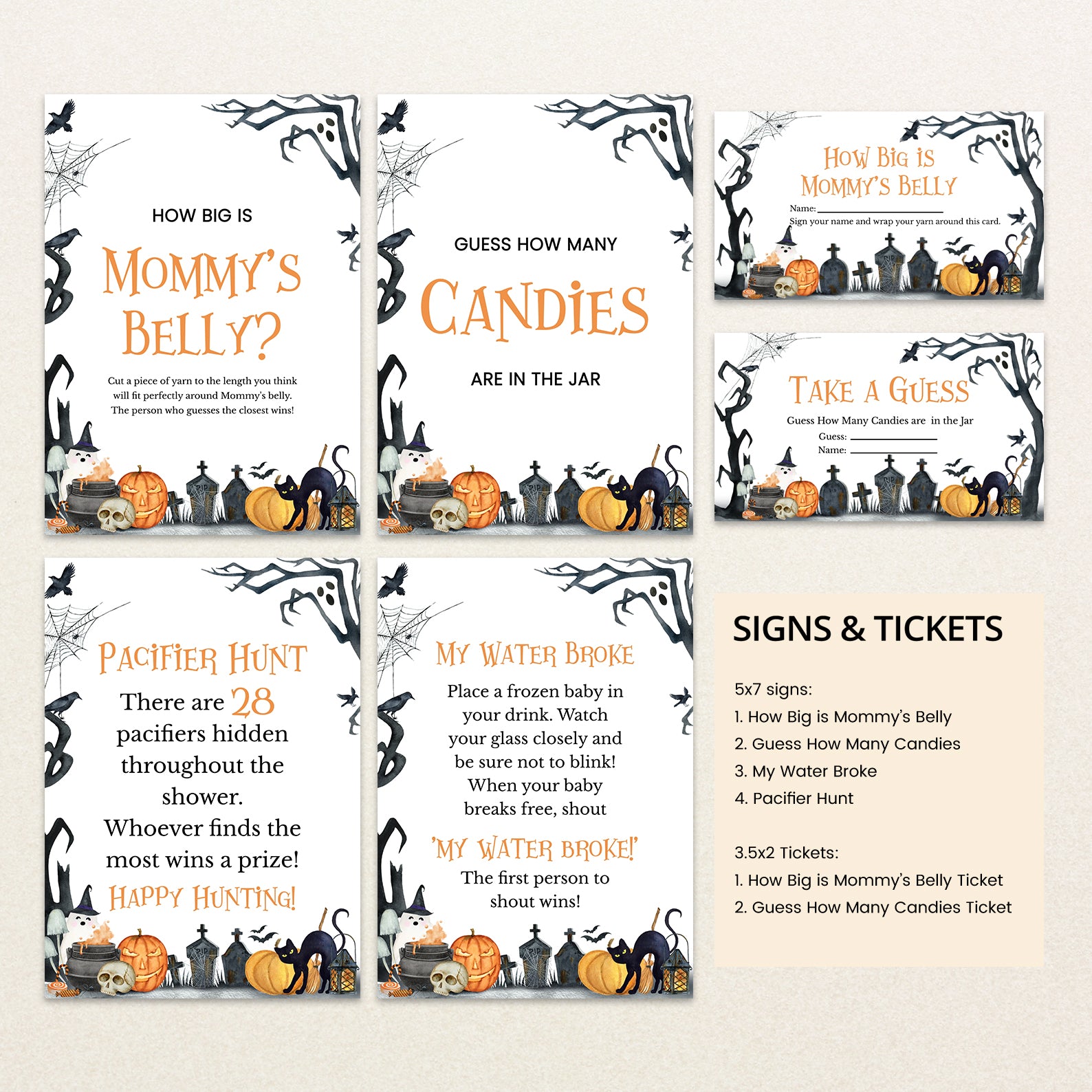 Set against a crisp white background, the design also includes a bubbling cauldron, adding a magical touch to your special event. With editable baby shower games included in this bundle, you'll have everything you need to entertain and enchant your guests. Get ready to spook and delight with our unique and whimsical Halloween Baby Shower Game Bundle. Order now and make your celebration unforgettable!