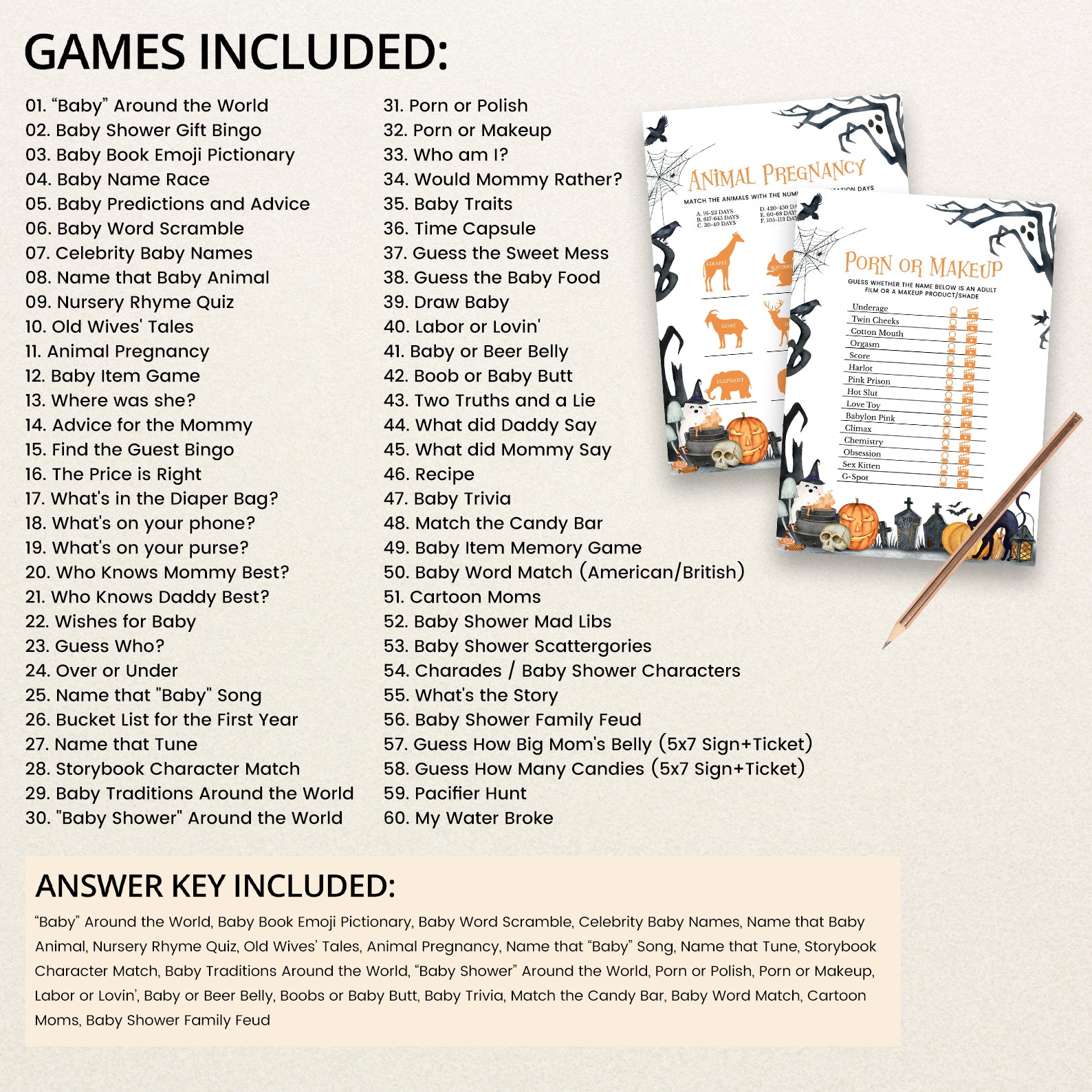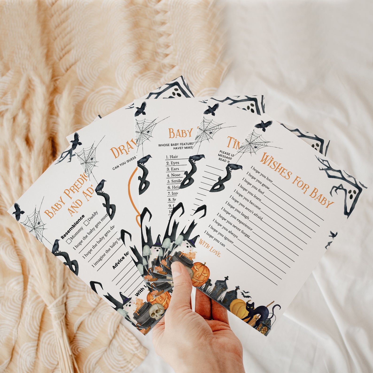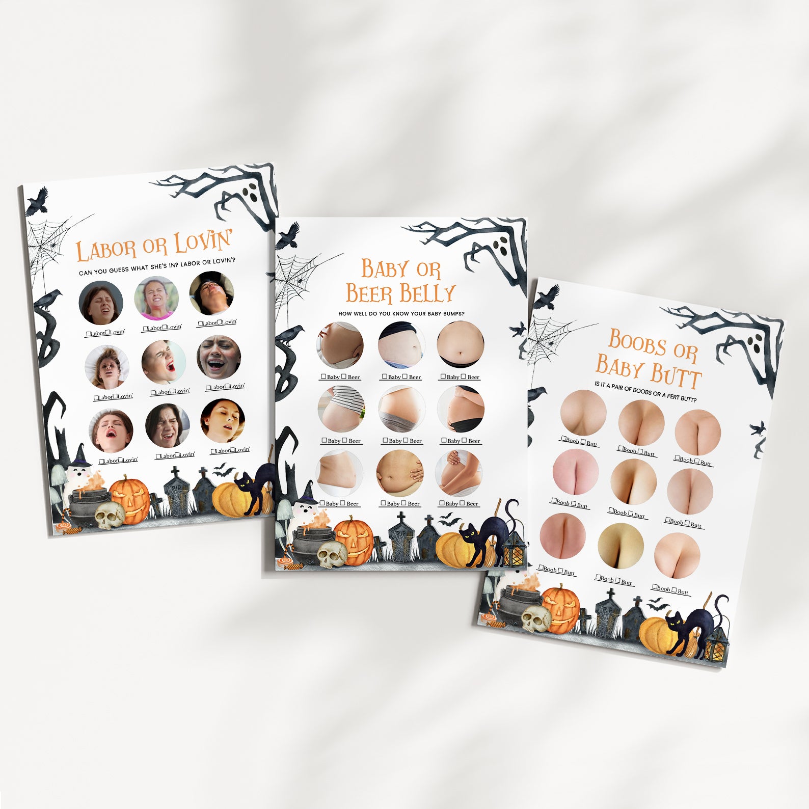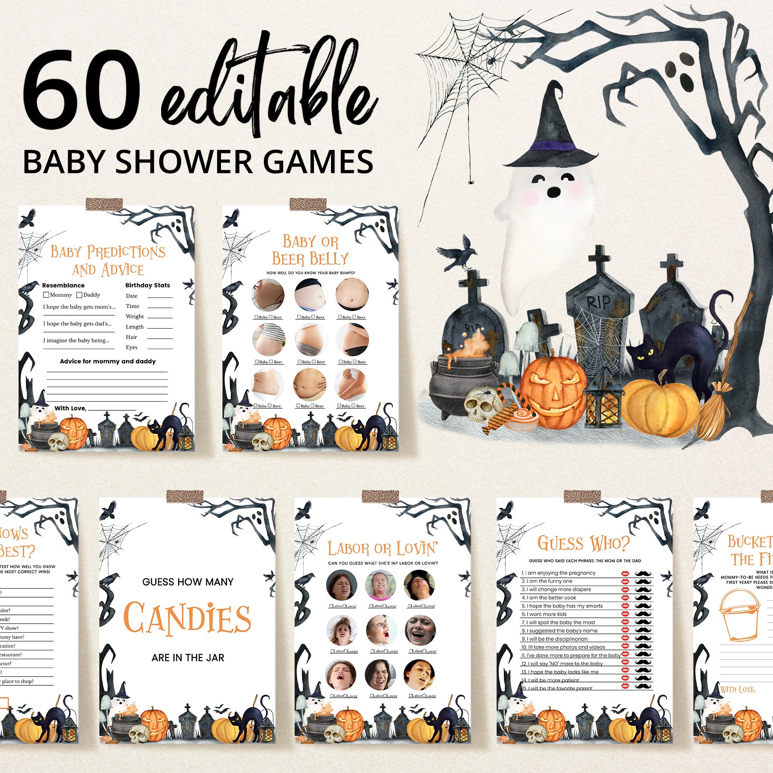 Set against a crisp white background, the design also includes a bubbling cauldron, adding a magical touch to your special event. With editable baby shower games included in this bundle, you'll have everything you need to entertain and enchant your guests. Get ready to spook and delight with our unique and whimsical Halloween Baby Shower Game Bundle. Order now and make your celebration unforgettable!