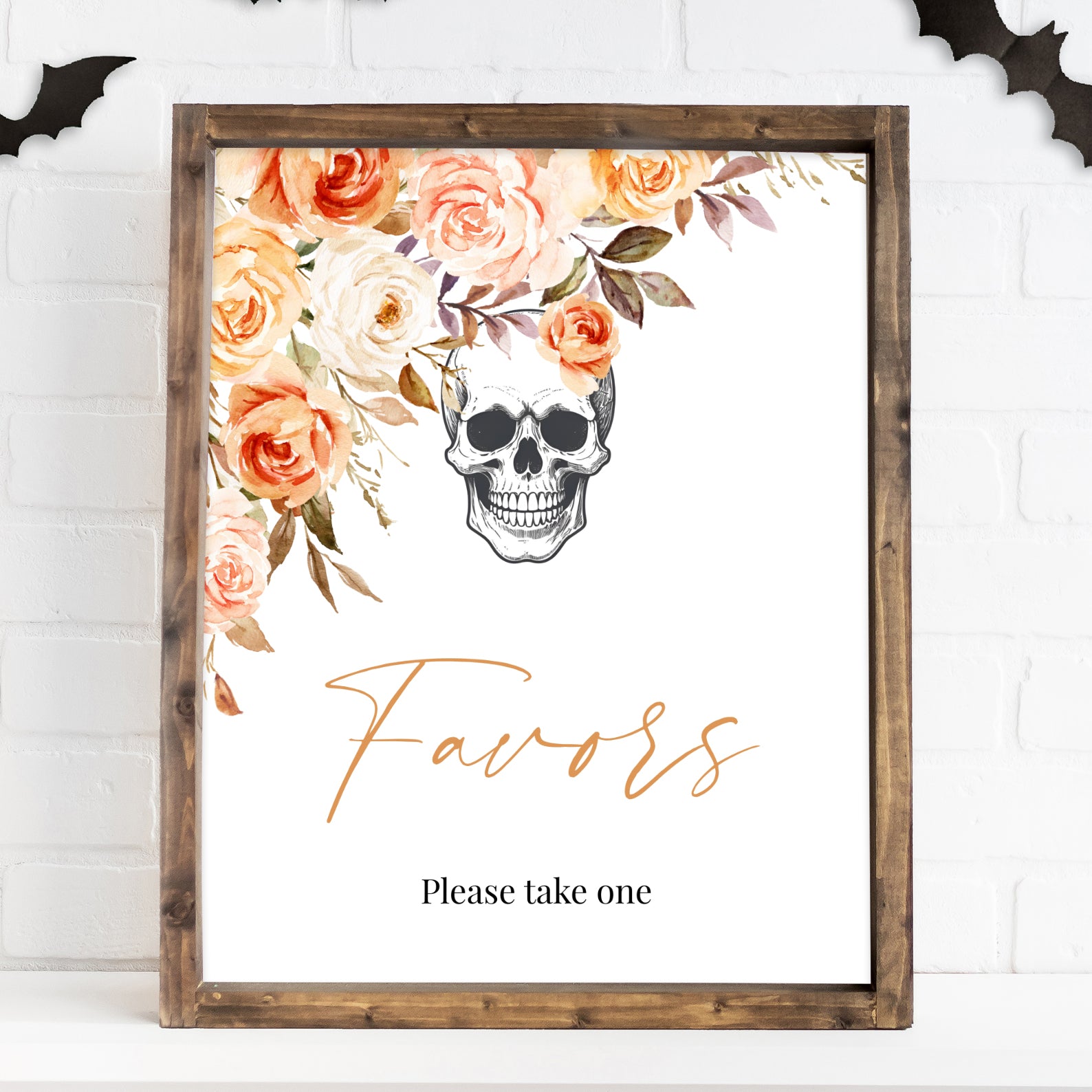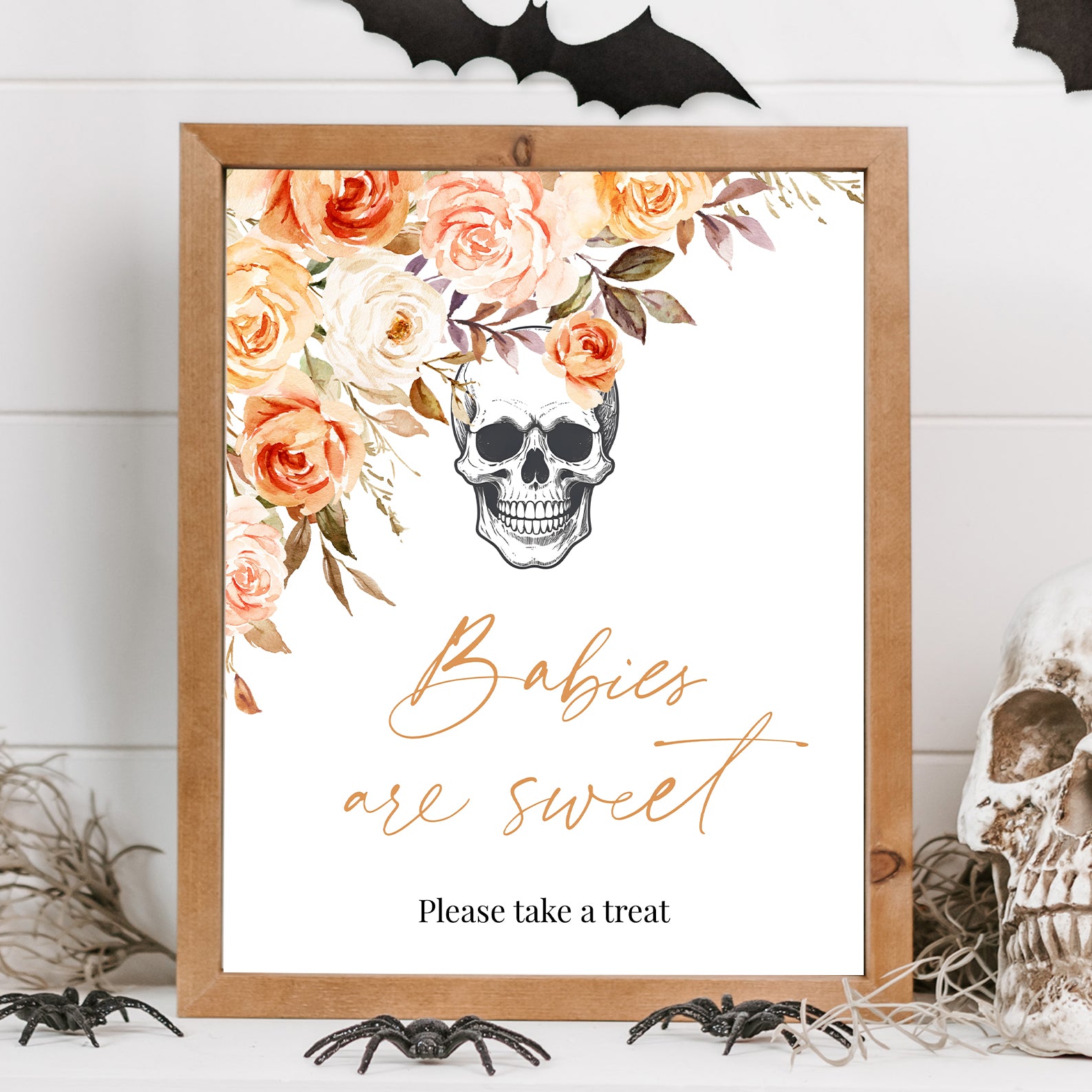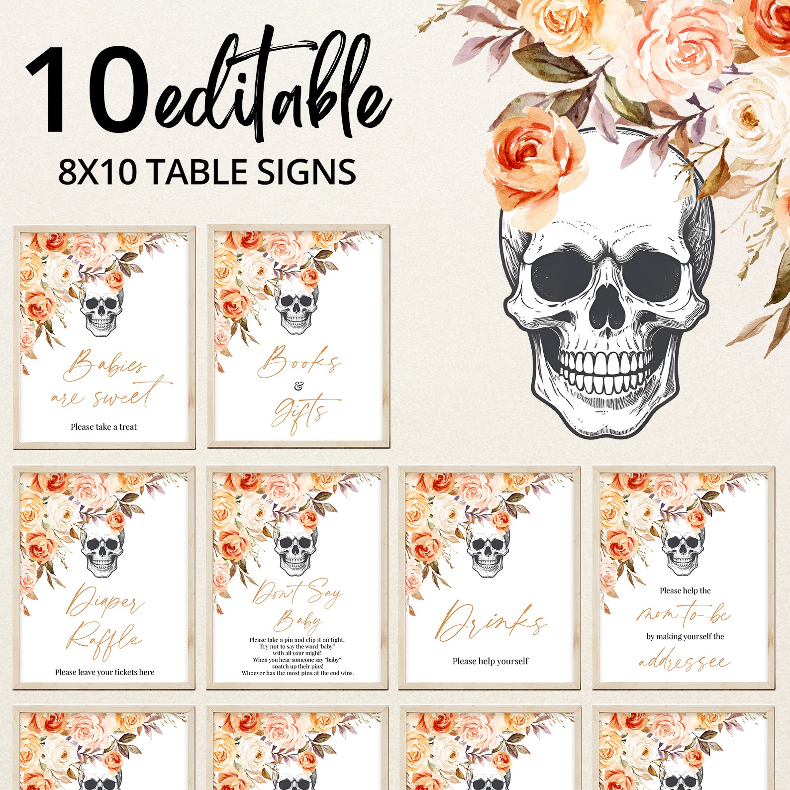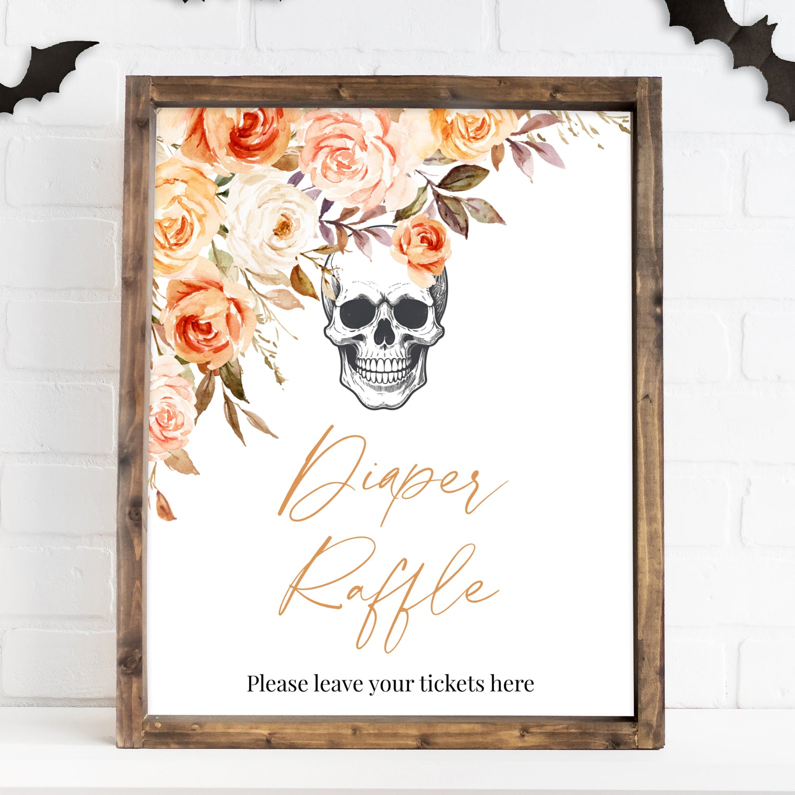 Add a spooky-sweet touch to your baby shower with this set of 10 editable table signs, designed to match a charming Halloween theme. Featuring soft watercolor roses, a playful skull accent, and a warm orange background, each sign beautifully complements your festive setup. Includes signs for Babies Are Sweet, Books and Gifts, Diaper Raffle, Don’t Say Baby, Drinks, Envelope Station, Favors, Food, Late Night Diapers, and Mom-osa Bar. Stylish, seasonal, and fun!