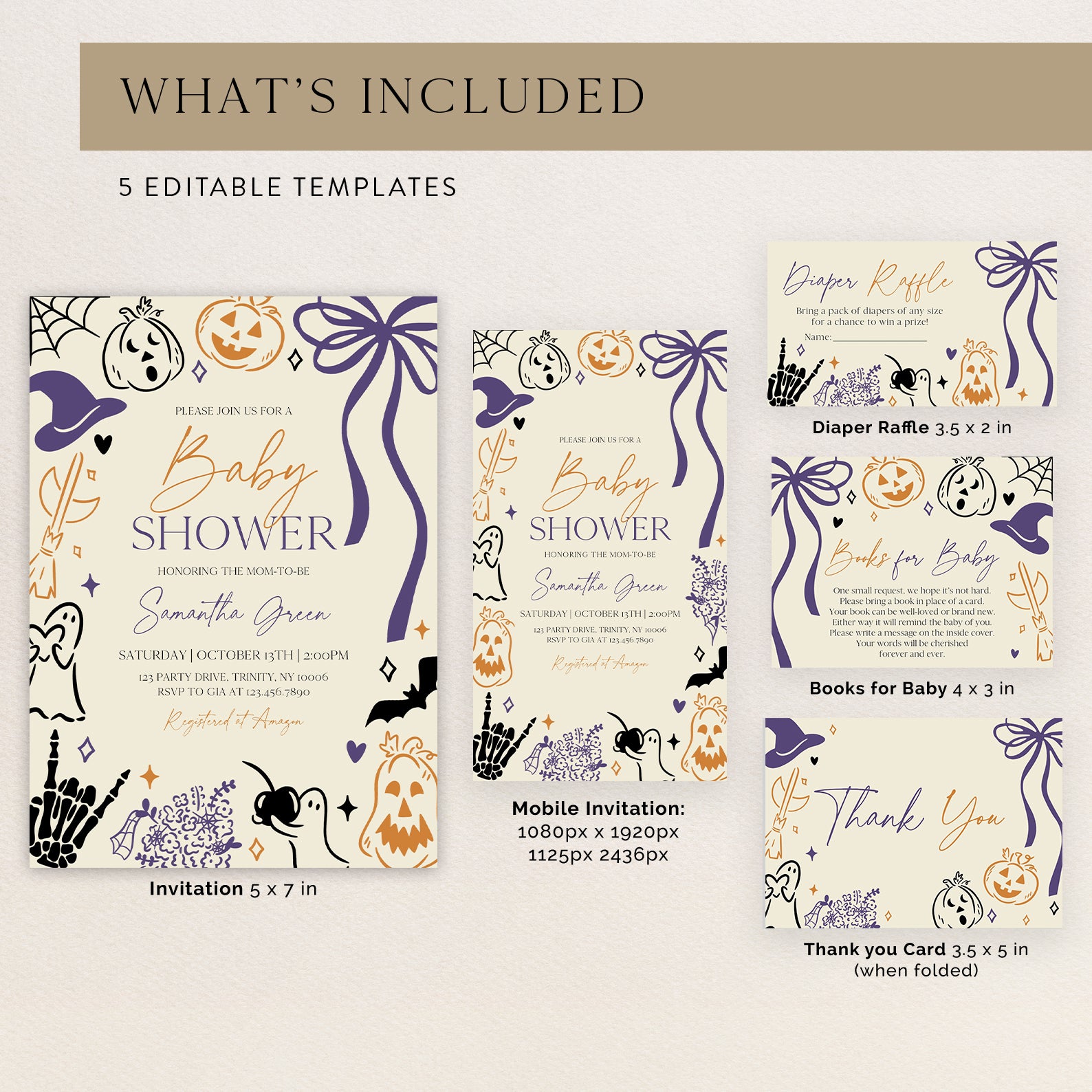 - Purchase this Halloween Baby Shower Invite Bundle: Pumpkins, Ghosts & Witchy Fun template