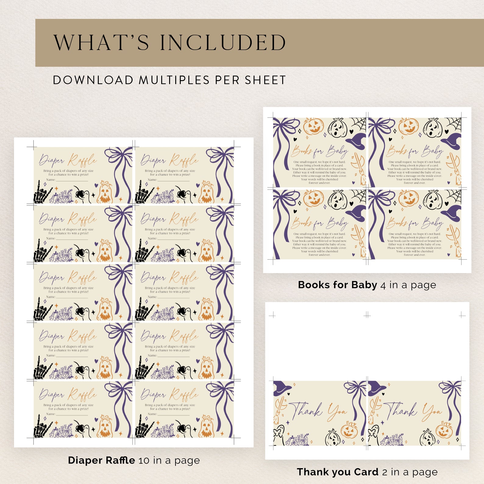 Celebrate your little one with our Halloween Baby Shower Invitation Bundle! Designed in vibrant orange and purple, this set features playful pumpkins, a witch hat and broom, cute ghosts, and festive spider webs. Includes a printable and mobile invitation, diaper raffle card, books for baby card, and thank you card. A complete and editable package to make your spooky-sweet celebration both stylish and easy to coordinate.
