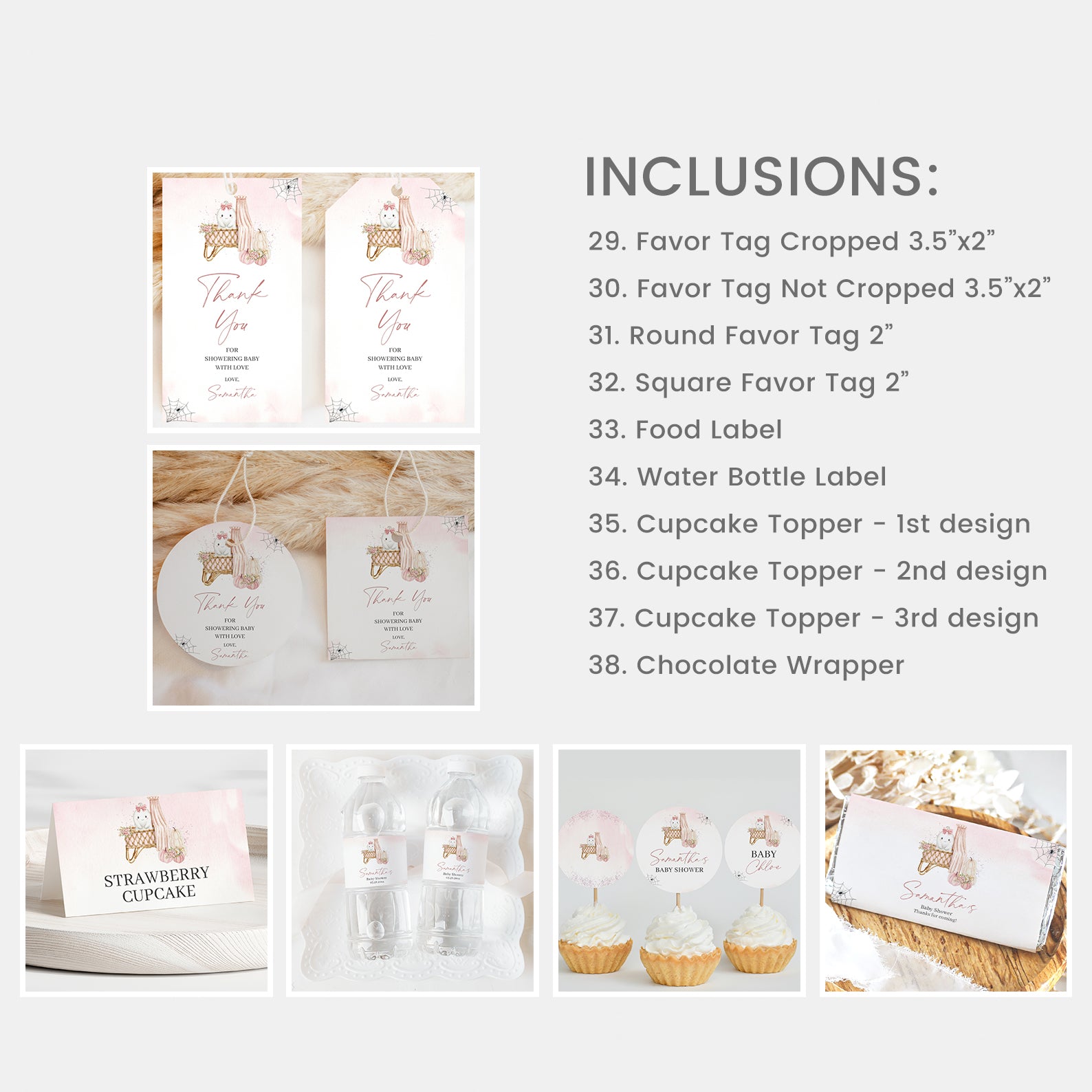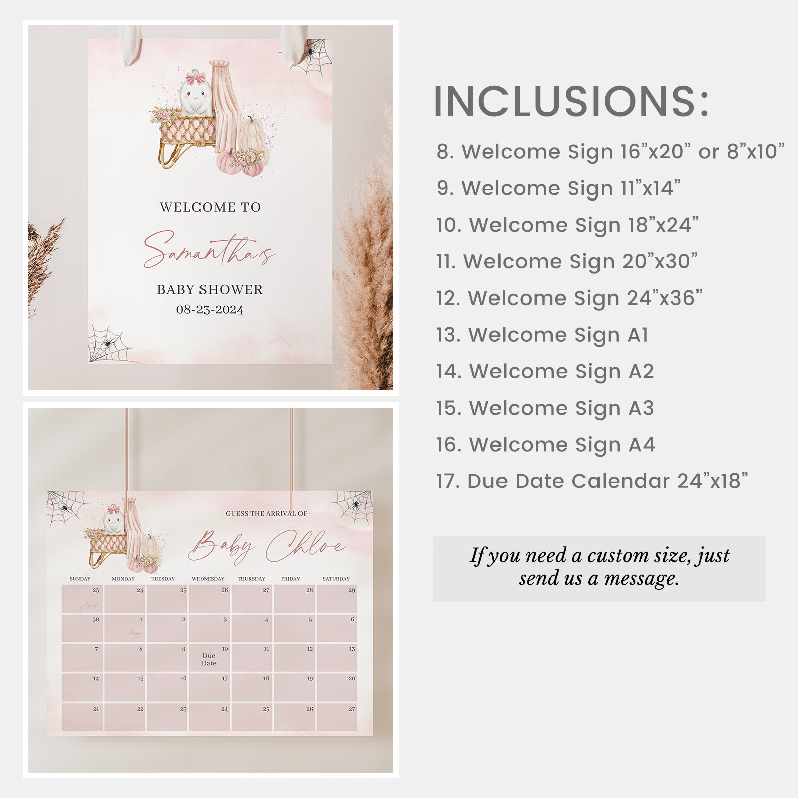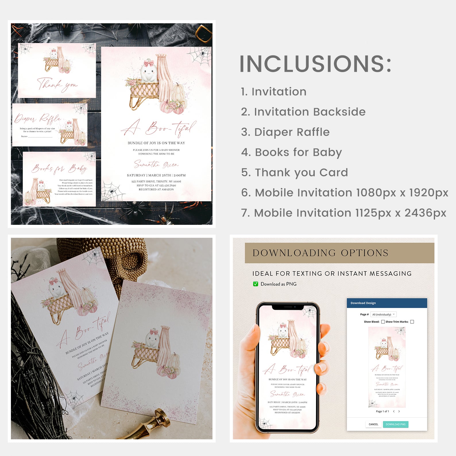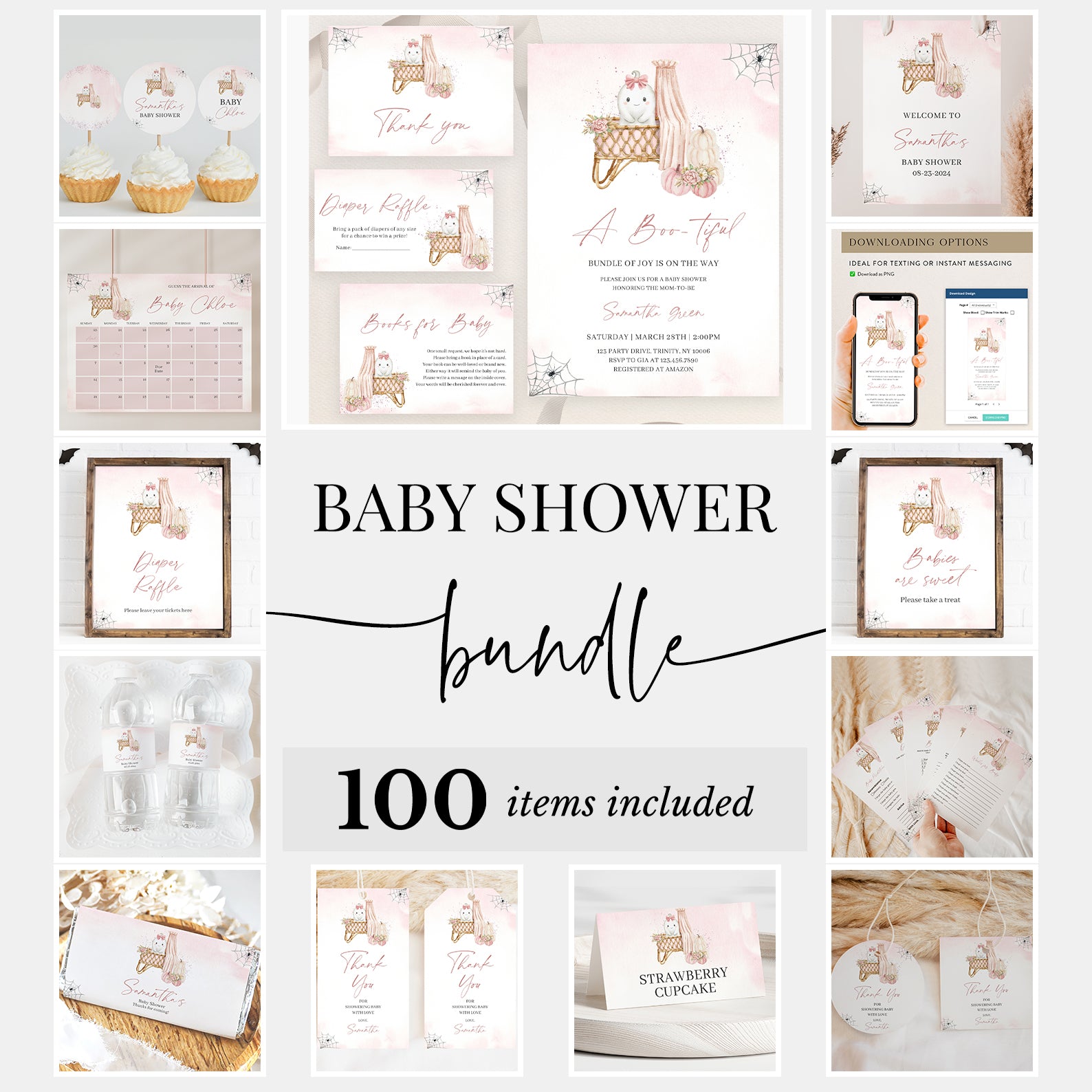 Celebrate your little boo in style with our Halloween Baby Shower Mega Bundle! Packed with 100 editable items, this pastel-themed set includes invitations, thank you cards, favor tags, games, and more. Featuring a sweet ghost in a pink ribbon, a floral-adorned baby crib with canopy, and soft pink pumpkins with delicate spiderweb accents, it blends spooky charm with cozy baby elegance. Perfect for your fall celebration!
