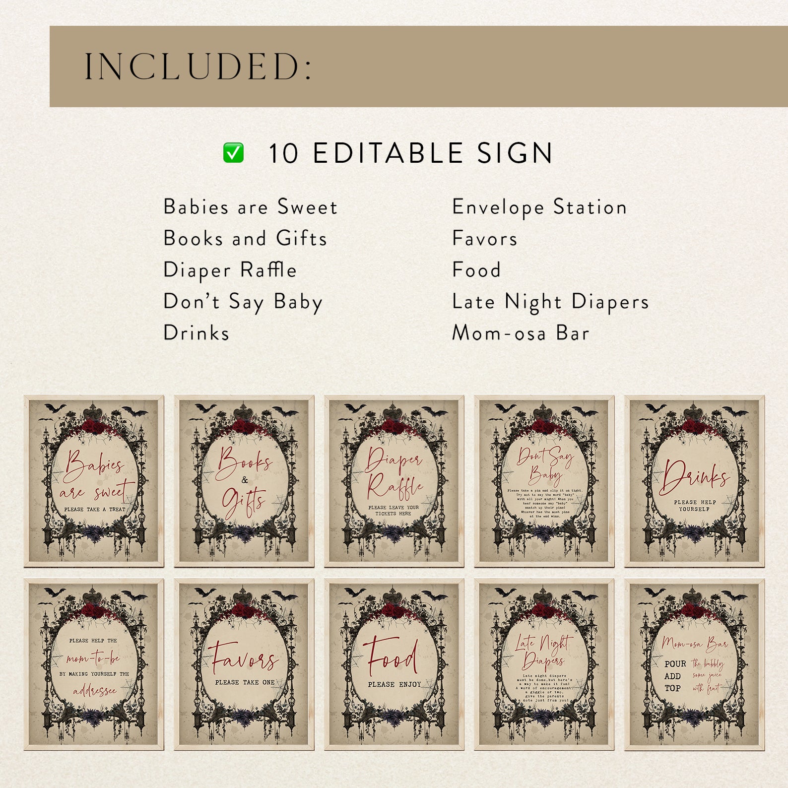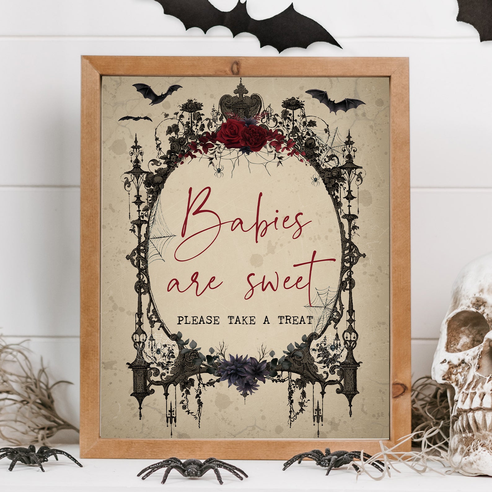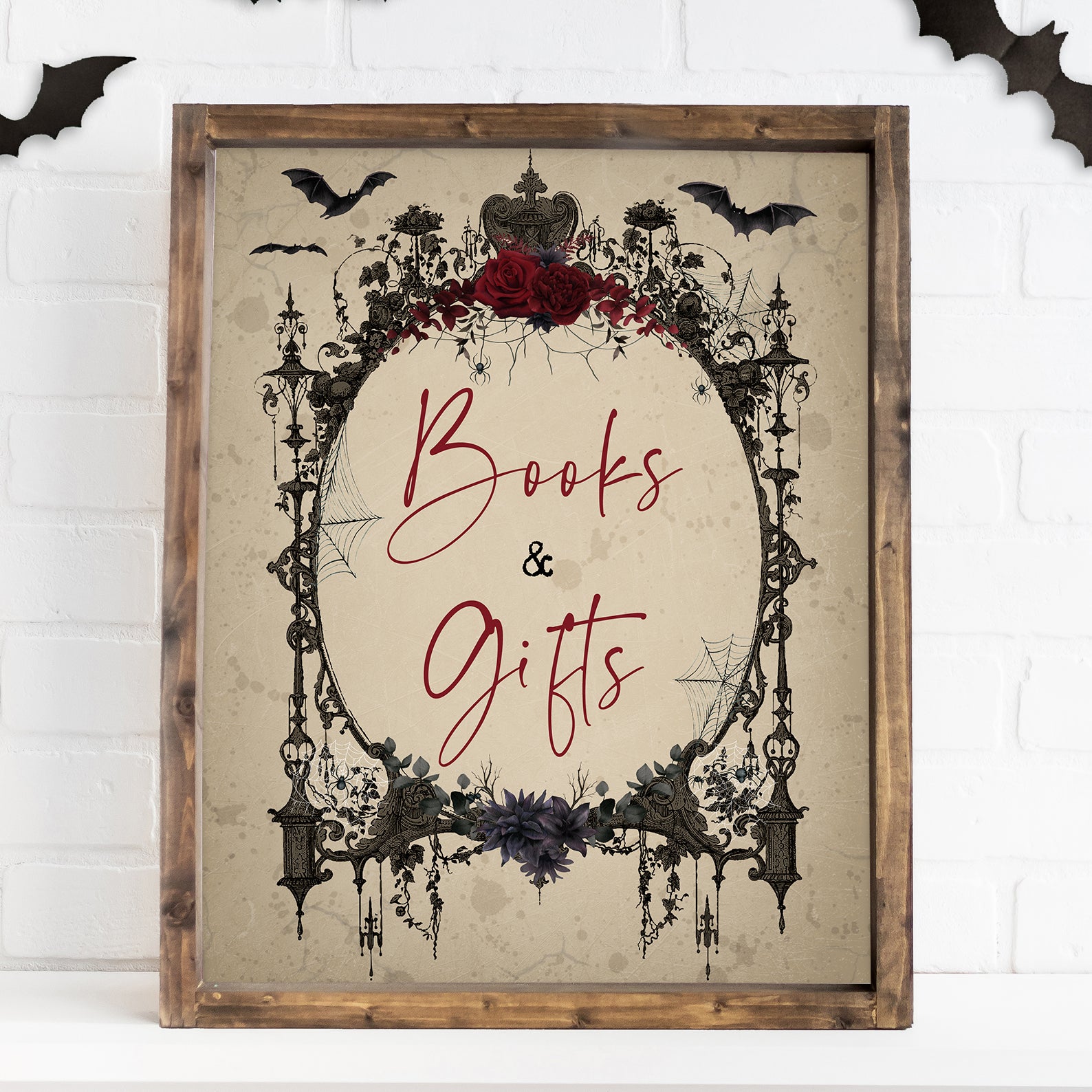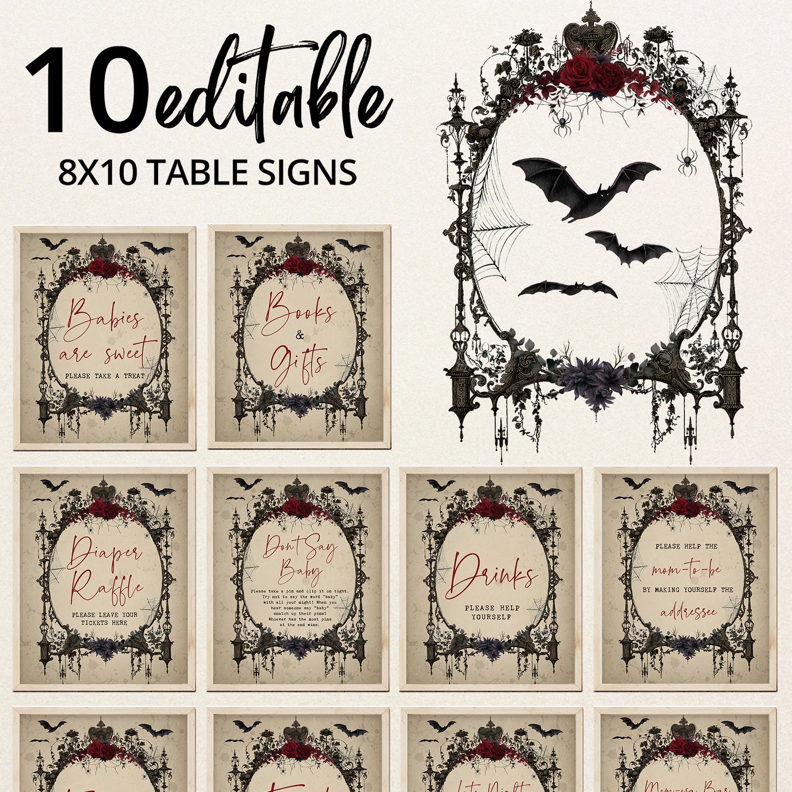 Enhance your baby shower with our gothic-themed table sign! Featuring a haunted light brown background with flying bats and elegant purple or red roses, this sign adds a touch of vintage charm and mystery. It's perfect for creating a memorable and stylish atmosphere at your event.