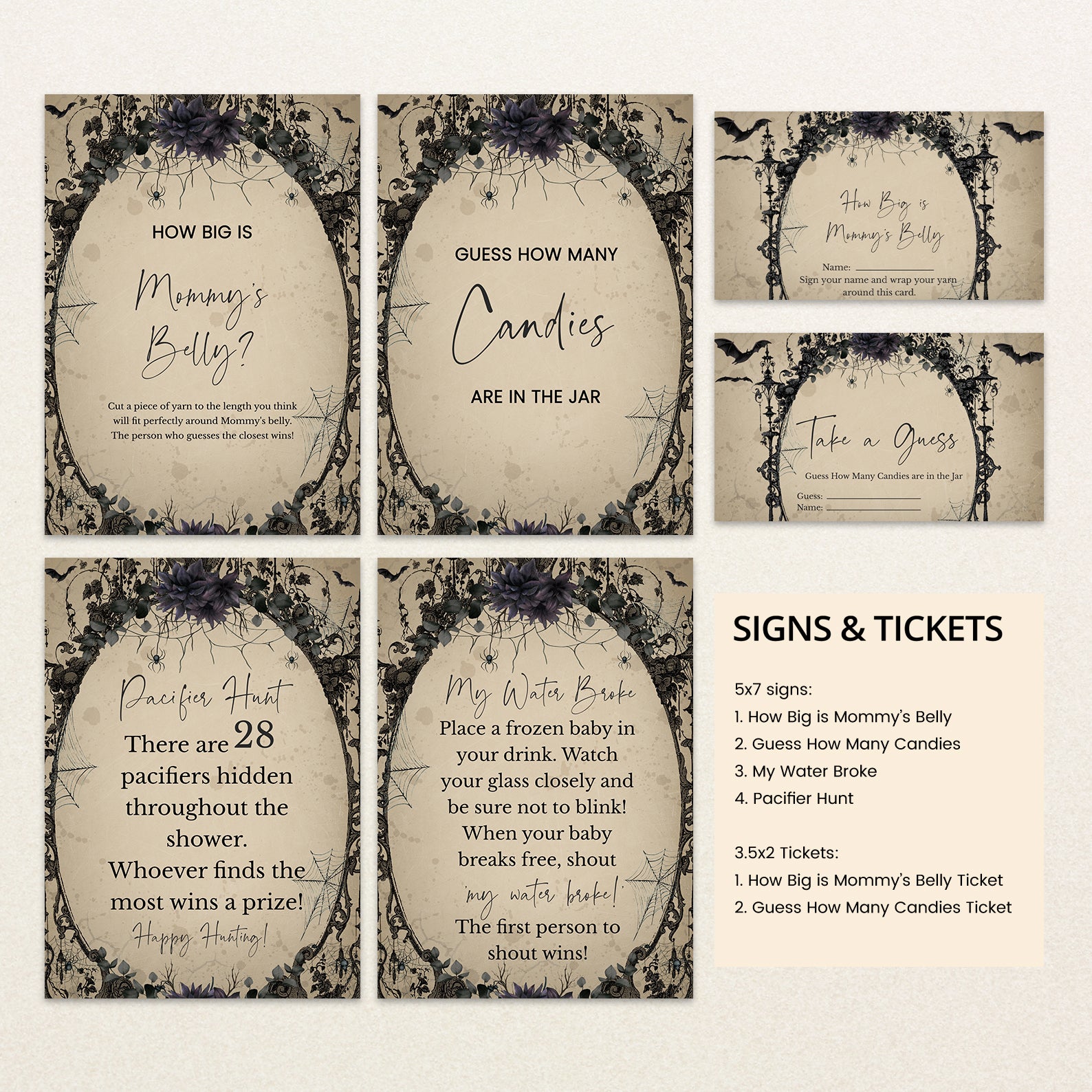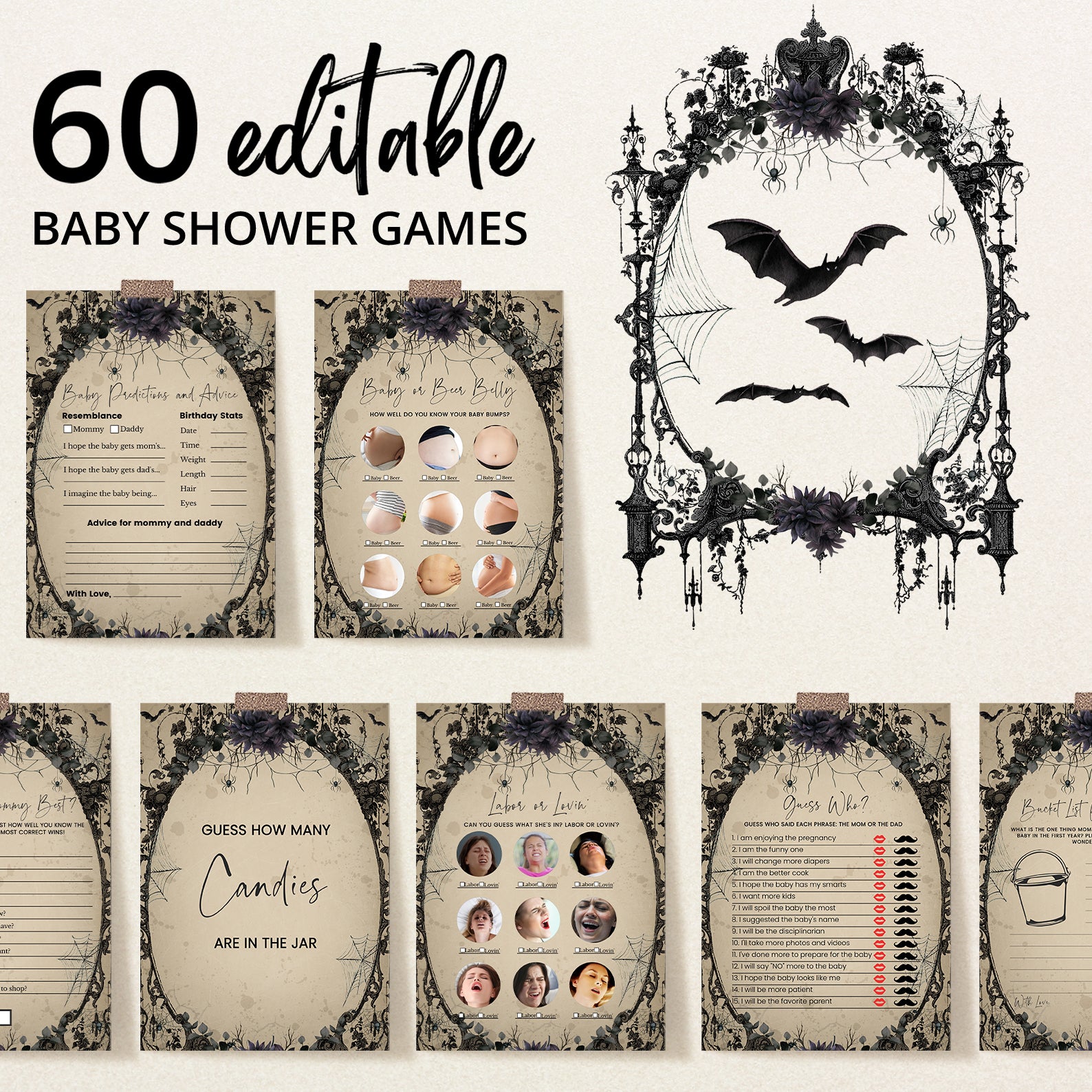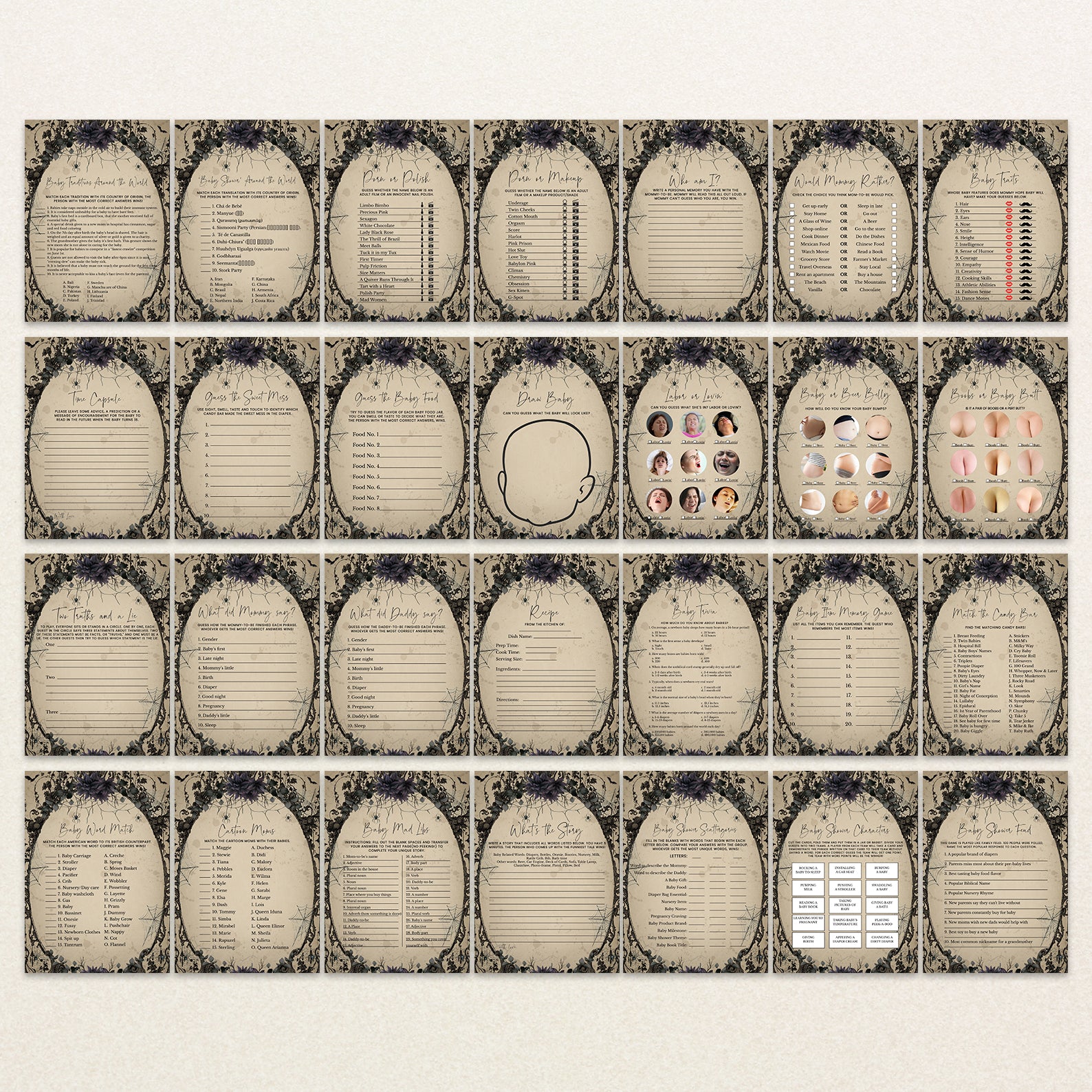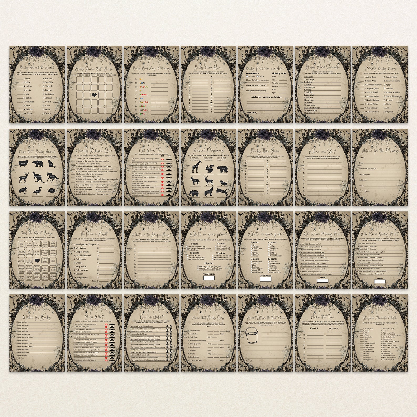 Elevate your baby shower with a touch of gothic charm using our “Vintage Gothic Halloween Game Bundle!” This set of editable games features a unique and spooky design, set against a hauntingly elegant light brown background with flying bats. Enhanced with a selection of purple and red roses, each game adds an extra layer of sophistication and mystery to your celebration. Perfect for parents-to-be seeking a stylish and memorable event, this bundle ensures a one-of-a-kind experience filled with engaging activities and enchanting details. Get ready to create a bewitching atmosphere that will delight your guests and make your baby shower truly unforgettable!