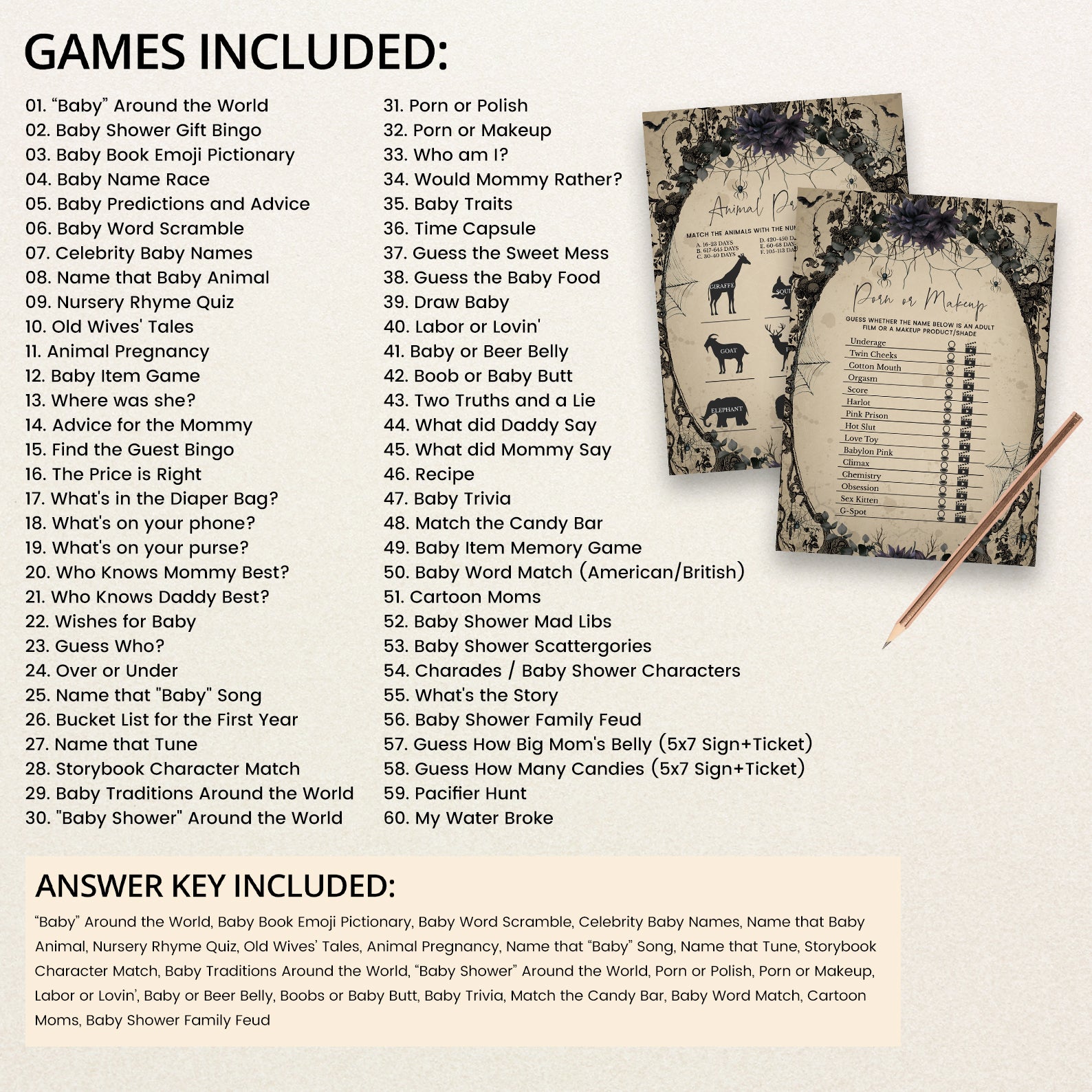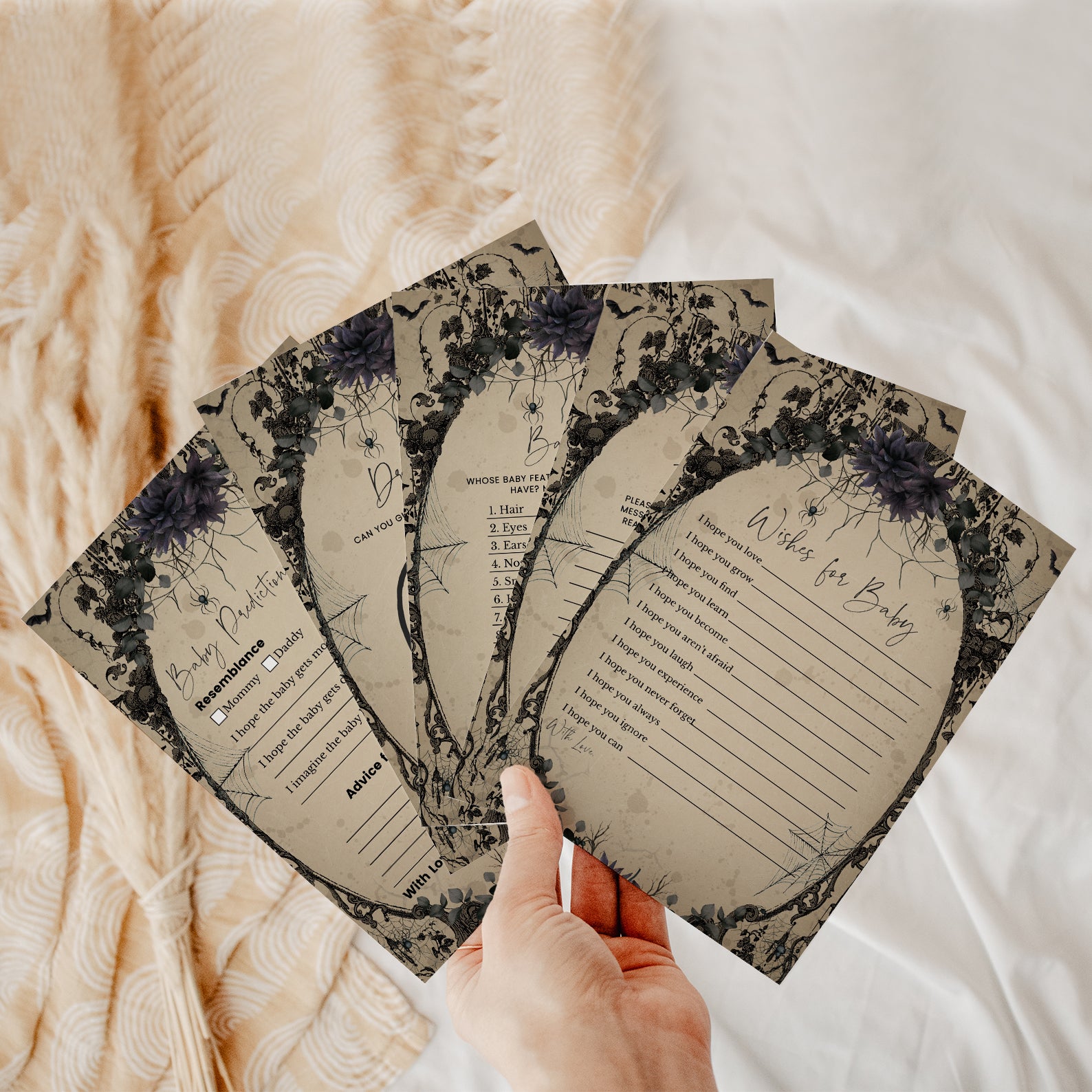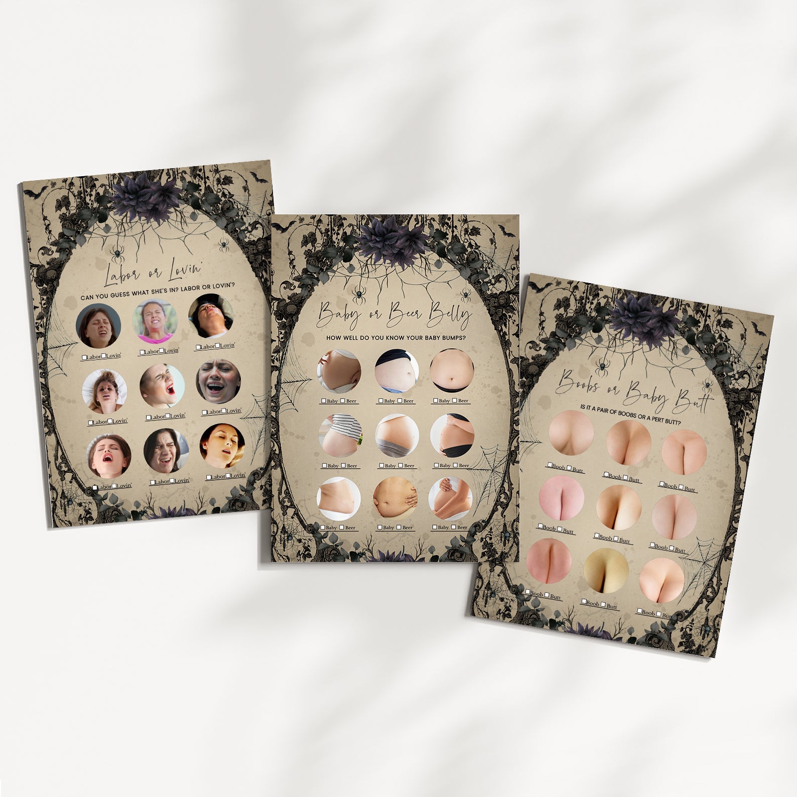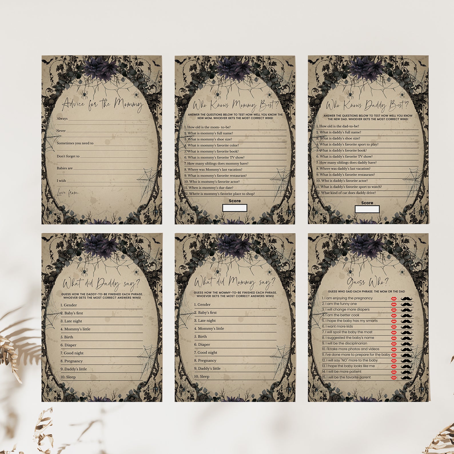 Elevate your baby shower with a touch of gothic charm using our “Vintage Gothic Halloween Game Bundle!” This set of editable games features a unique and spooky design, set against a hauntingly elegant light brown background with flying bats. Enhanced with a selection of purple and red roses, each game adds an extra layer of sophistication and mystery to your celebration. Perfect for parents-to-be seeking a stylish and memorable event, this bundle ensures a one-of-a-kind experience filled with engaging activities and enchanting details. Get ready to create a bewitching atmosphere that will delight your guests and make your baby shower truly unforgettable!