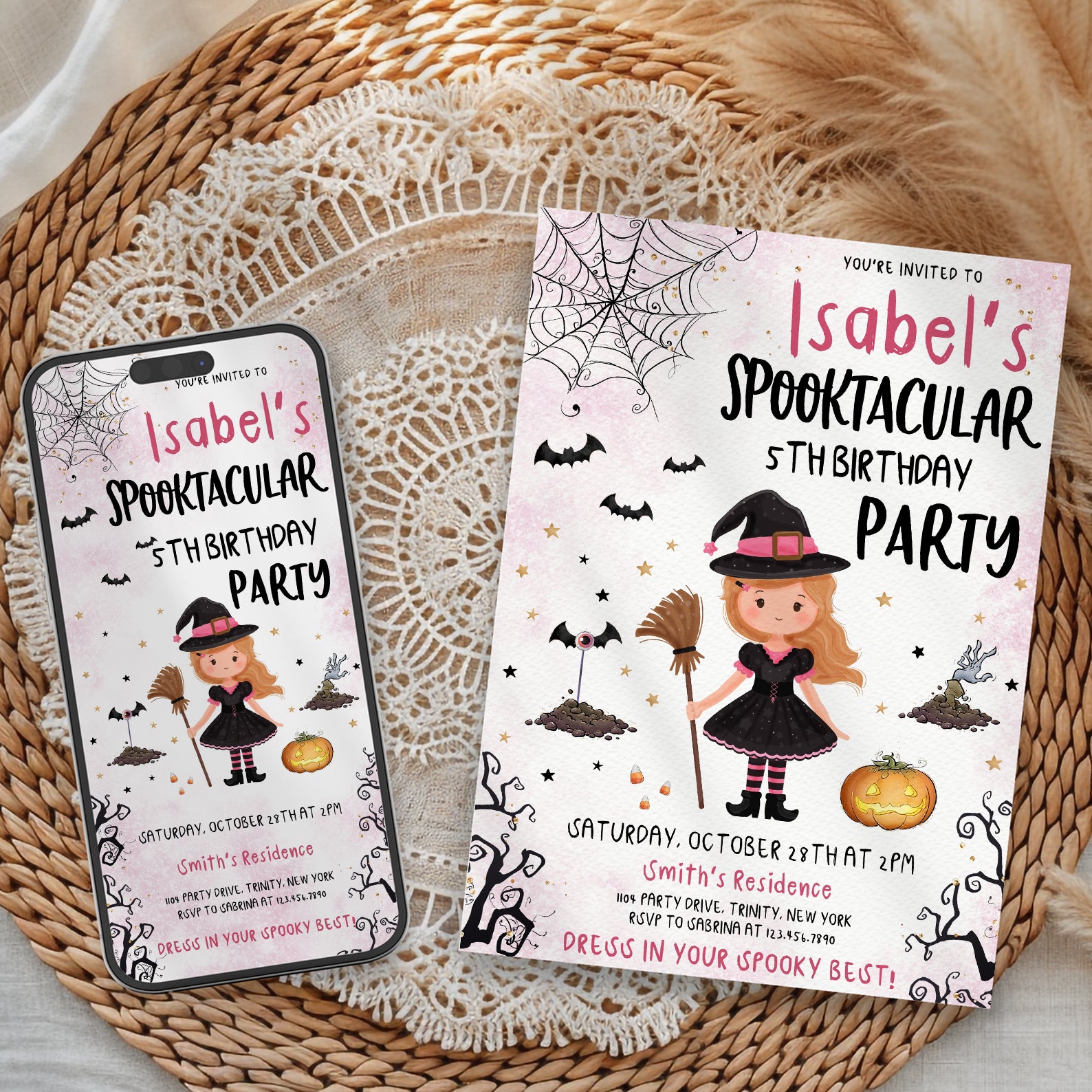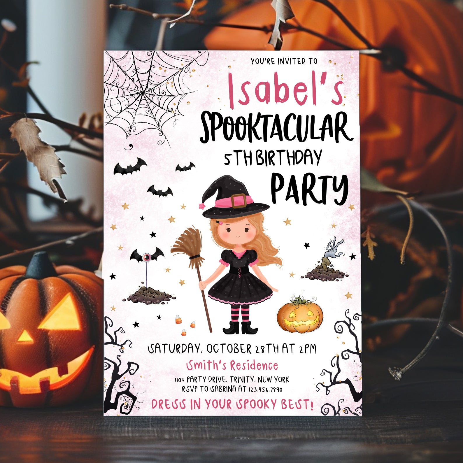 5th Halloween Birthday Invite: Pink Witch Party for Girls