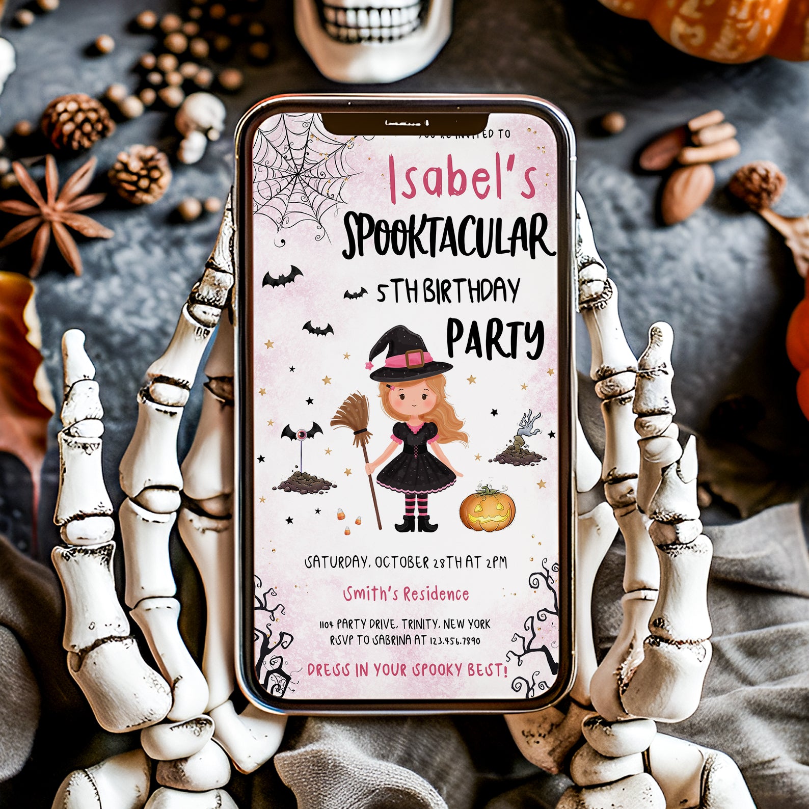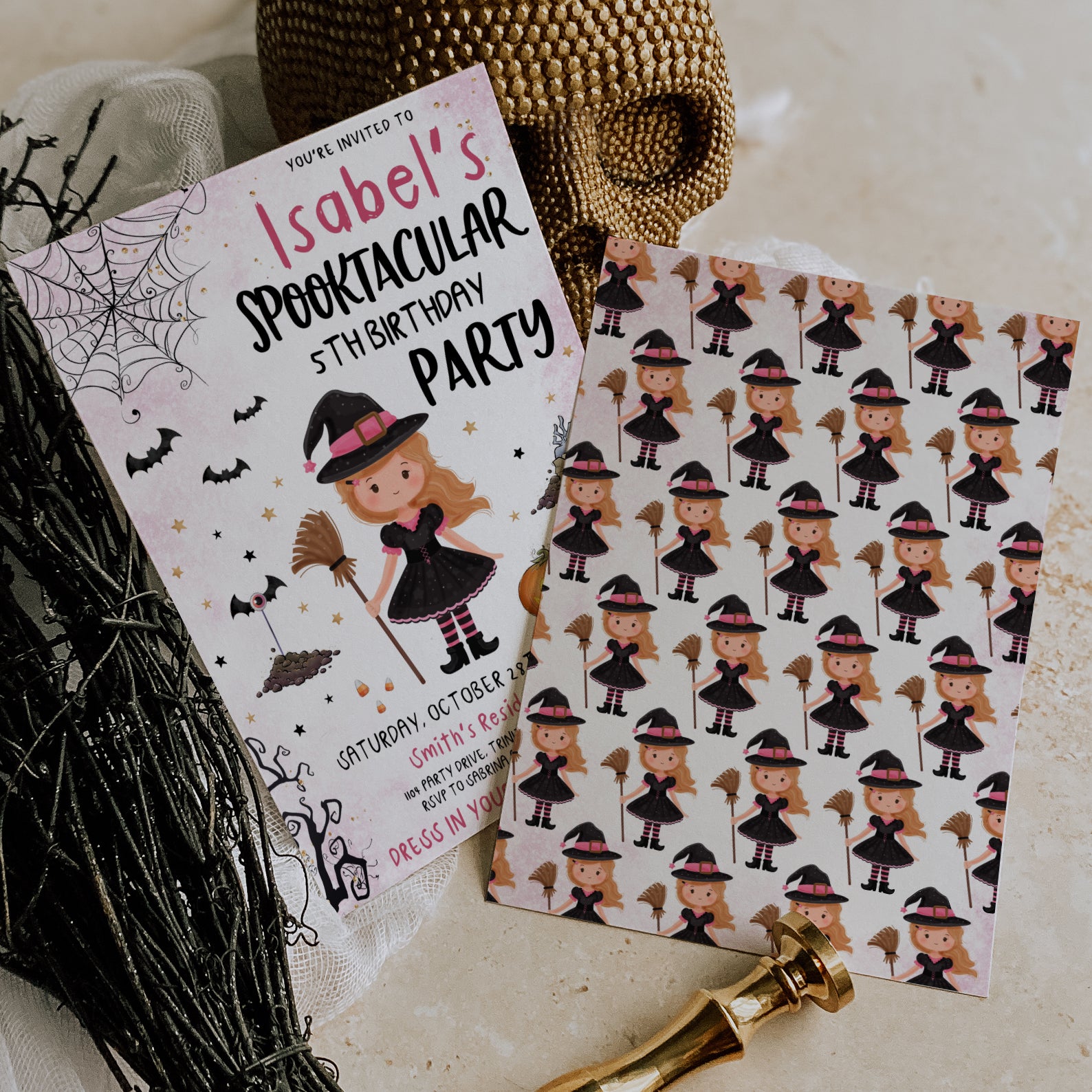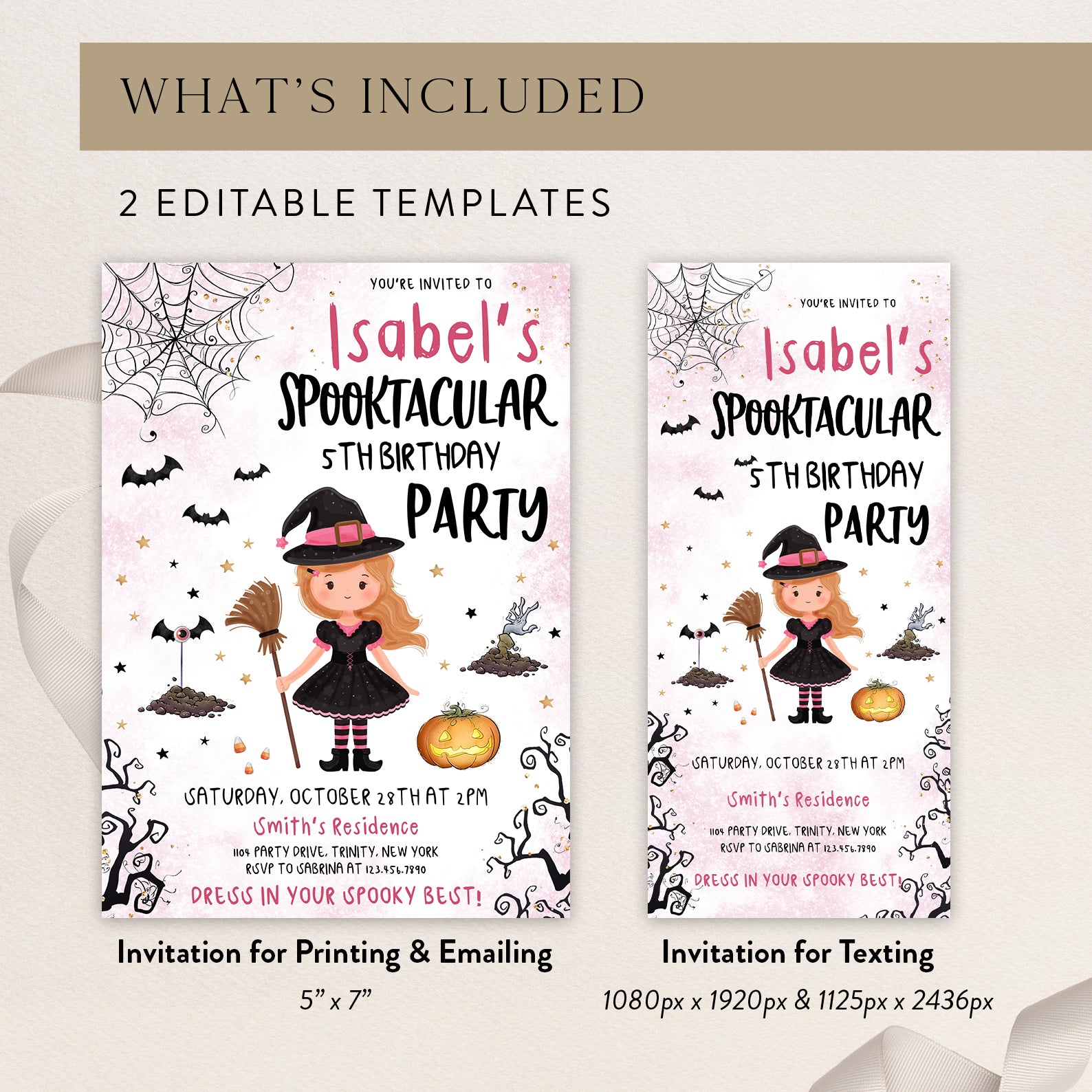 - Purchase this 5th Halloween Birthday Invite: Pink Witch Party for Girls template