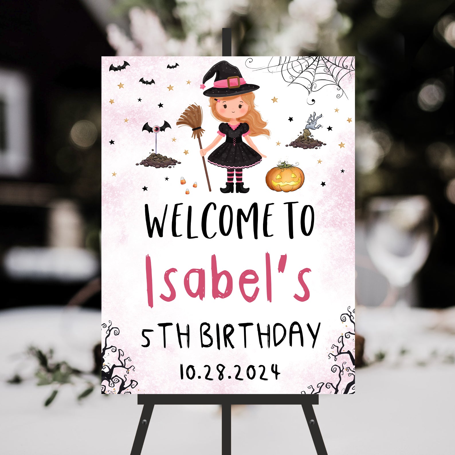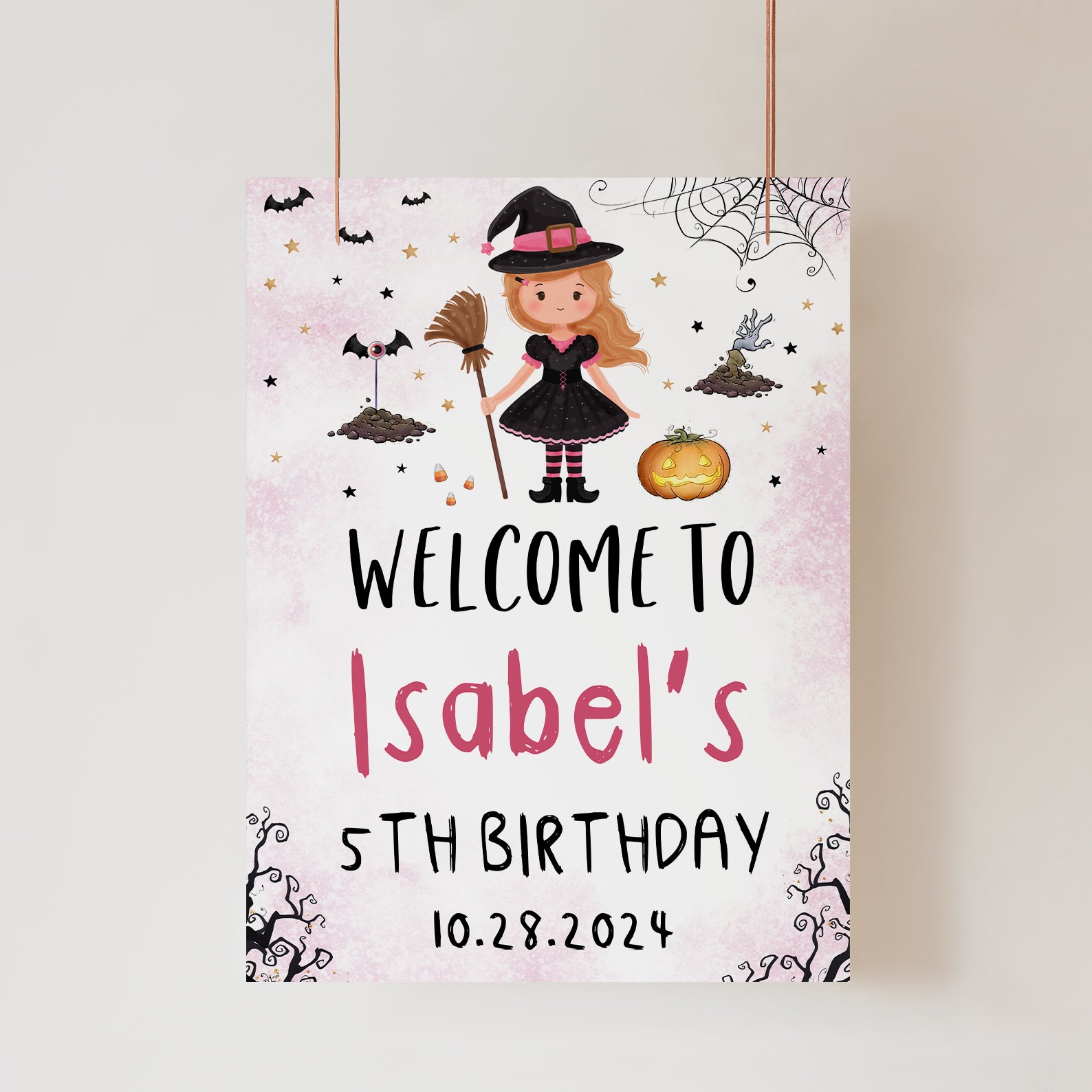 - Purchase this 5th Halloween Birthday Welcome Sign: Pink Witch Party for Girls template